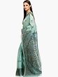 The charm of this sari lies in the painstaking detail of its hand-painted motifs. The pallu and border are adorned with a captivating array of figures, including stylized peacocks, floral arrangements, and geometric patterns, all rendered in a harmonious palette of blues, greens, oranges, and earthy tones. Each brushstroke tells a story, imbuing the sari with a unique character and soul. The delicate floral scattering across the body of the sari adds a subtle yet enchanting detail, creating a beautiful balance between the bold border and the understated expanse. Wearing this sari is an invitation to experience the beauty of traditional Indian art in its most luxurious form.