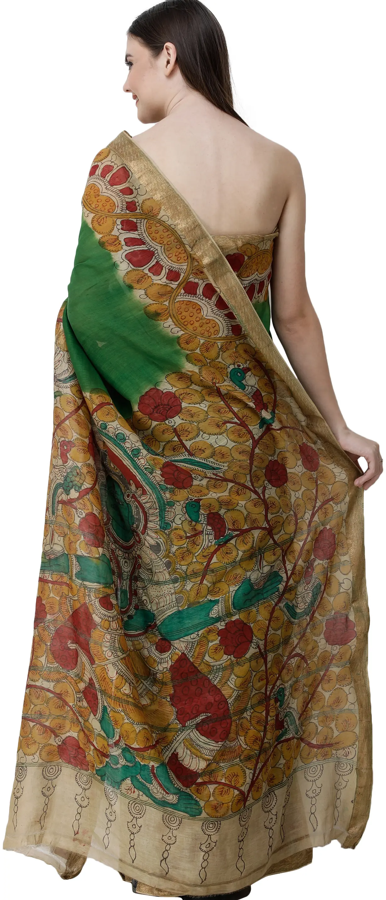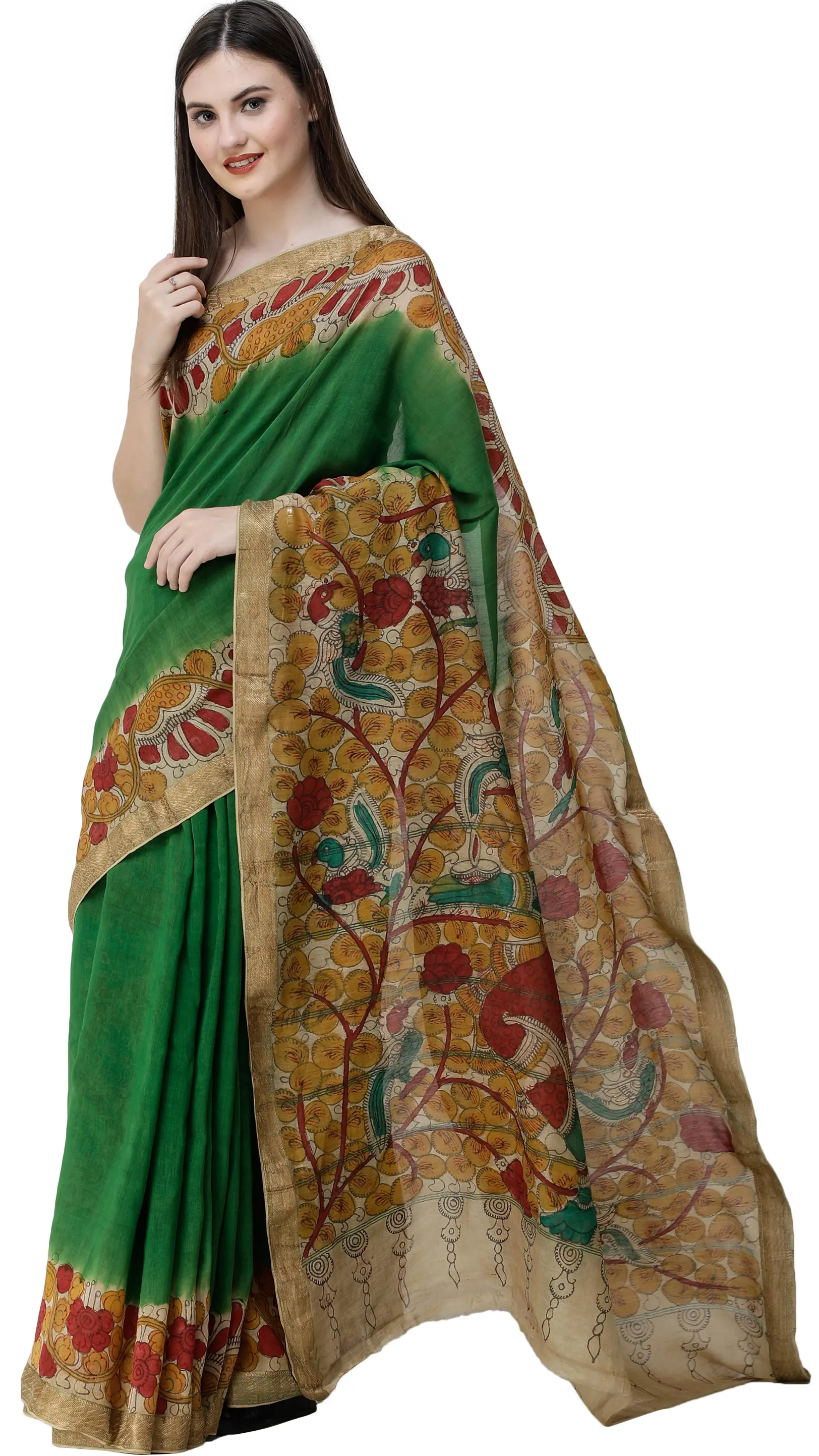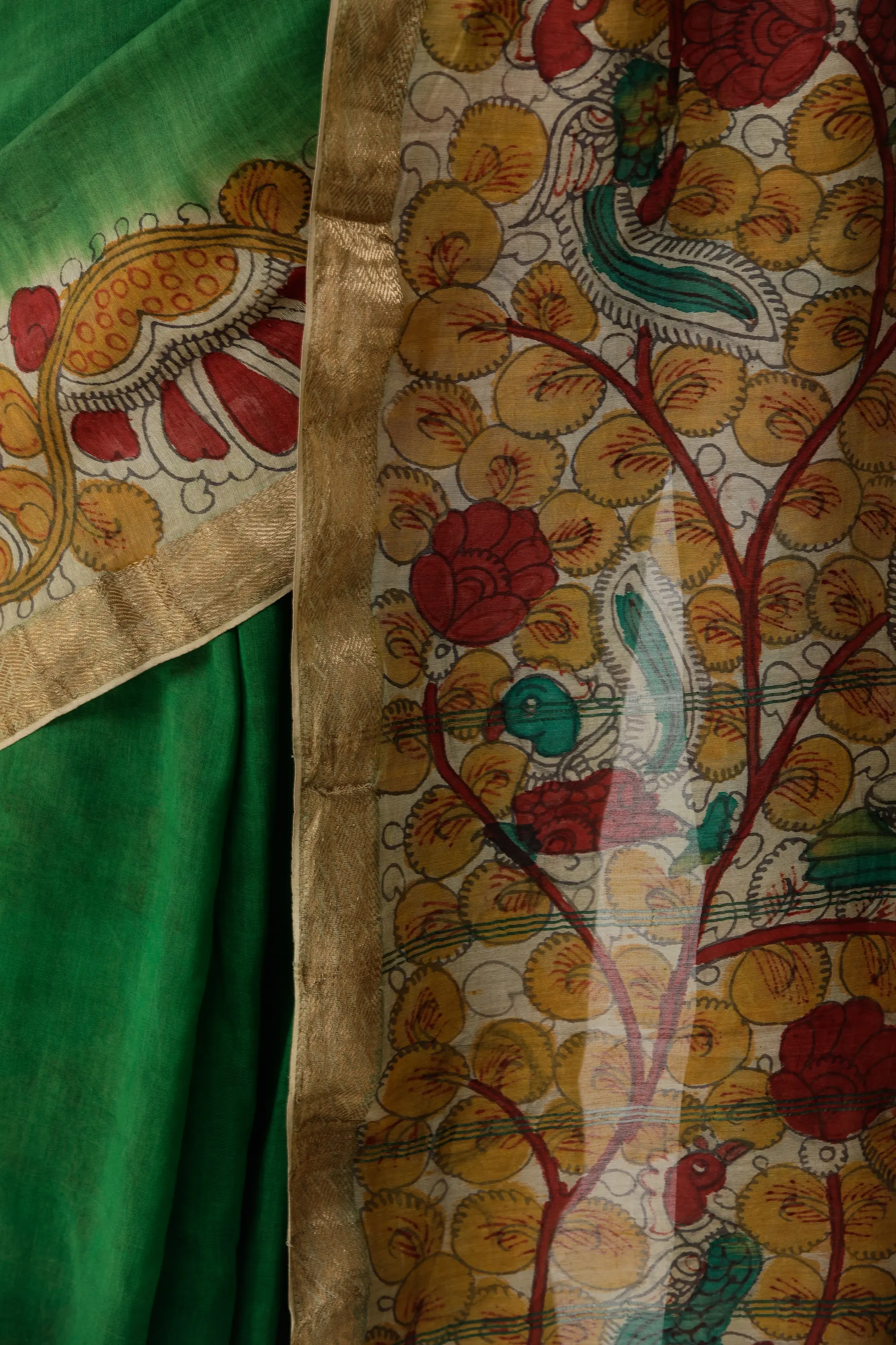 The Fairway-Green Kalamkari Sari from Telangana is a tapestry of auspiciousness and the celebration of life. Green, the reigning hue, symbolizes renewal and vitality, crafting an eye-catching attire. Kalamkari art narrates lovely tales on the drape, adding depth and meaning to its design. The centerpiece, a depiction of a Goddess holding diyas on the anchal, is a mesmerizing presence that illuminates the saree with divine grace. This unique drape isn't just clothing; it's a canvas of tradition and spirituality, where the resplendent green and captivating artistry come together to create a piece that tells stories, captures hearts, and celebrates life itself.