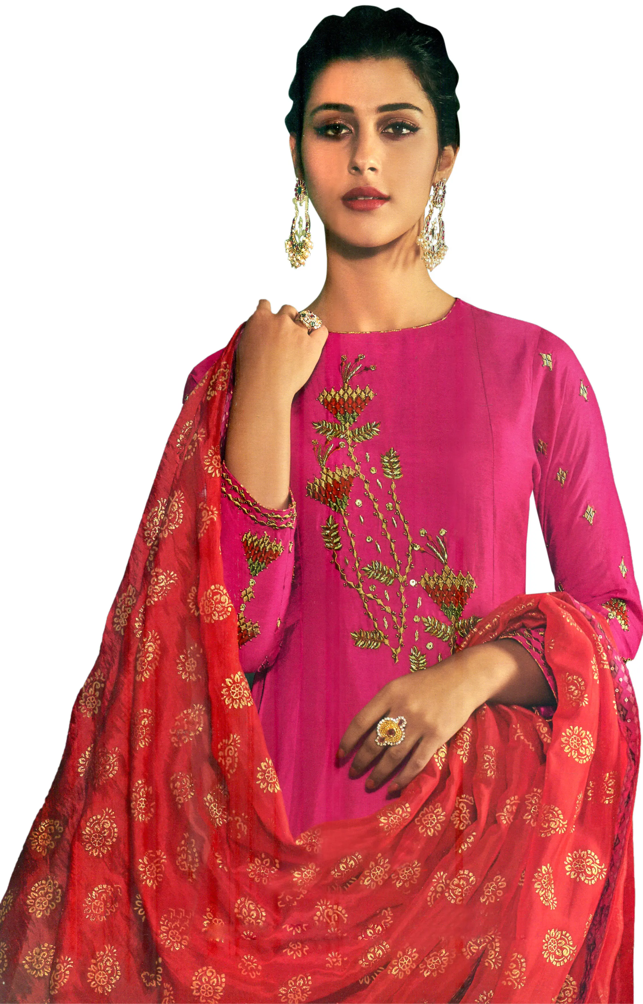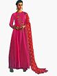 Embrace timeless style with this exquisite floor-length A-line suit, a harmonious blend of vibrant color and intricate craftsmanship. The rich, deep pink hue of the silk fabric forms the base of this captivating ensemble, exuding an aura of sophisticated grace. Its A-line silhouette drapes beautifully, offering both comfort and a flattering fit for any occasion.