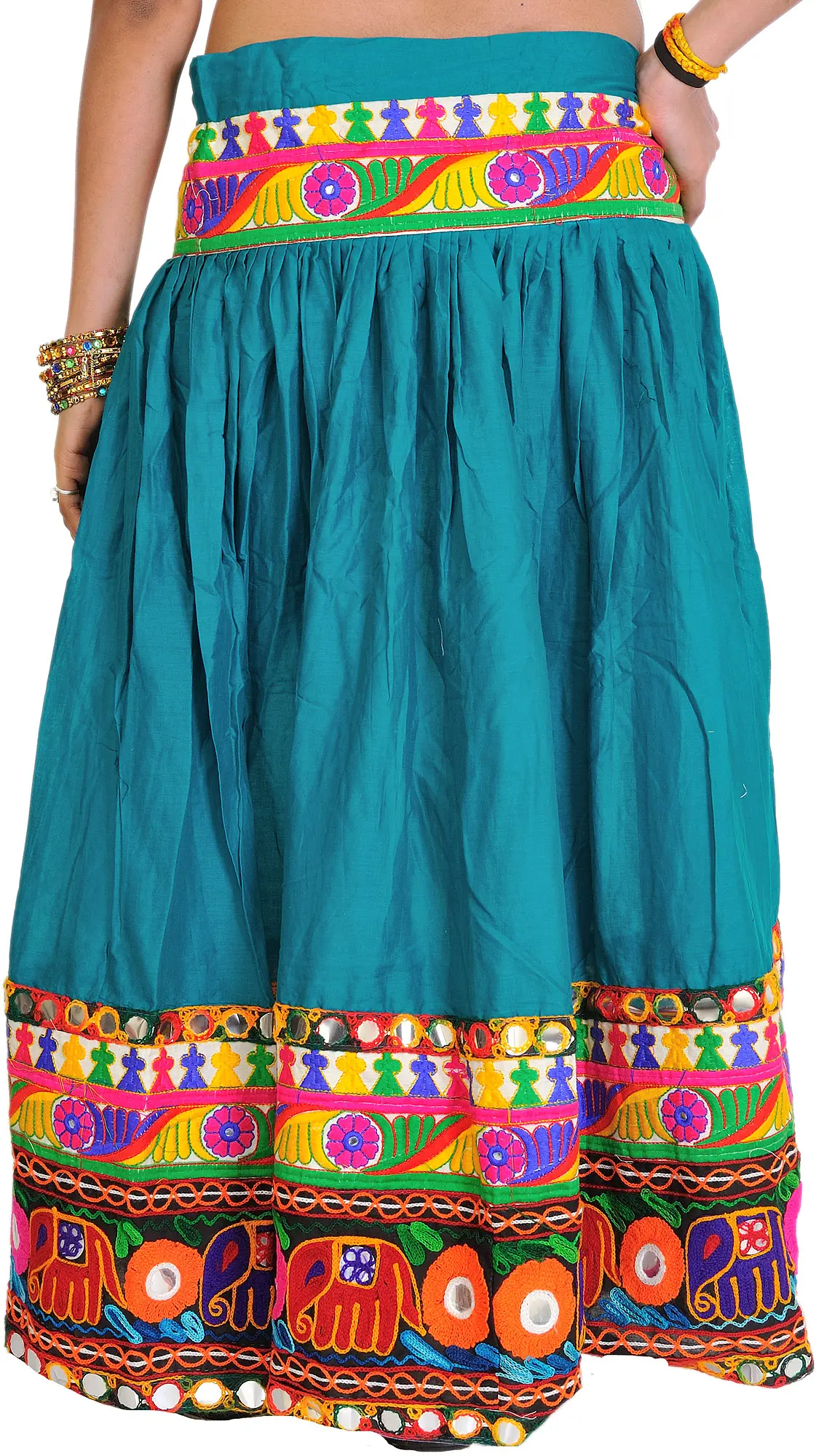 The true magic of this ghagra lies in its intricate embroidered patch border. Adorning both the hem and the waistband, these borders are a riot of color and traditional motifs. Each panel is meticulously stitched, showcasing a vibrant tapestry of patterns that tell stories of Gujarat's heritage. You'll find playful elephants, symbolic floral designs, and geometric patterns, all rendered in a spectrum of vivid threads. The addition of small, shimmering mirrors interspersed within the embroidery catches the light beautifully, adding a captivating sparkle and enhancing the overall festive appeal of the skirt. This detailed embellishment transforms the simple cotton fabric into a wearable work of art.