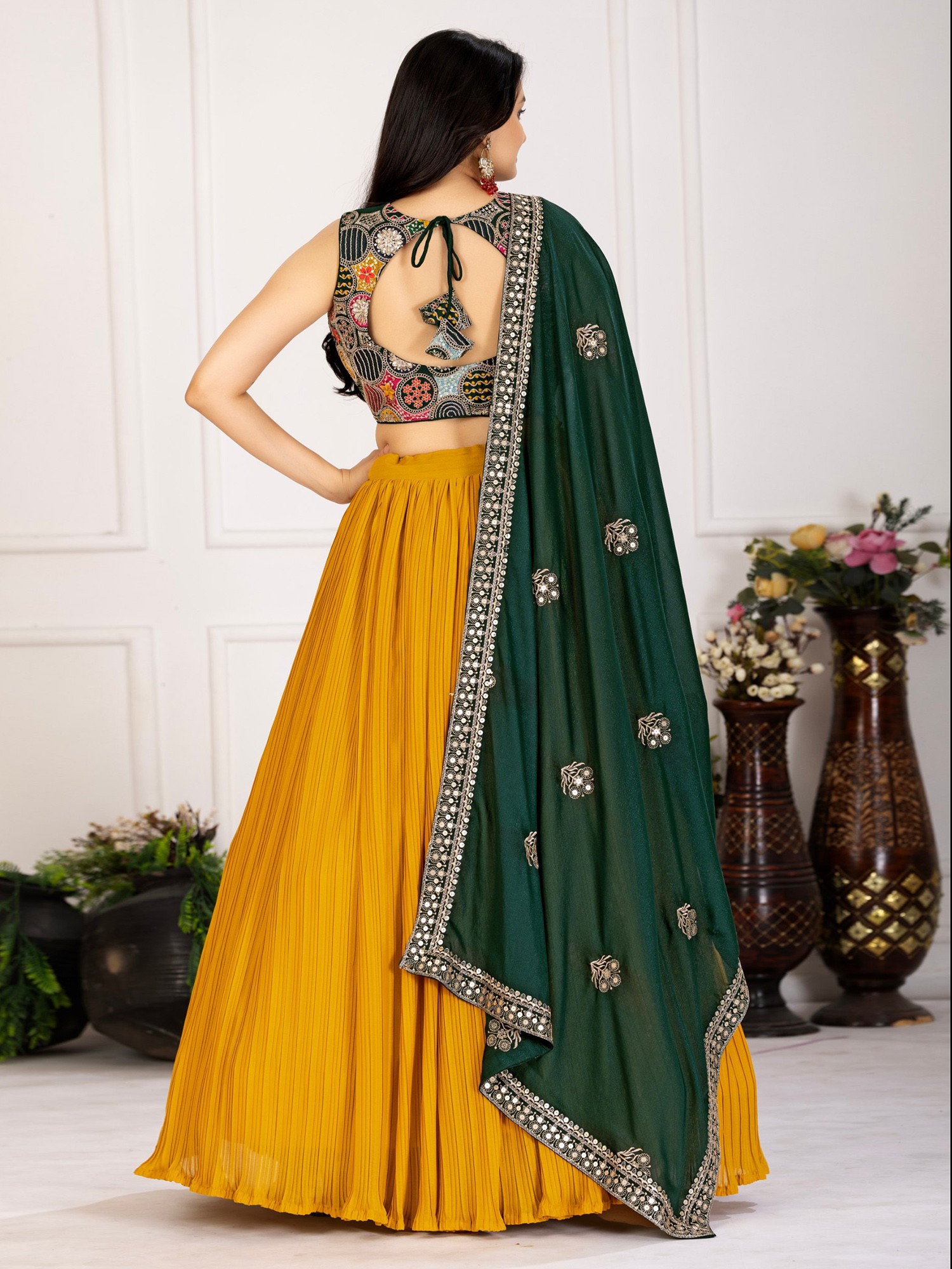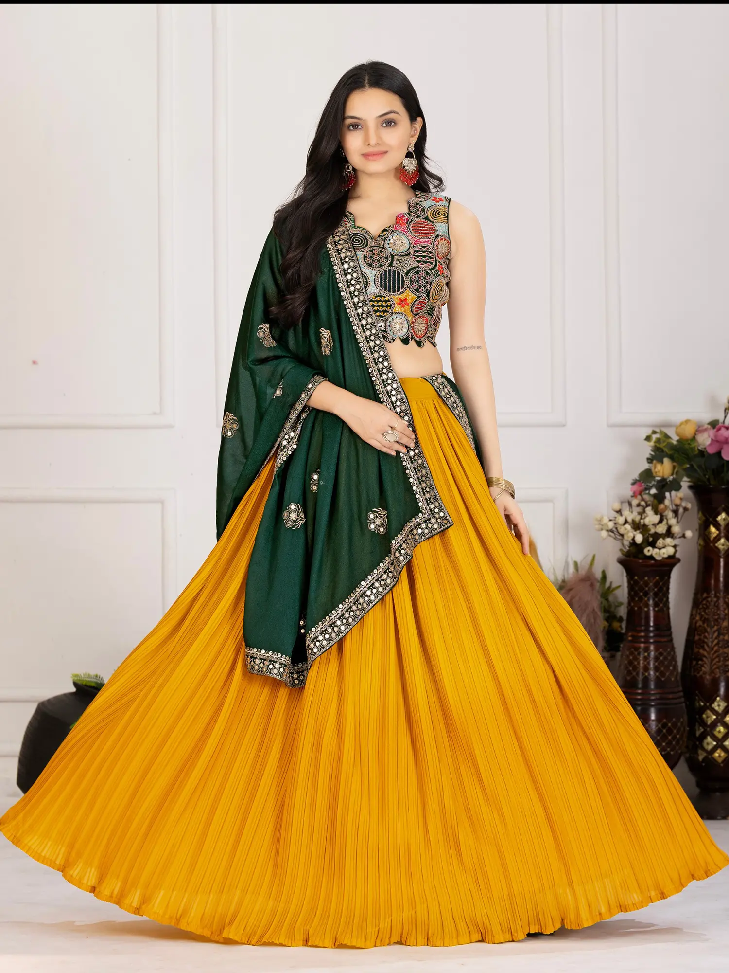 The Lehenga, a radiant spectacle of sunshine yellow, is adorned with fine, intricate pleating that adds depth and movement, creating a voluminous flare that dances with every step. This striking base is perfectly complemented by a richly embroidered choli, a masterpiece of artistic detail. The sleeveless choli bursts with a captivating medley of colors and patterns, featuring a unique blend of traditional motifs rendered in threads and embellishments. This detailed embroidery, showcasing meticulous craftsmanship, draws the eye and speaks volumes of its artisanal quality.