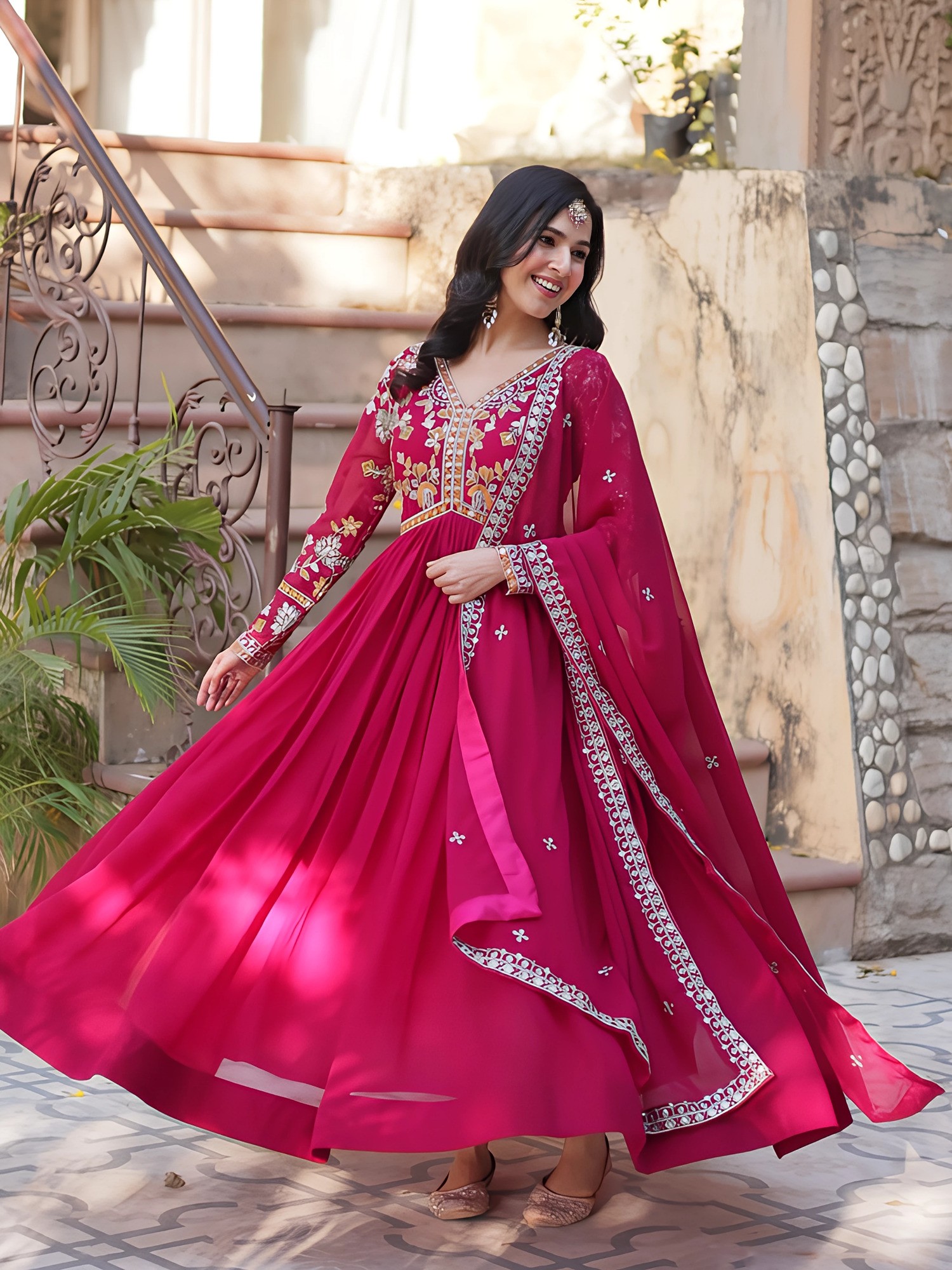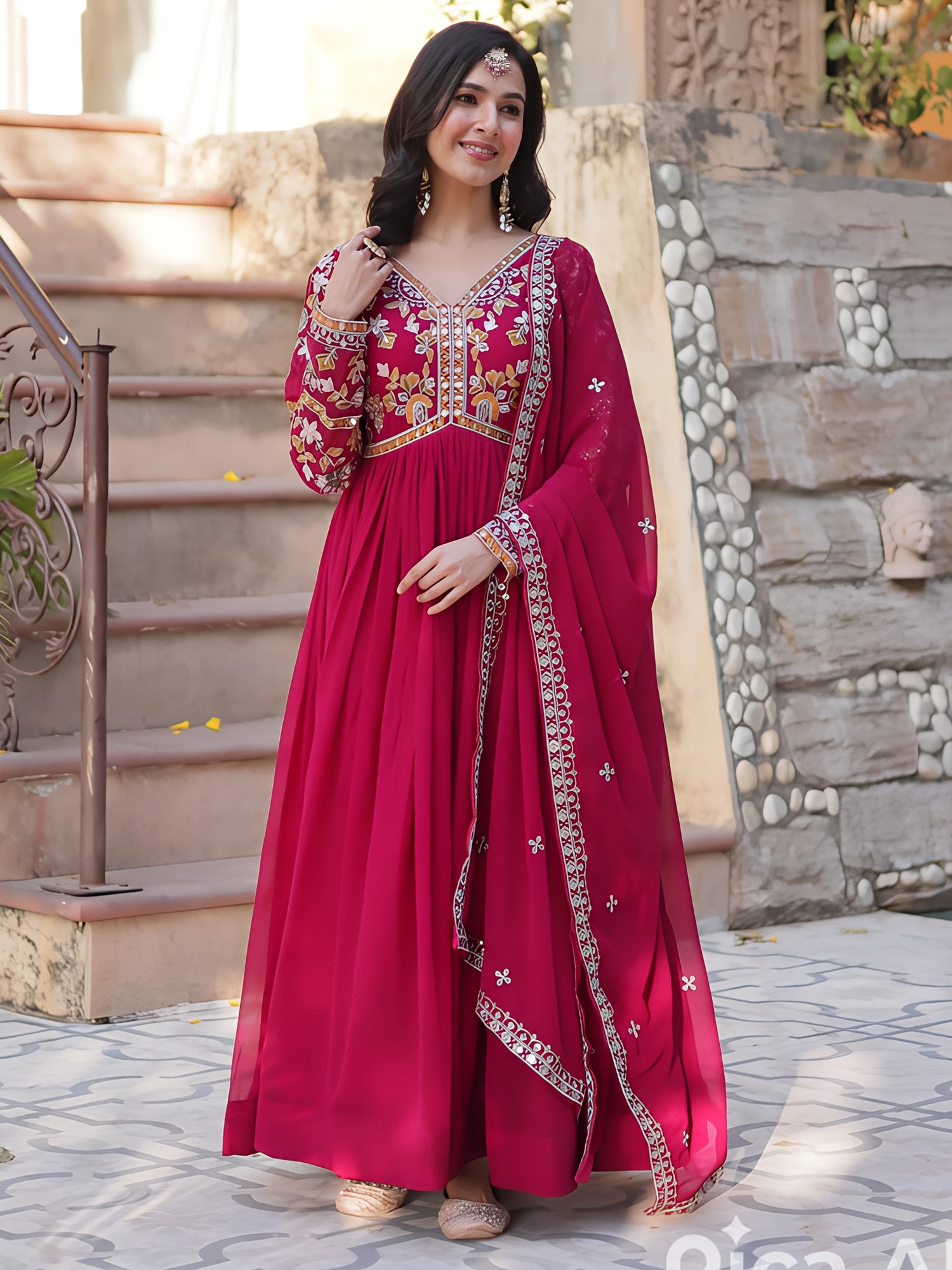 Faux Georgette Embroidery Zari Sequins Gown With Dupatta Party Wear Anarkali Style Long Ethnic Gown For Women