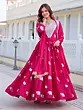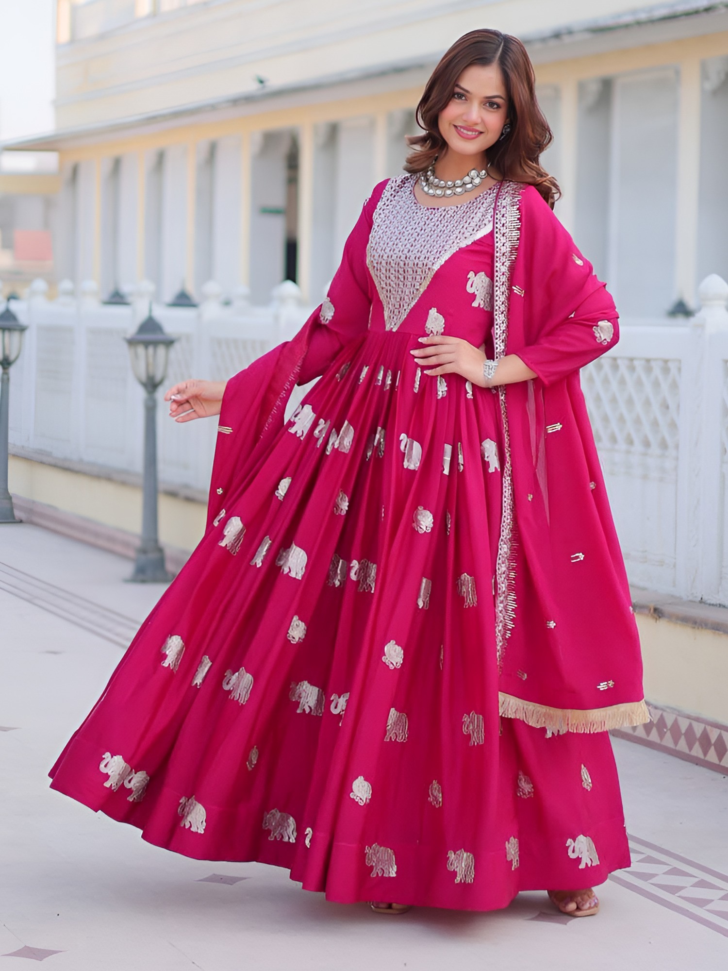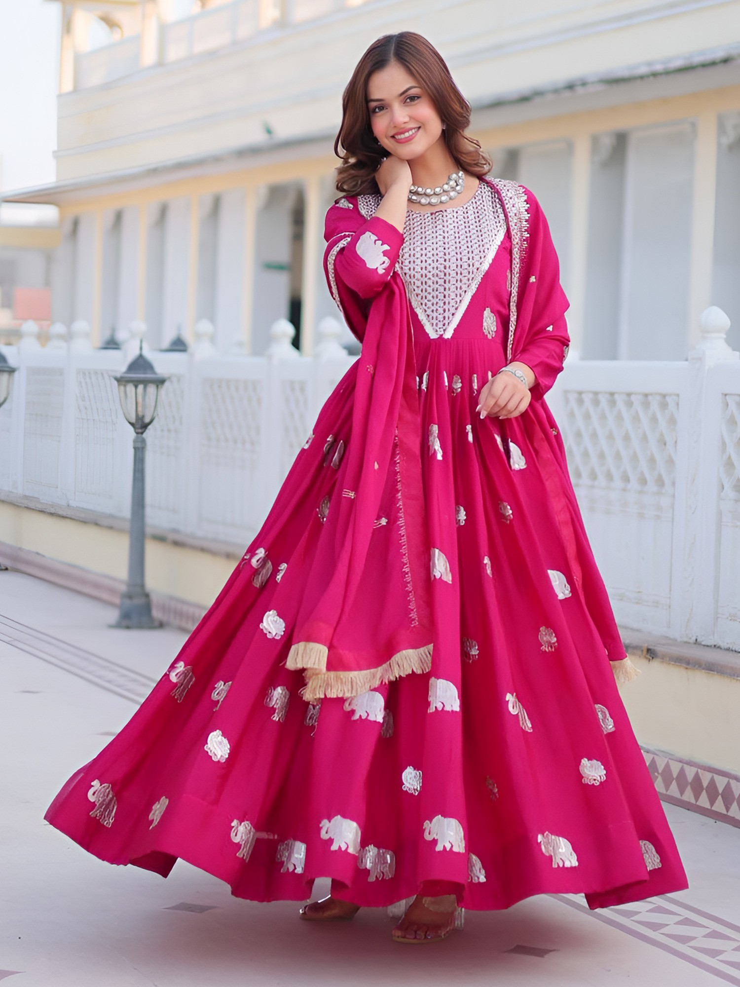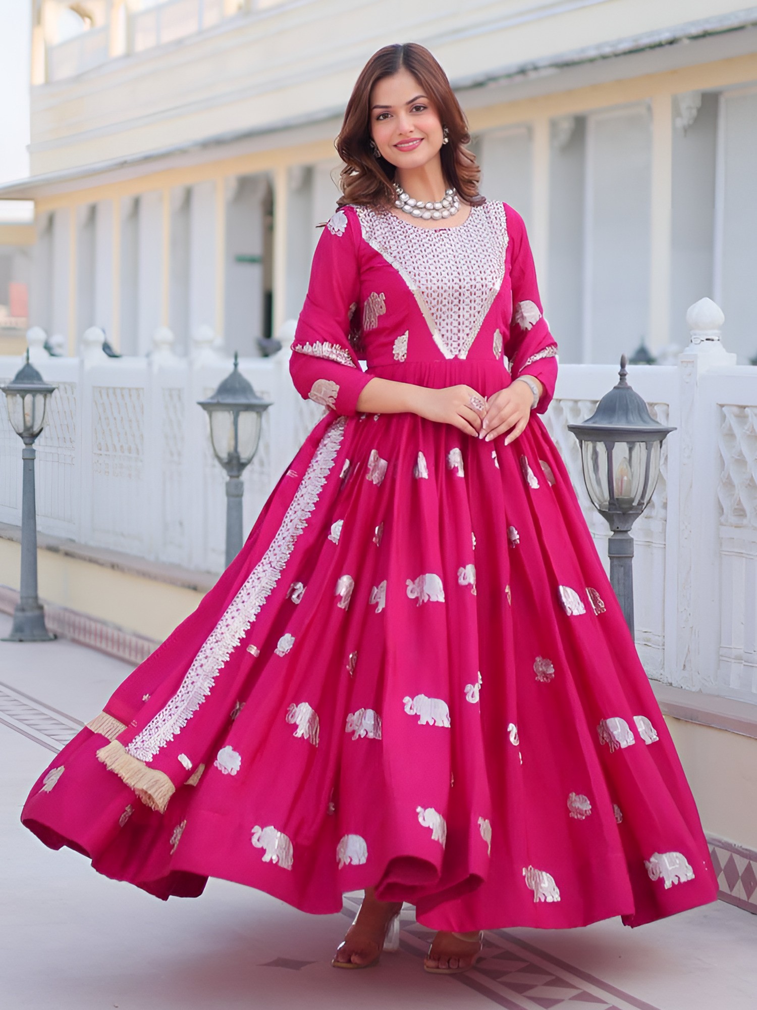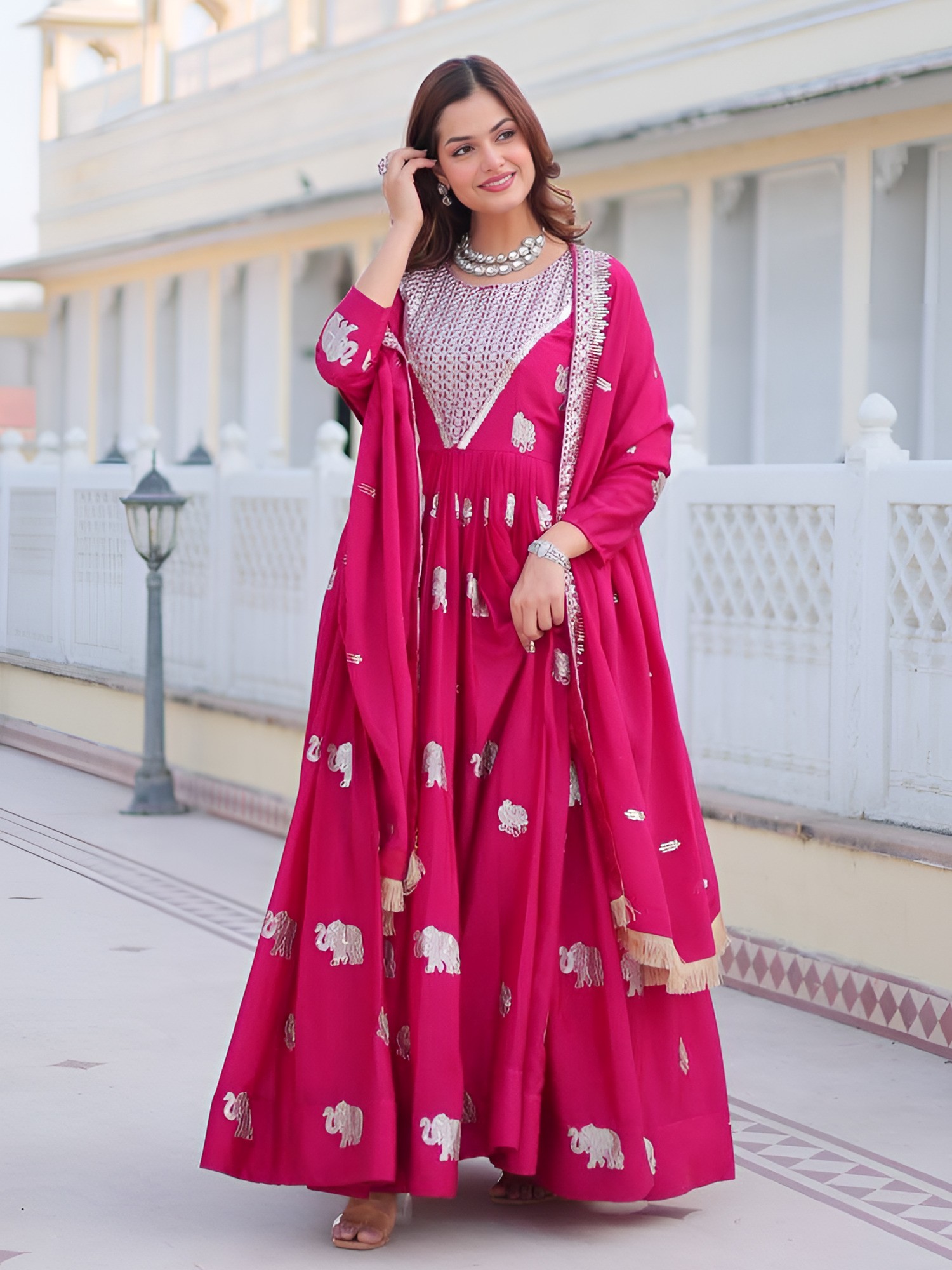 Step into the spotlight with this exquisite faux georgette gown, designed to make you the center of attention at any wedding, party, or festive occasion. The vibrant fuchsia hue is both captivating and sophisticated, exuding an aura of joyous celebration. Crafted from a lightweight and flowing faux georgette fabric, this gown drapes beautifully, creating a flattering silhouette that moves with grace. The luxurious feel of the material ensures comfort without compromising on style, making it perfect for long hours of celebration.