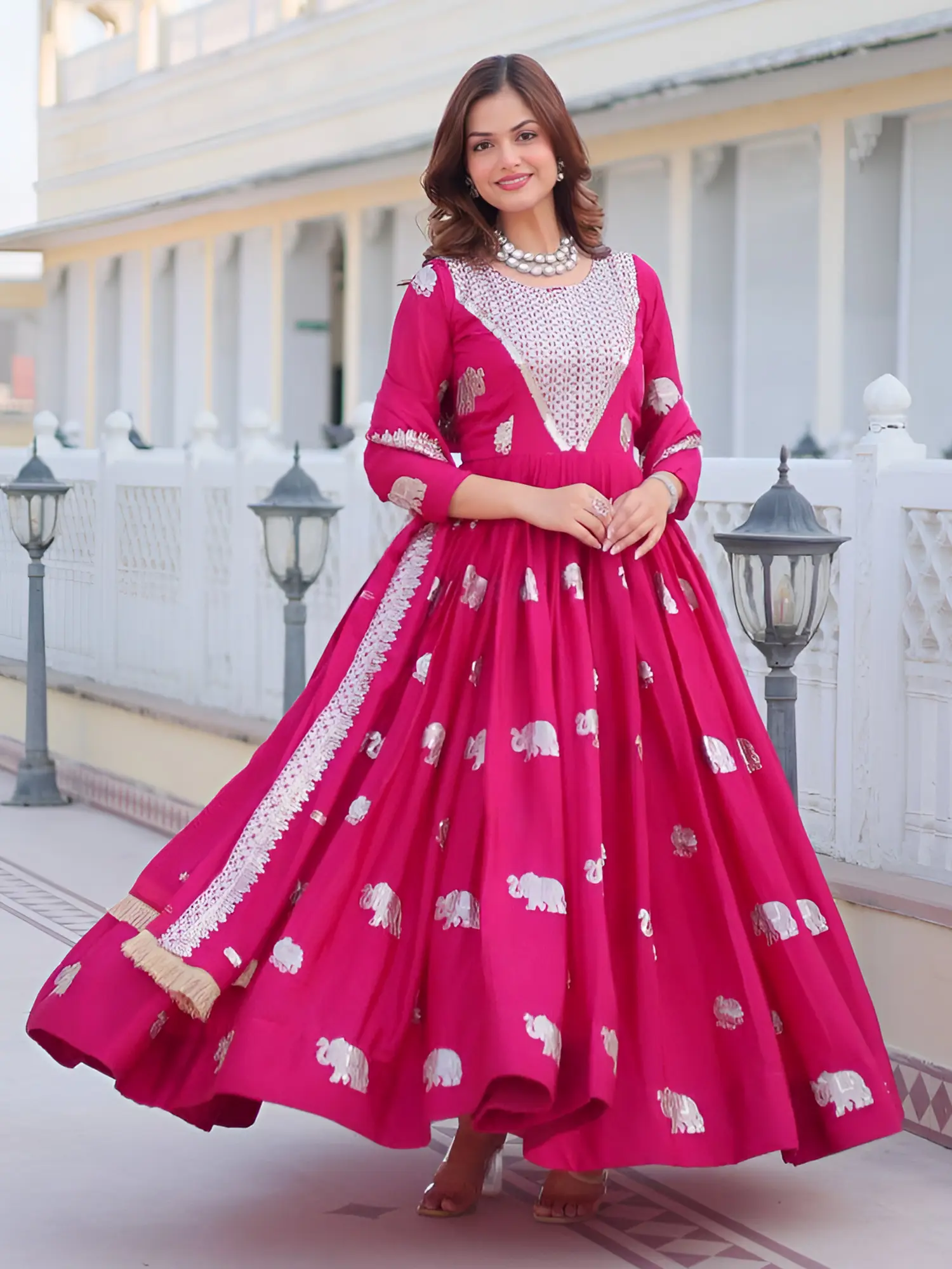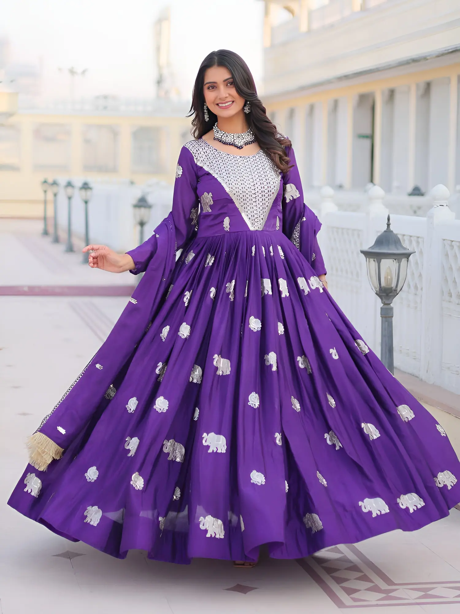 The true artistry of this ensemble lies in its stunning detailing. The bodice features a meticulously embroidered yoke, showcasing a mesmerizing interplay of intricate patterns. This ornate embellishment draws the eye, adding a touch of regal charm. Cascading down the voluminous skirt are scattered motifs of charming elephants, rendered in a shimmering silver appliqué. These playful yet elegant accents add a unique personality to the gown, catching the light with every movement and creating a visually dynamic effect. The generous flair of the skirt promises a dramatic entrance and exit, ensuring you leave a lasting impression.