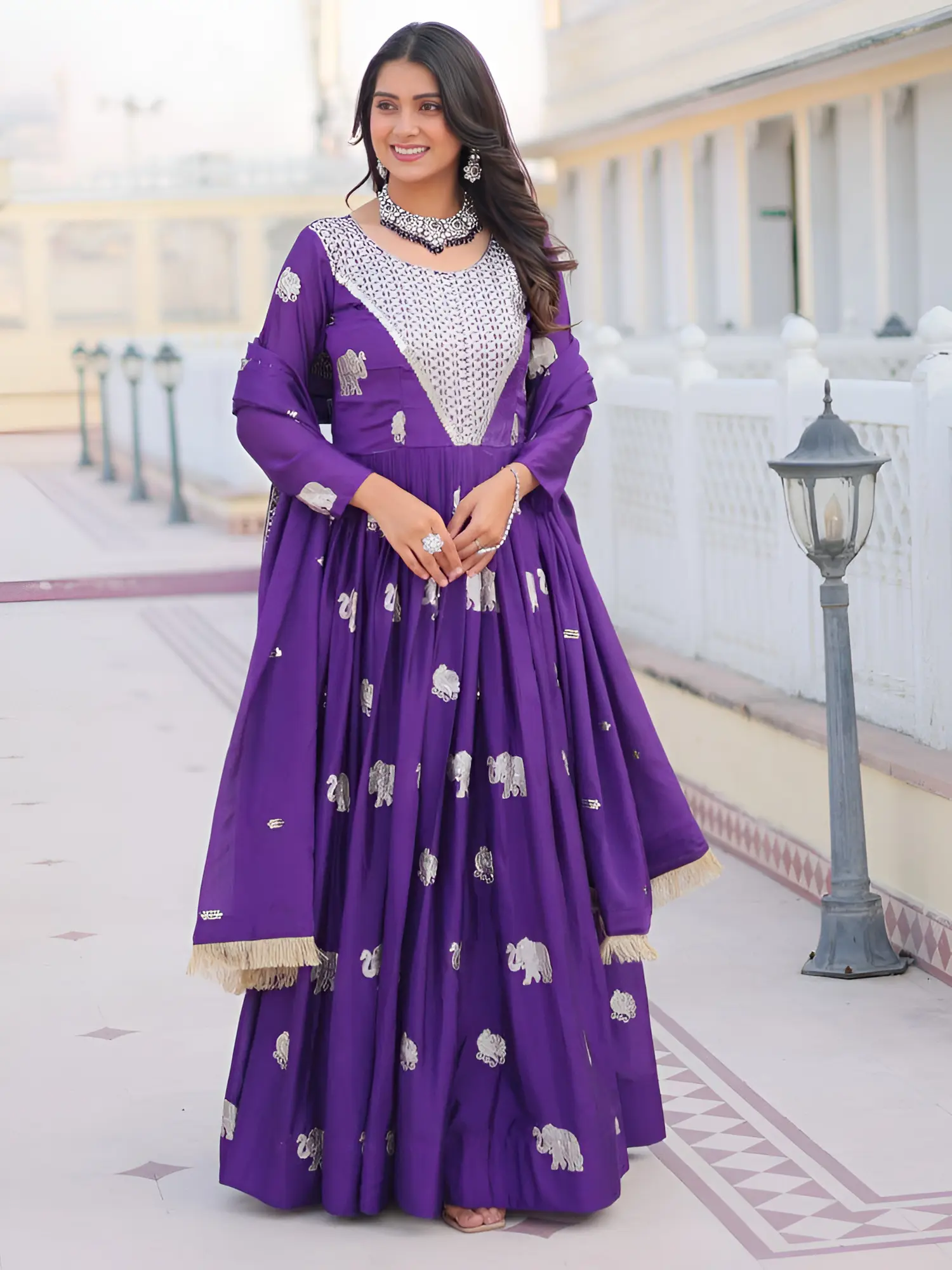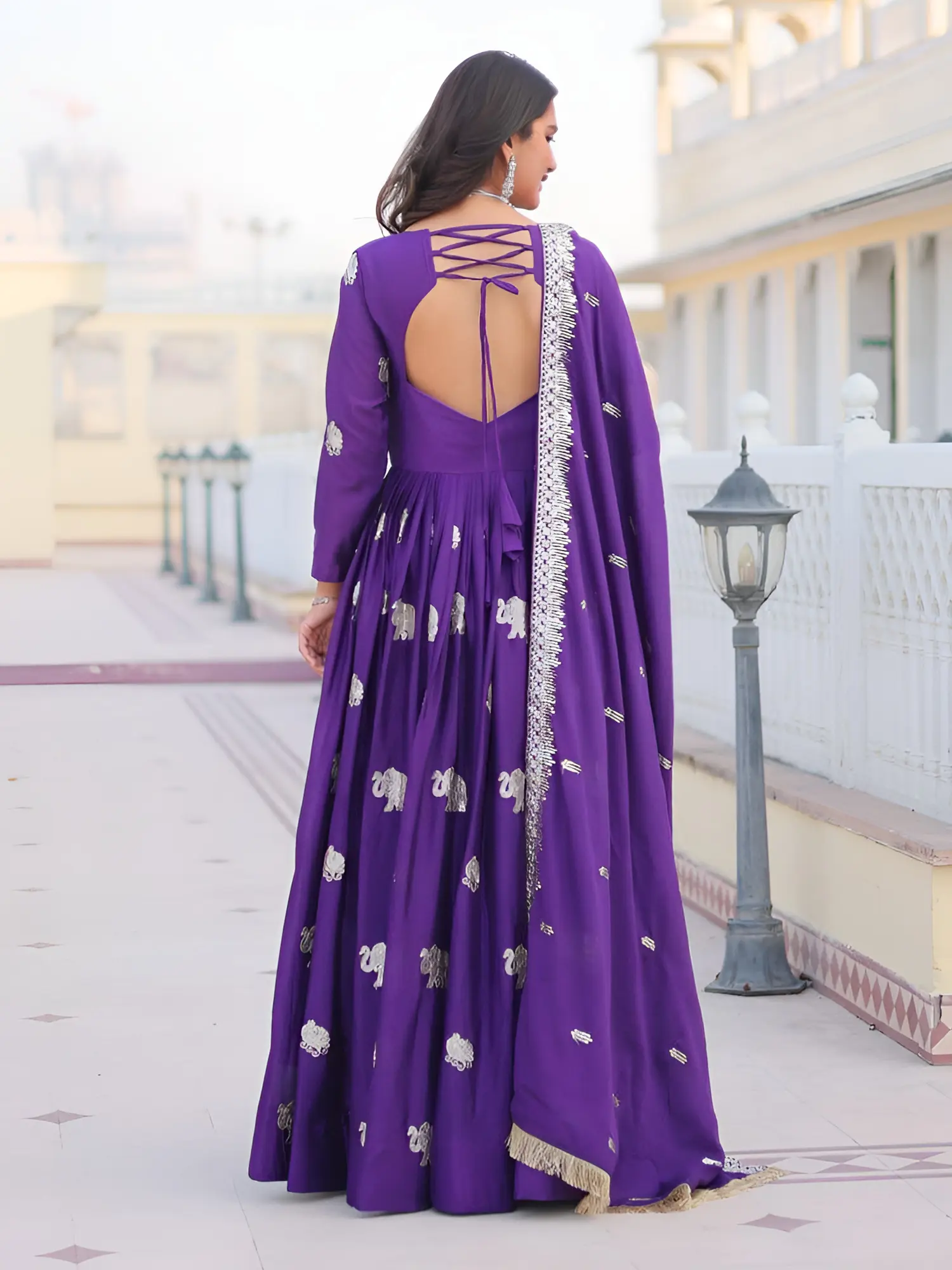 Silk Elegant Sequins And Embroidery Work Anarkali Gown With Floral Tassels Dupatta