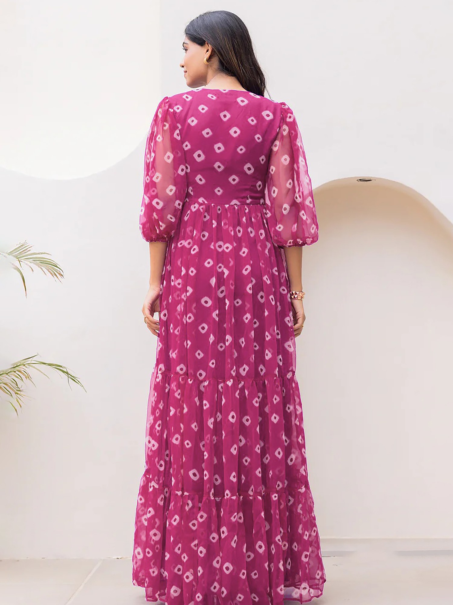 This gown is your ultimate companion for sunny getaways and relaxed leisure. Its lightweight and airy faux georgette fabric makes it an excellent choice for casual outings, beach vacations, and resort wear. Imagine yourself strolling along the shore, attending a garden party, or enjoying a sunset cocktail – this dress is designed to make you feel as radiant as the setting sun. Its easy-to-wear nature and striking design mean you can effortlessly transition from a daytime exploration to an evening gathering without missing a beat. Pack this gown for your next adventure and elevate your travel wardrobe with a piece that combines comfort, style, and undeniable charm.