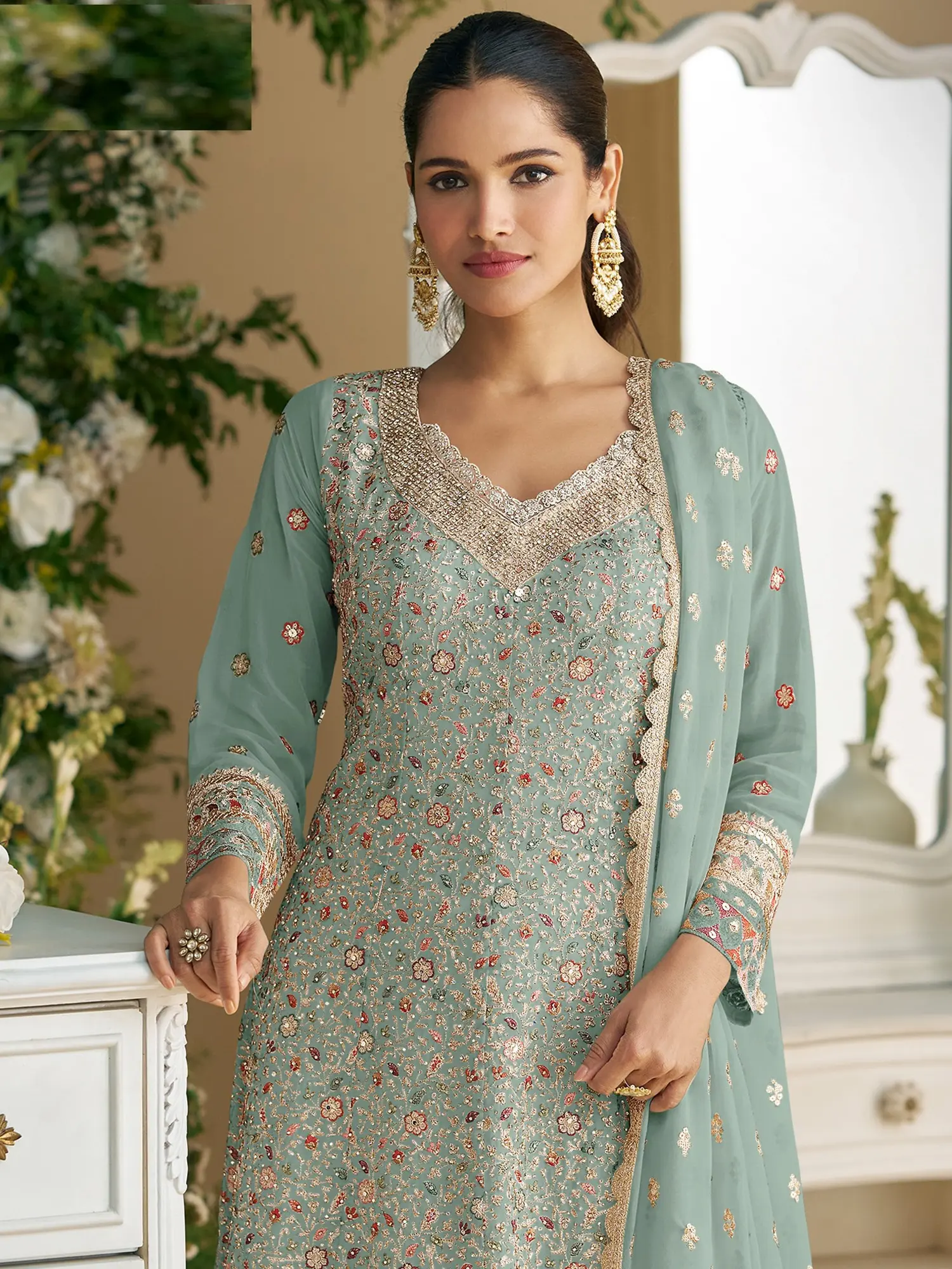 Heavy Thread Sequin Embroidery Chinon Palazzo Suit with Matching Dupatta for Festive & Party Wear