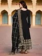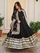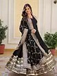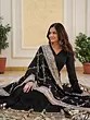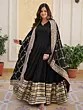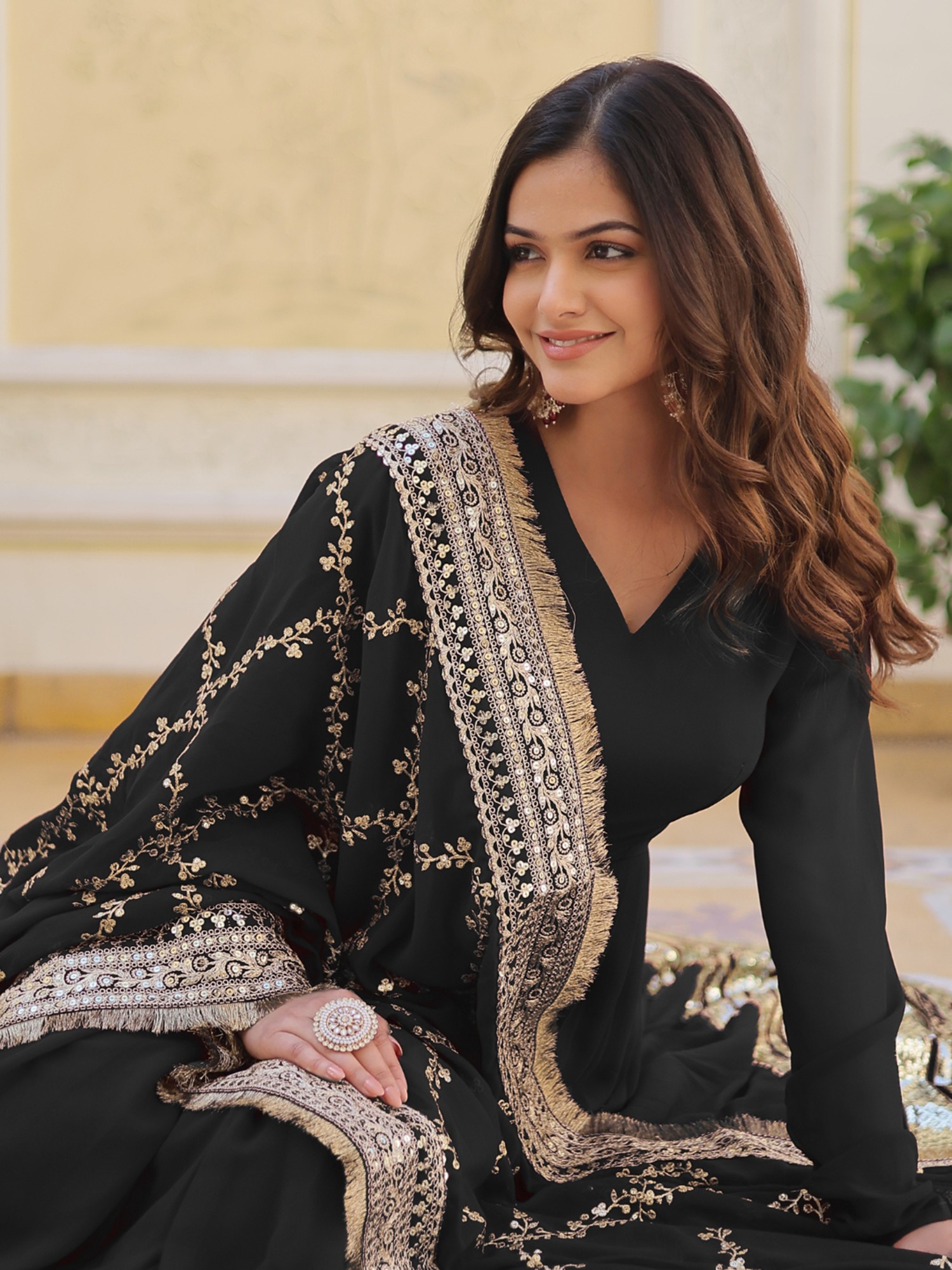 Immerse yourself in an aura of sophisticated charm with this exquisite black georgette gown, designed to make you the center of attention at any celebratory event. The rich, deep black hue of the faux georgette fabric provides a timeless canvas, offering a luxurious feel and a graceful drape that flatters every silhouette. This gown is a masterpiece of subtle opulence, perfect for parties, weddings, and any occasion where you want to exude refined elegance.
