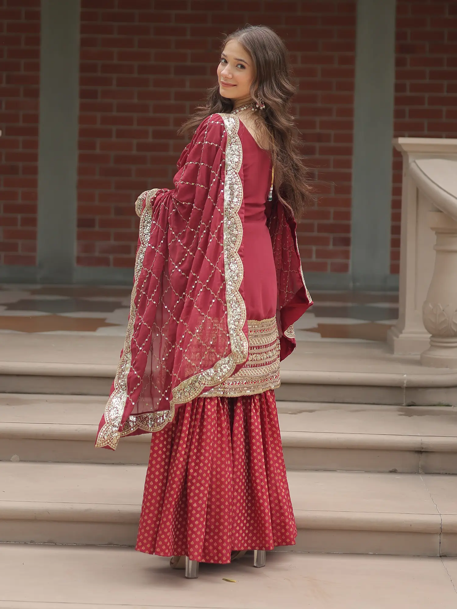 The true artistry of this outfit lies in its meticulous detailing. The kurti is adorned with intricate sequins and thread embroidery, creating a mesmerizing interplay of textures and light. The embroidery gracefully highlights the neckline, cuffs, and hem, adding a touch of regal charm. This delicate embellishment speaks to the skilled craftsmanship and attention to detail that defines this piece. The exquisite sharara pants provide a stylish and comfortable foundation, featuring a complementing print. The dupatta completes the look with a shimmering border that drapes beautifully and adds a touch of ethereal allure.