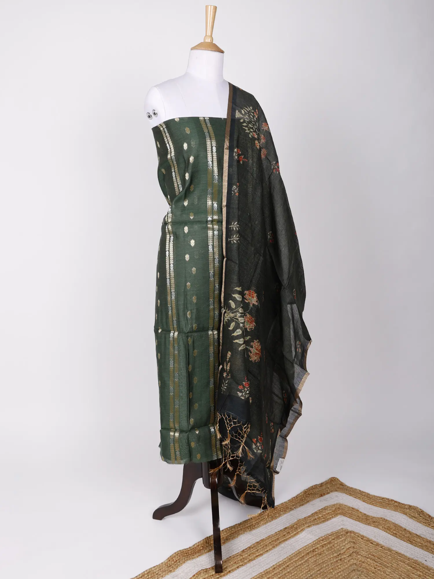 Step into a realm of refined elegance with this stunning two-piece ensemble, crafted from luxurious faux-Munga silk. The rich, deep green hue of the kurti fabric serves as a captivating canvas, adorned with intricate zari brocade detailing. The shimmering threads of zari are woven in a classic, elegant pattern, adding a touch of timeless sophistication and a subtle play of light. This opulent texture makes the kurti a statement piece, perfect for occasions where you want to exude grace and traditional charm.