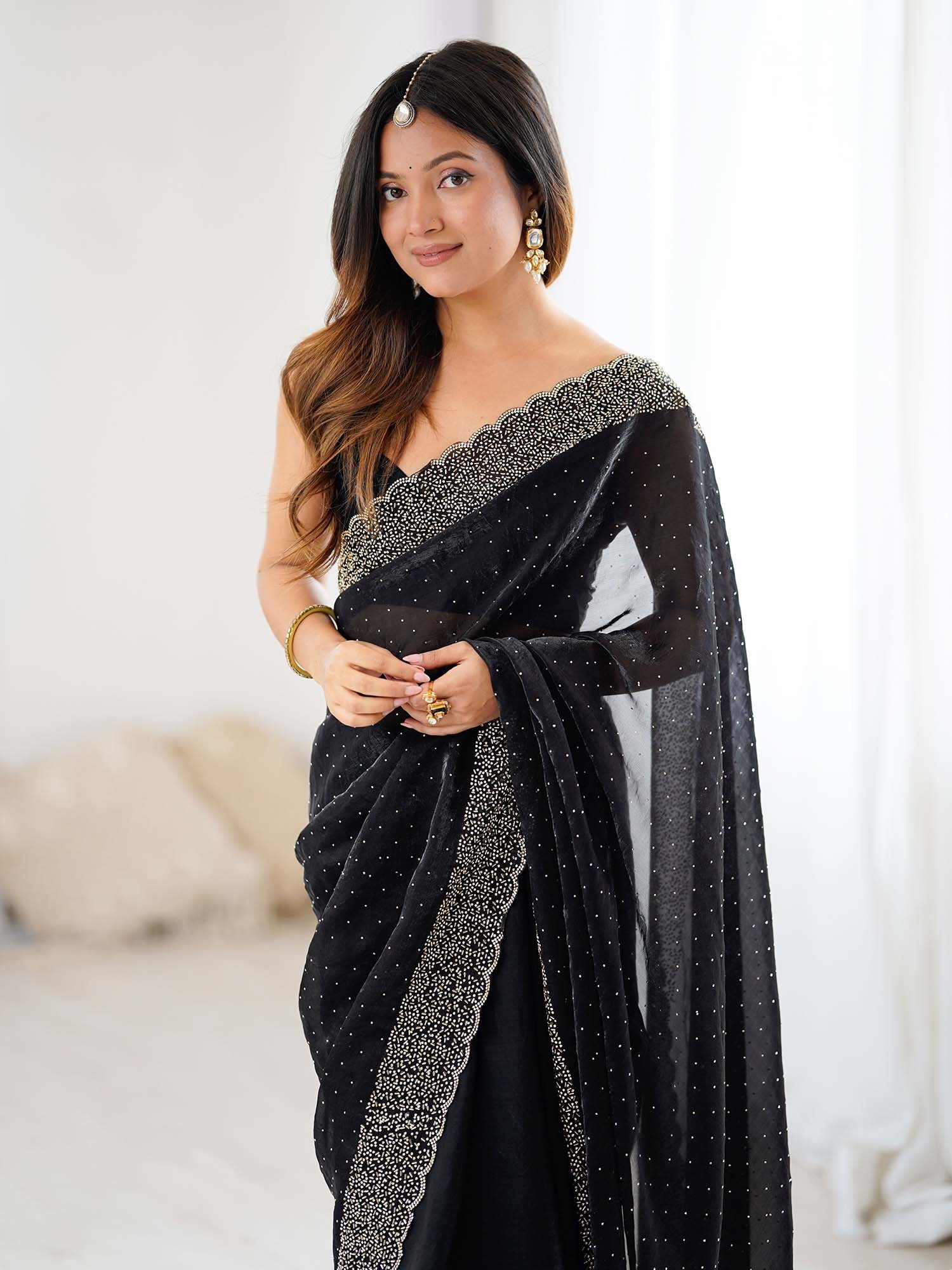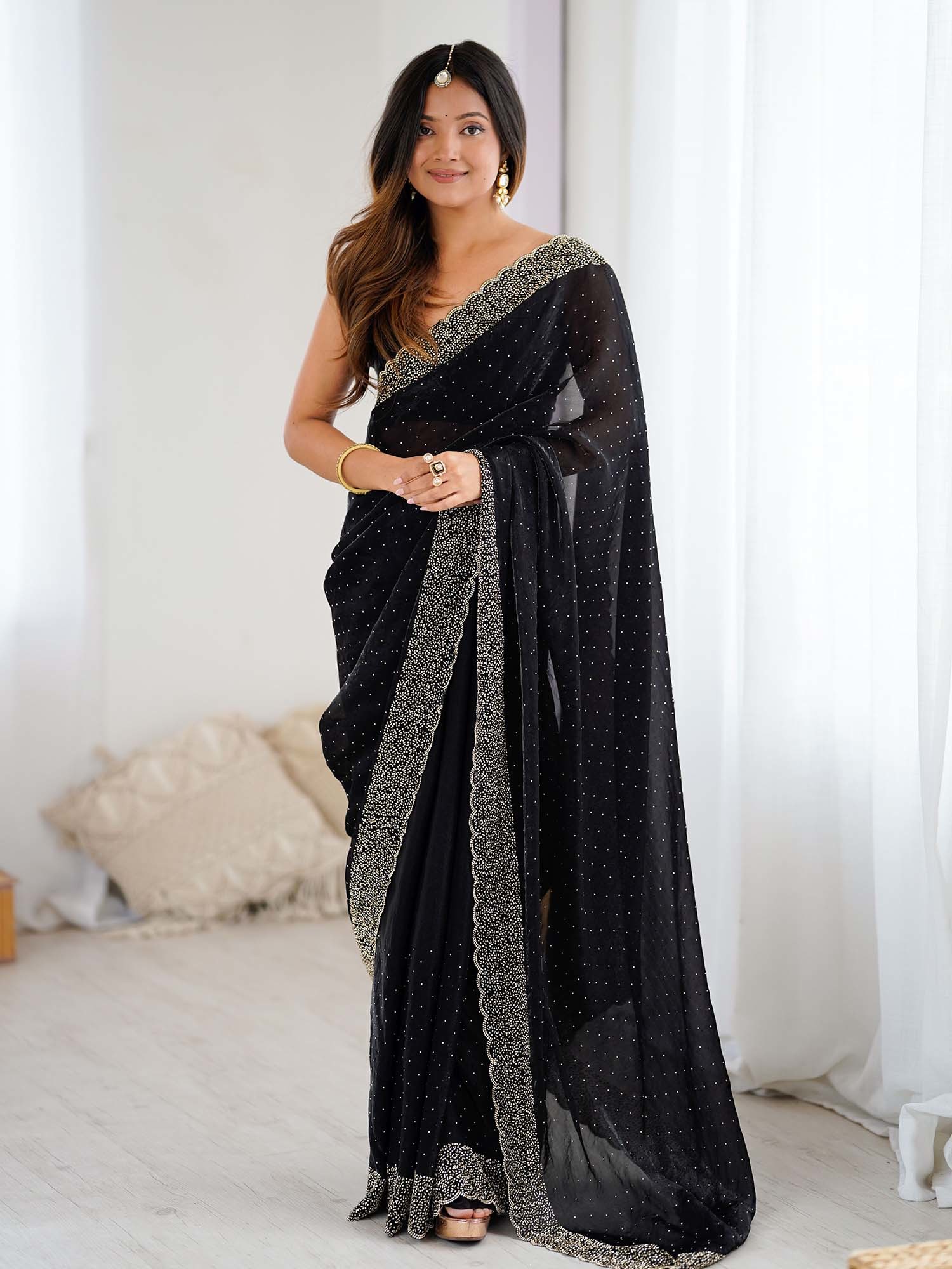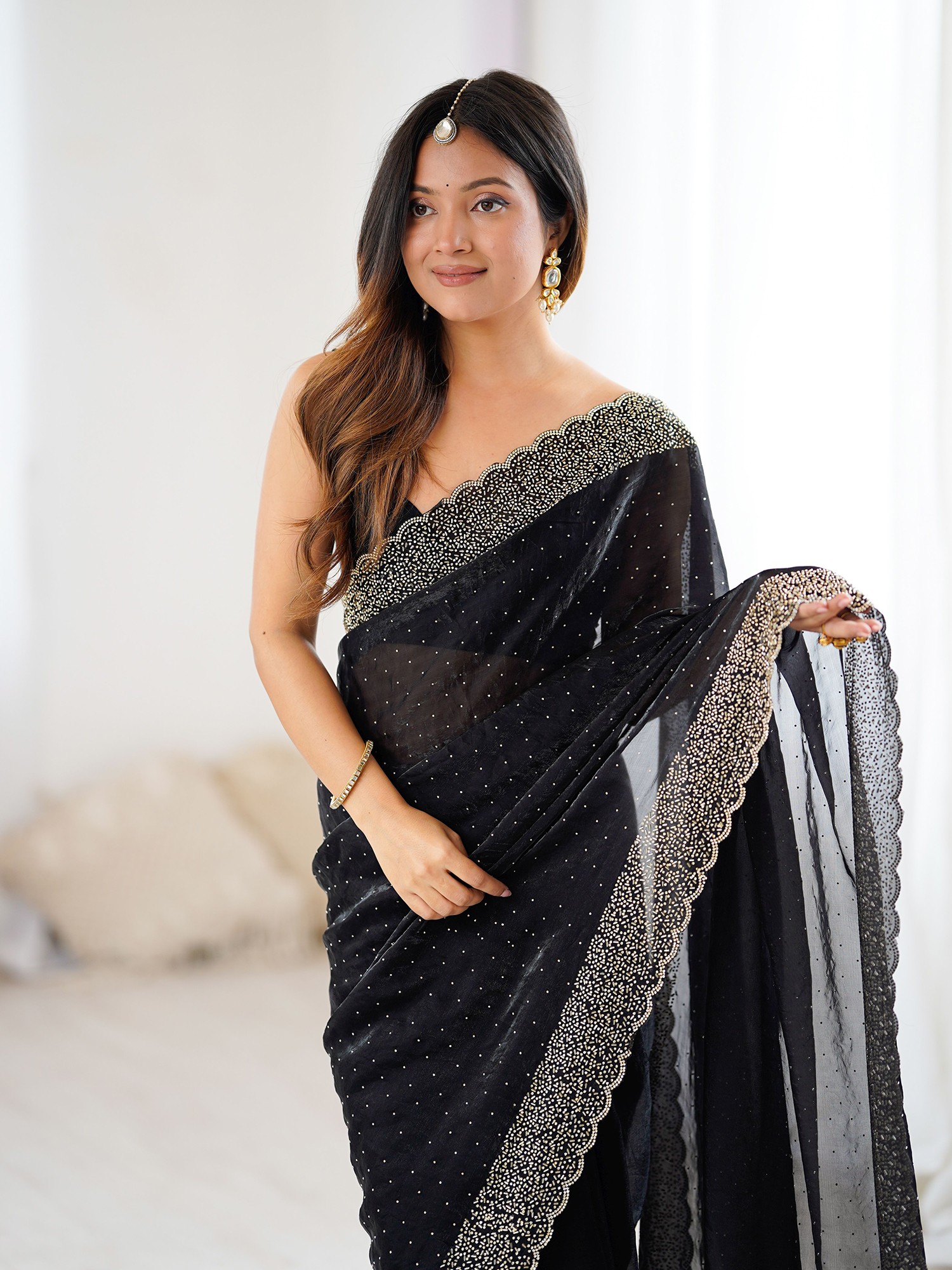 You will immediately appreciate the weightless drape of the Fendy Satin, which moves with an ethereal grace as you do. The entire expanse is subtly adorned with a delicate scattering of Zarkan, mimicking a starry night sky. Contrasting this is the elaborately detailed border, a masterpiece of craftsmanship that frames the silhouette with stunning intricacy and rich texture. This carefully curated design ensures a look that is both striking and exceptionally refined, making it perfect for discerning tastes.