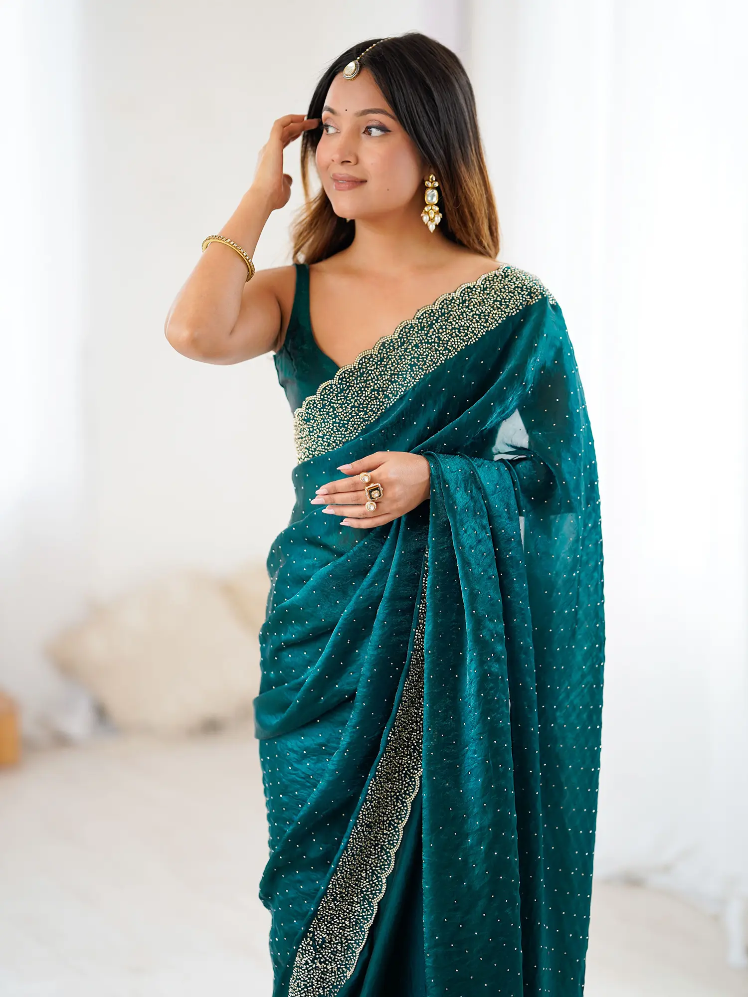 Gorgeous Fendy Satin Saree Adorned With Sequence Moti And Cutdana Embellishments Perfect For Designer Partywear