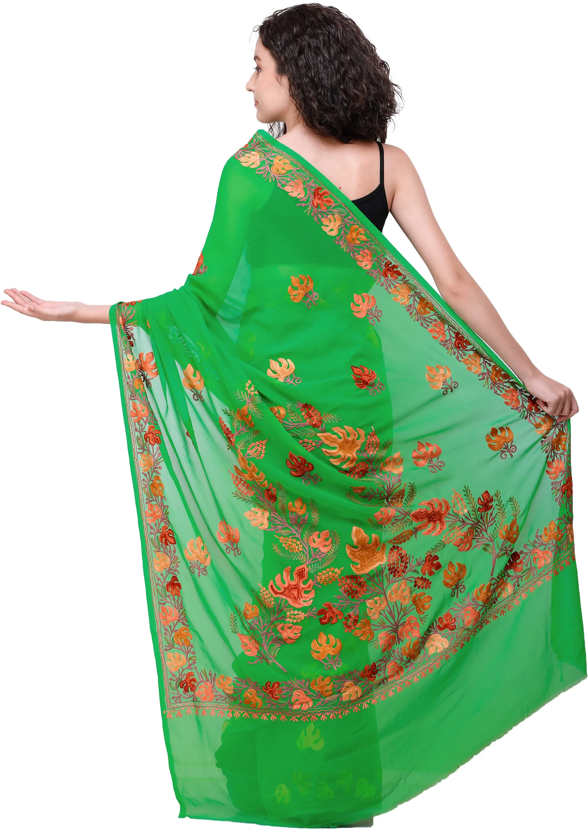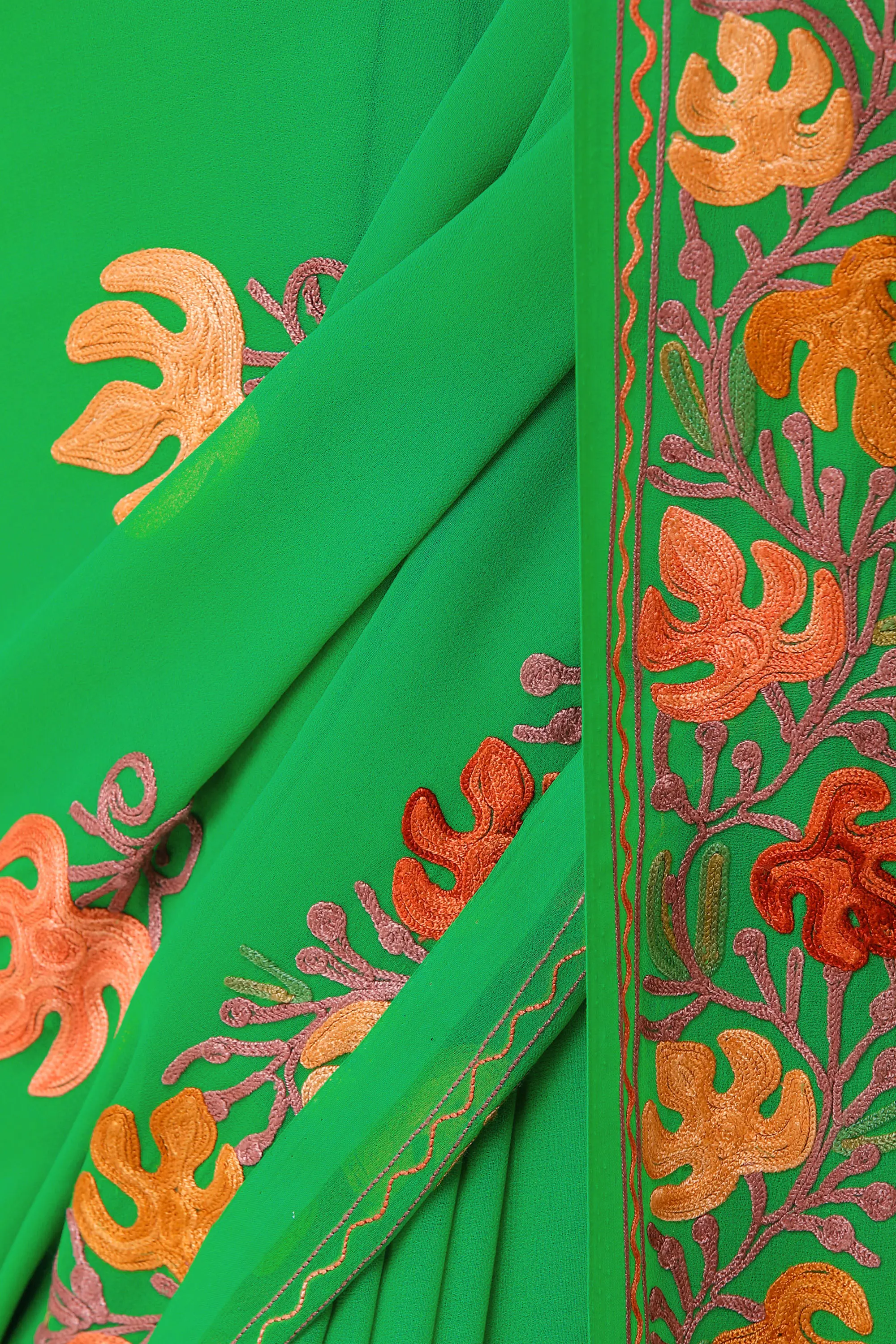 Georgette Saree with Chain Stitch Aari Embroidered Floral Border from Kashmir