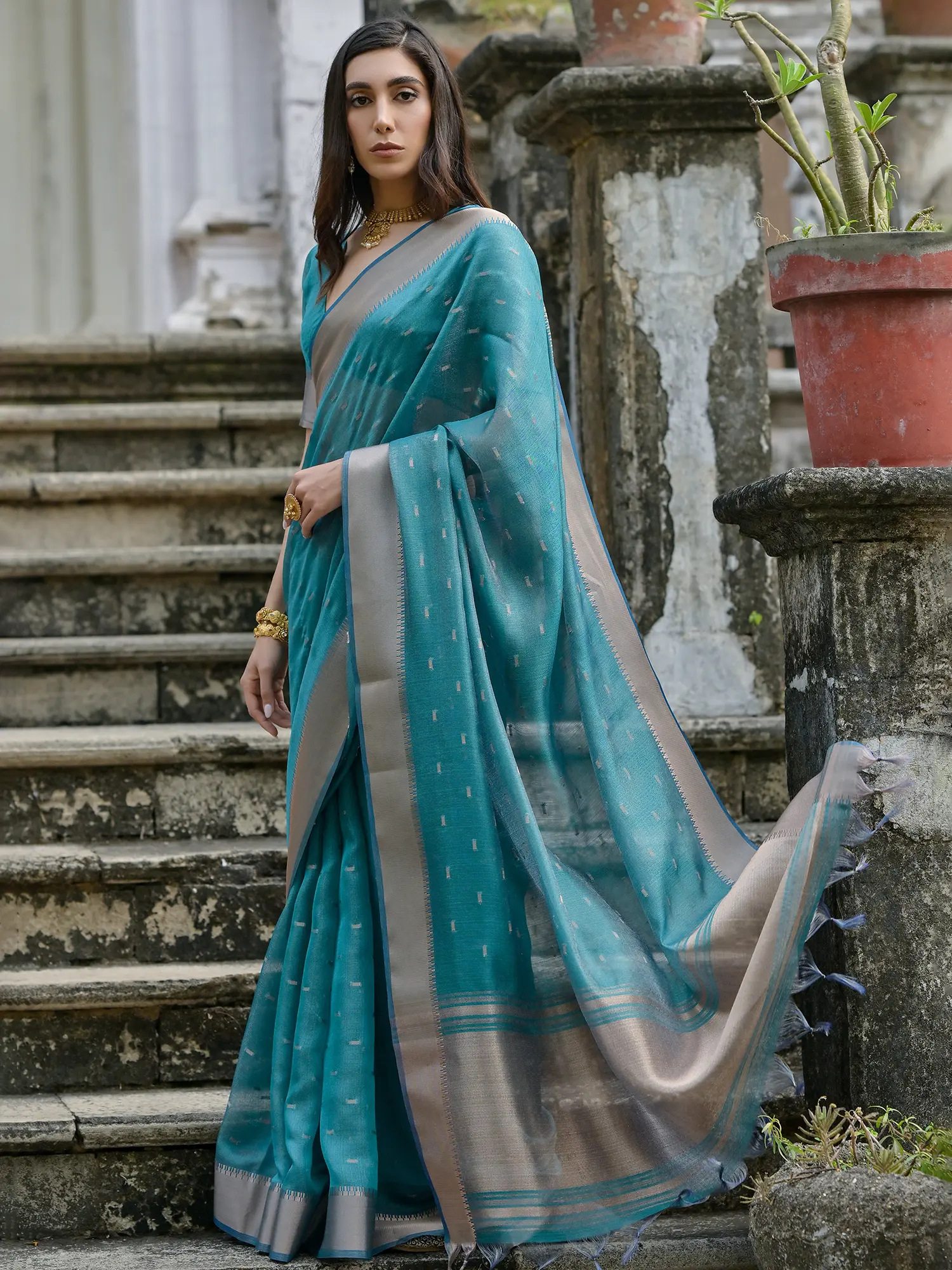 Linen Cotton Mughal Butti Pattern Saree with Blouse