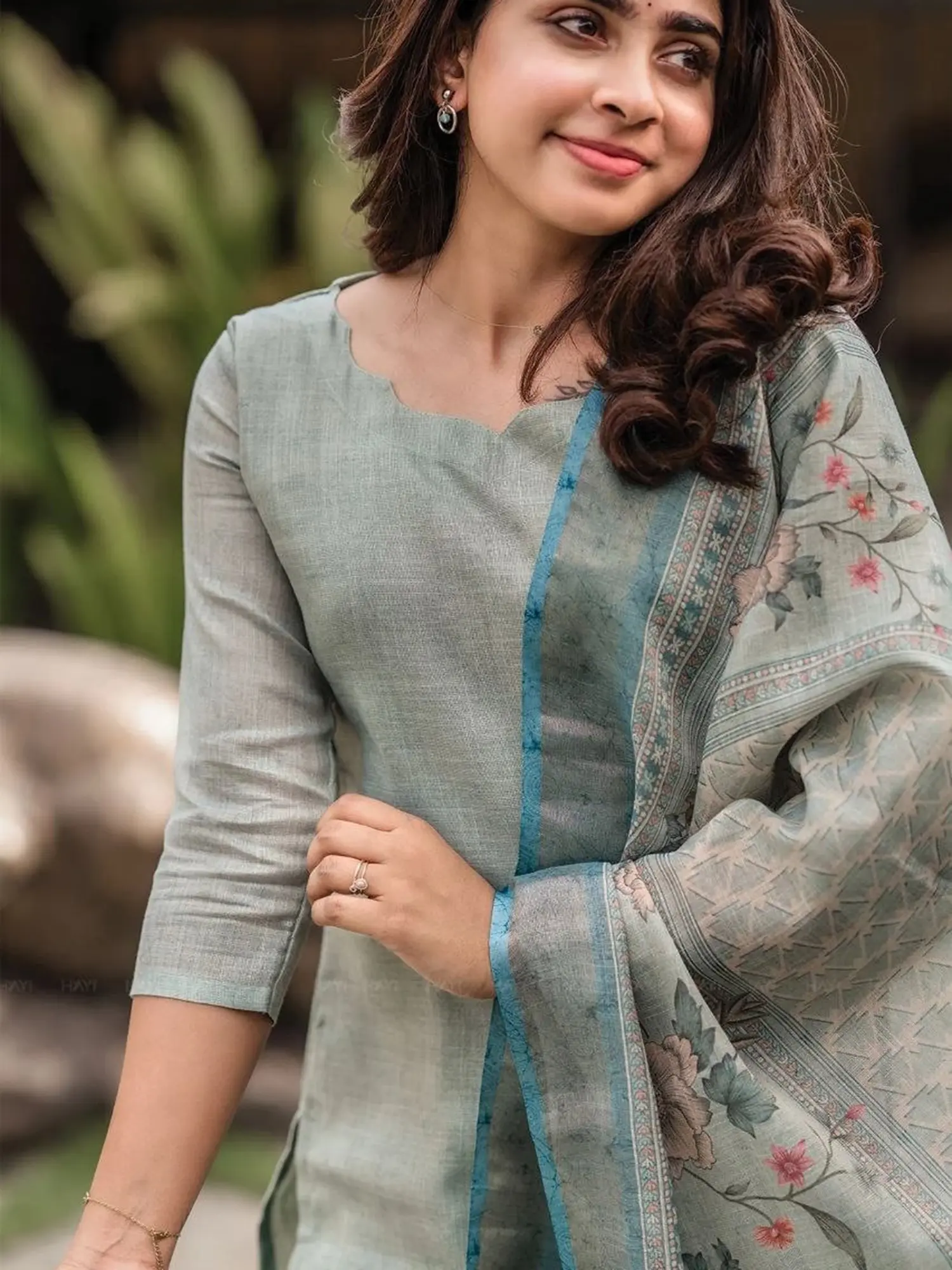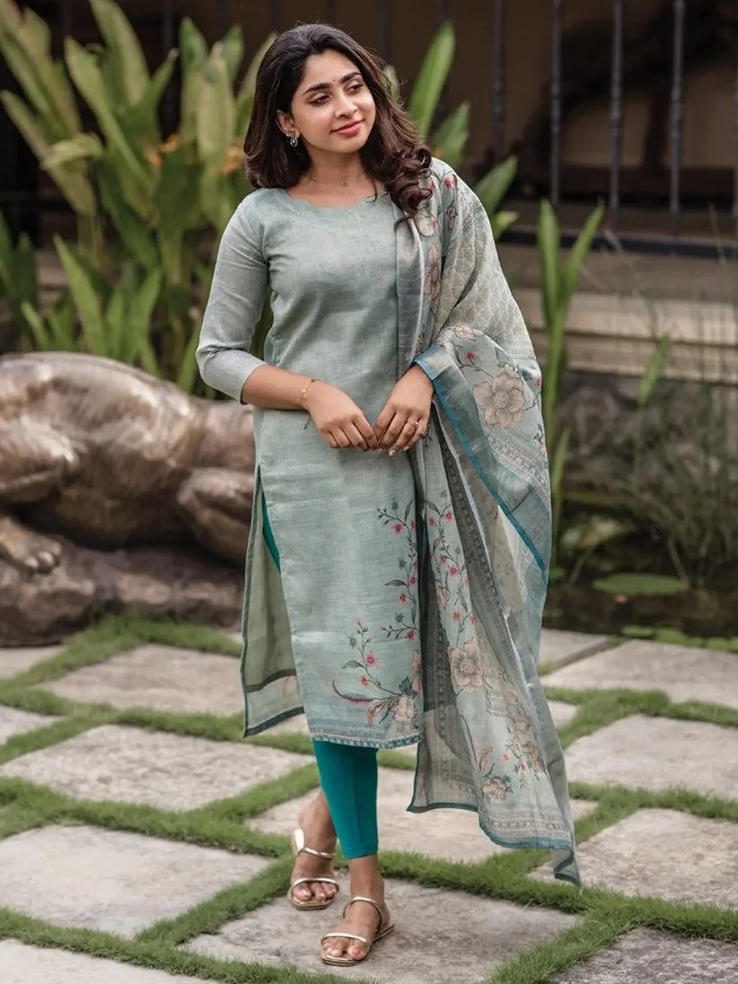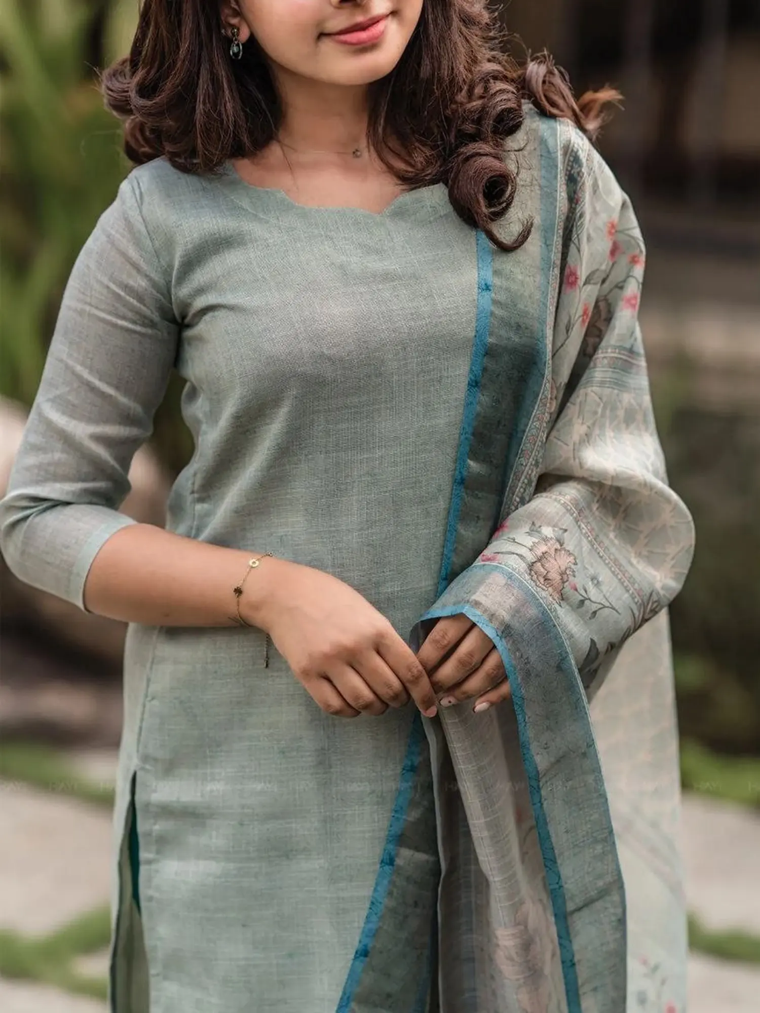 The set includes a kurti, matching bottoms, and a beautifully printed dupatta.