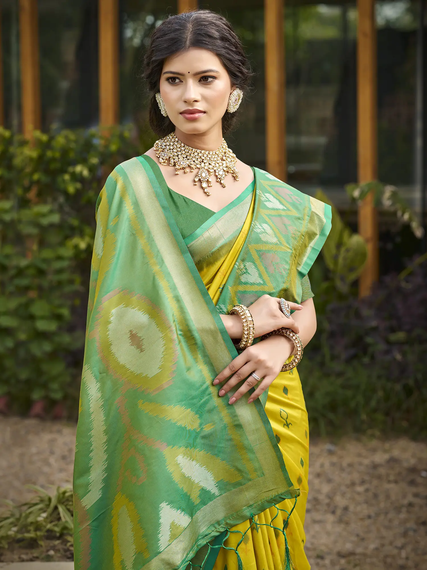 Festive Silk Saree With Bold Ikat Inspired Border Ideal For Wedding Functions Parties And Traditional Occasions