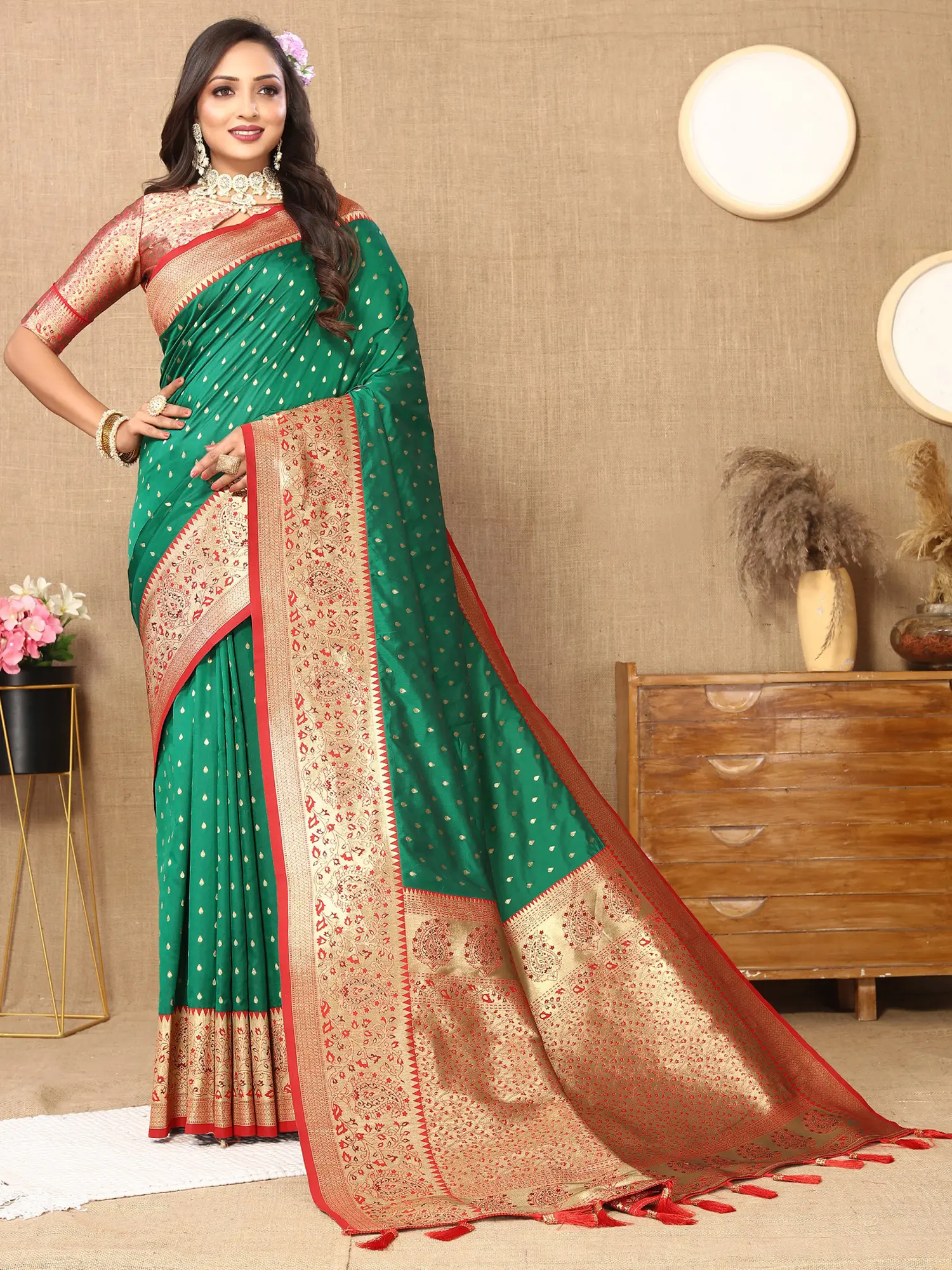 Crafted from premium Banarasi silk, offering a luxurious texture and lustrous sheen.