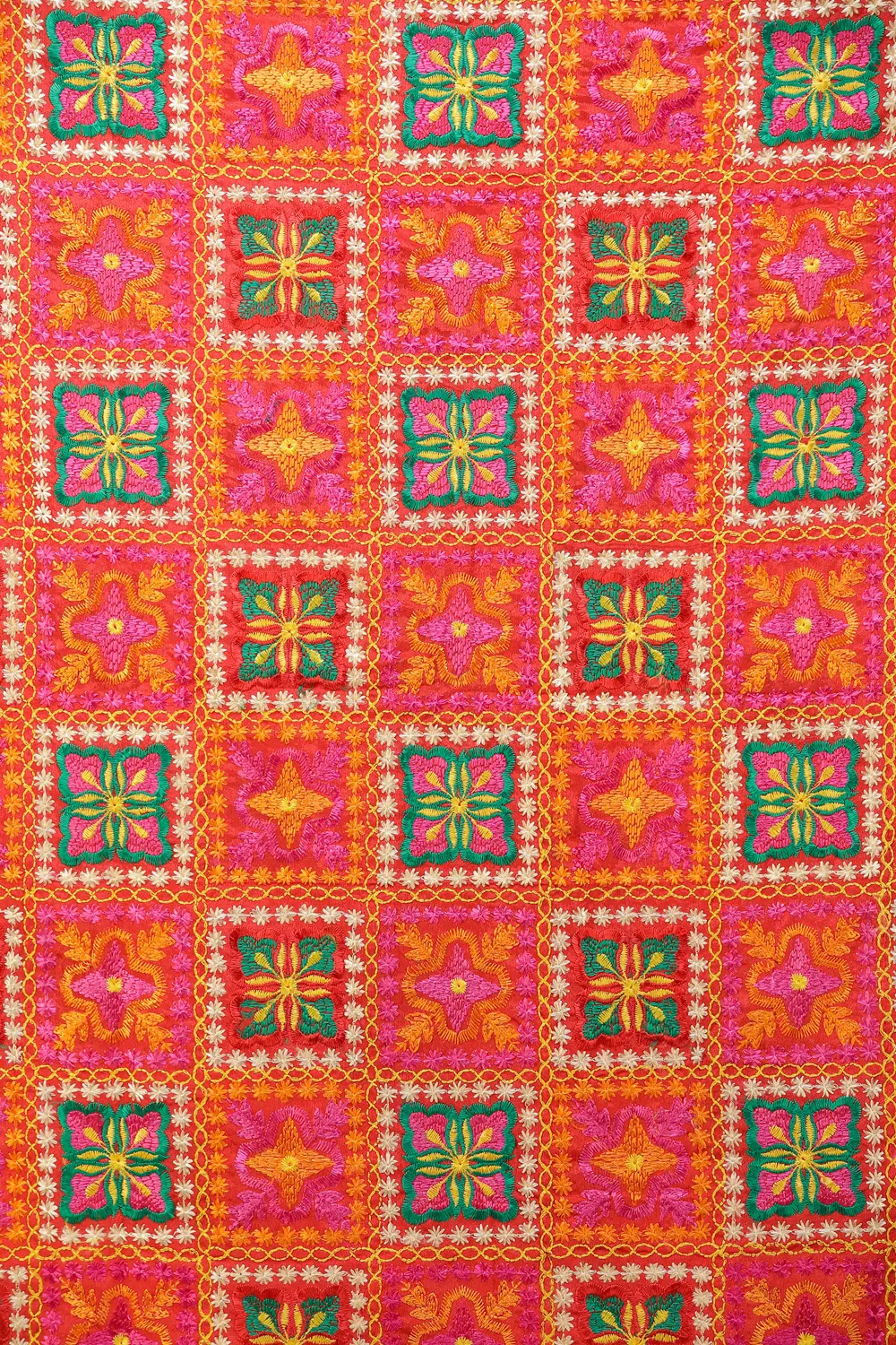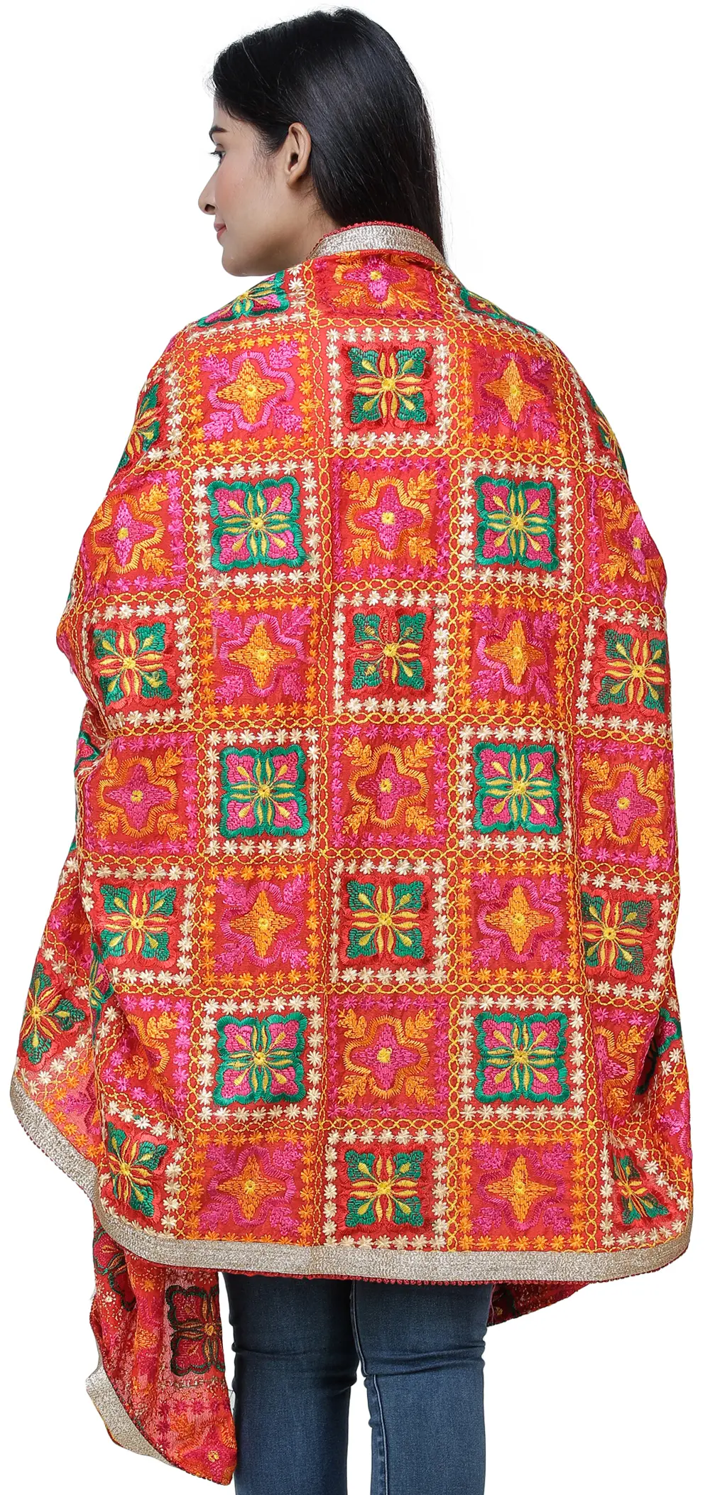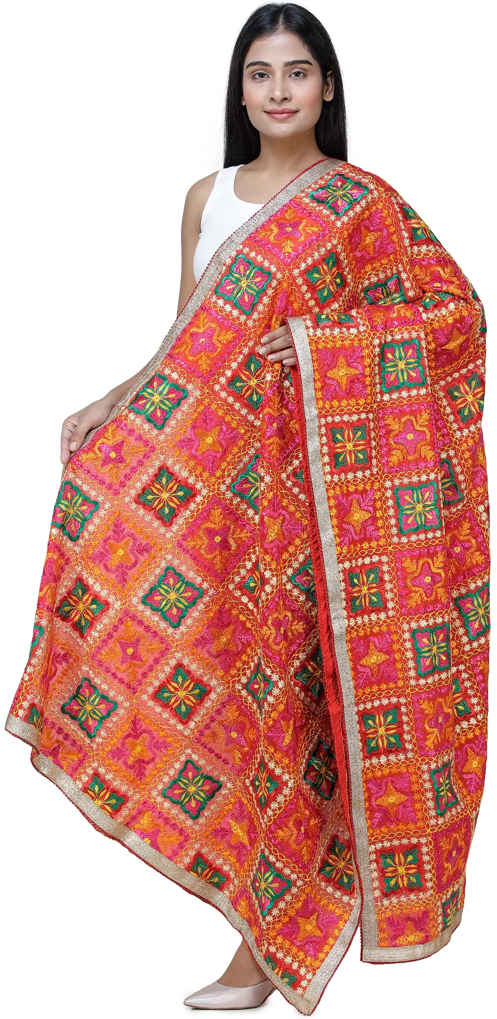 Phulkari embroidery is a traditional style of embroidery art that hails from Punjab and is identified by its colourful threads used for floral designs. A phulkari embroidered textile graces the personality and confidence of the wearer. This red-pink colored dupatta that you see on this page is an amazing mix of style, beauty and fashion, which when taken over any plain kurti, preferably black or white will be like an icing on the cake. The bright colors catch the attention of the eyes and also accentuate the beauty of its embroidery. The entire stole is embroidered in square shaped patterns in a soothing and delightful blend of red, pink, green, yellow and white colors.