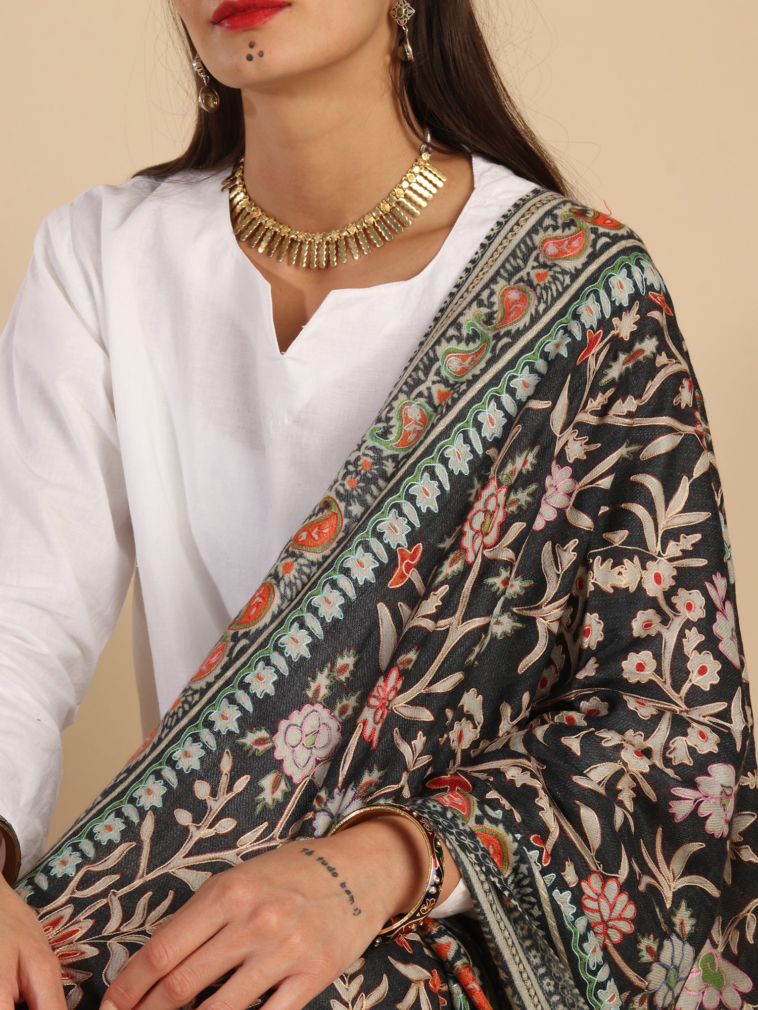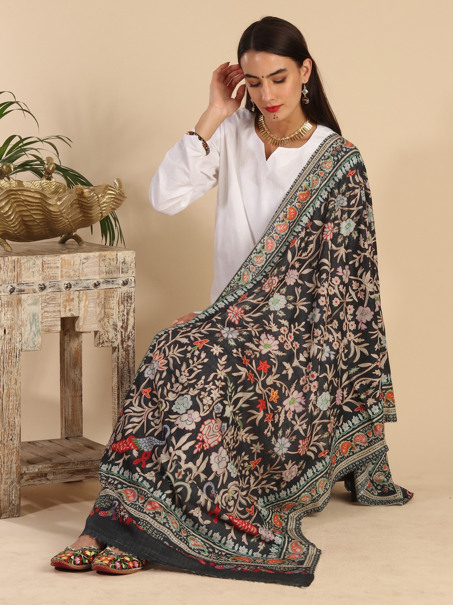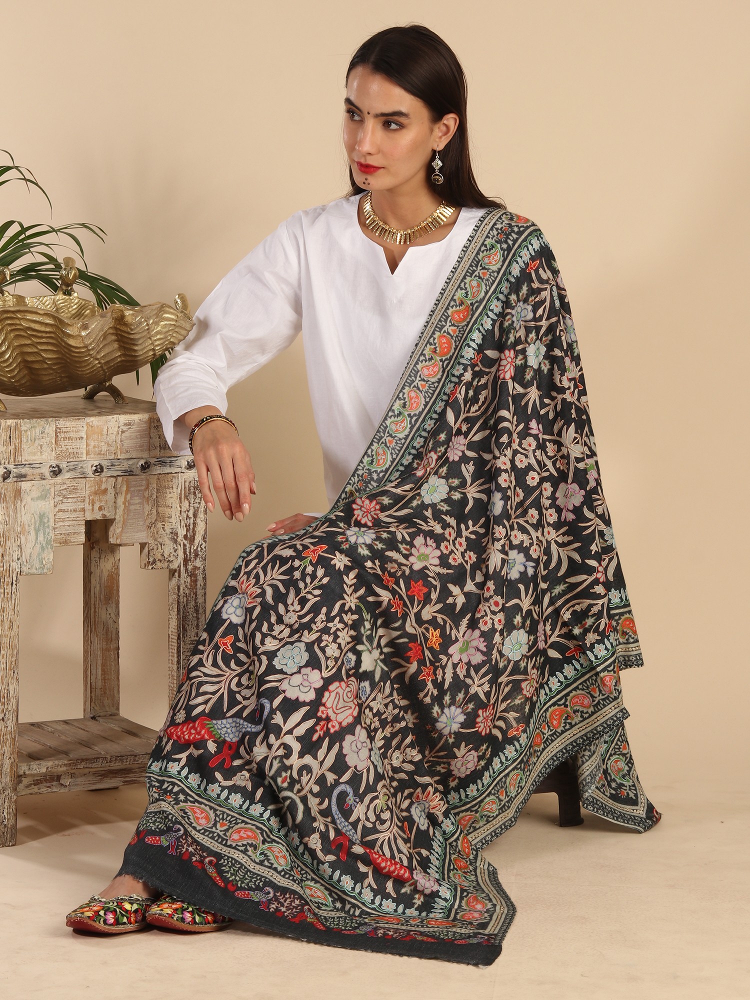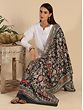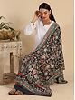 Experience the opulence of our Fine Wool Kalamkari Stole adorned with a Peacock-Floral Vine digital print and manual embroidery. Crafted with care, this stole pays homage to the artistic traditions of Kalamkari. Skilled artisans have meticulously added manual embroidery, enhancing the all-over design. The design traces its roots to the ancient artistry of Kalamkari, a craft that continues to flourish. Today, this fusion of digital print and manual embroidery seamlessly aligns with contemporary fashion trends. The stole's exquisite colors and fine wool make it a cherished addition to your collection, embodying the spirit of heritage and elegance.