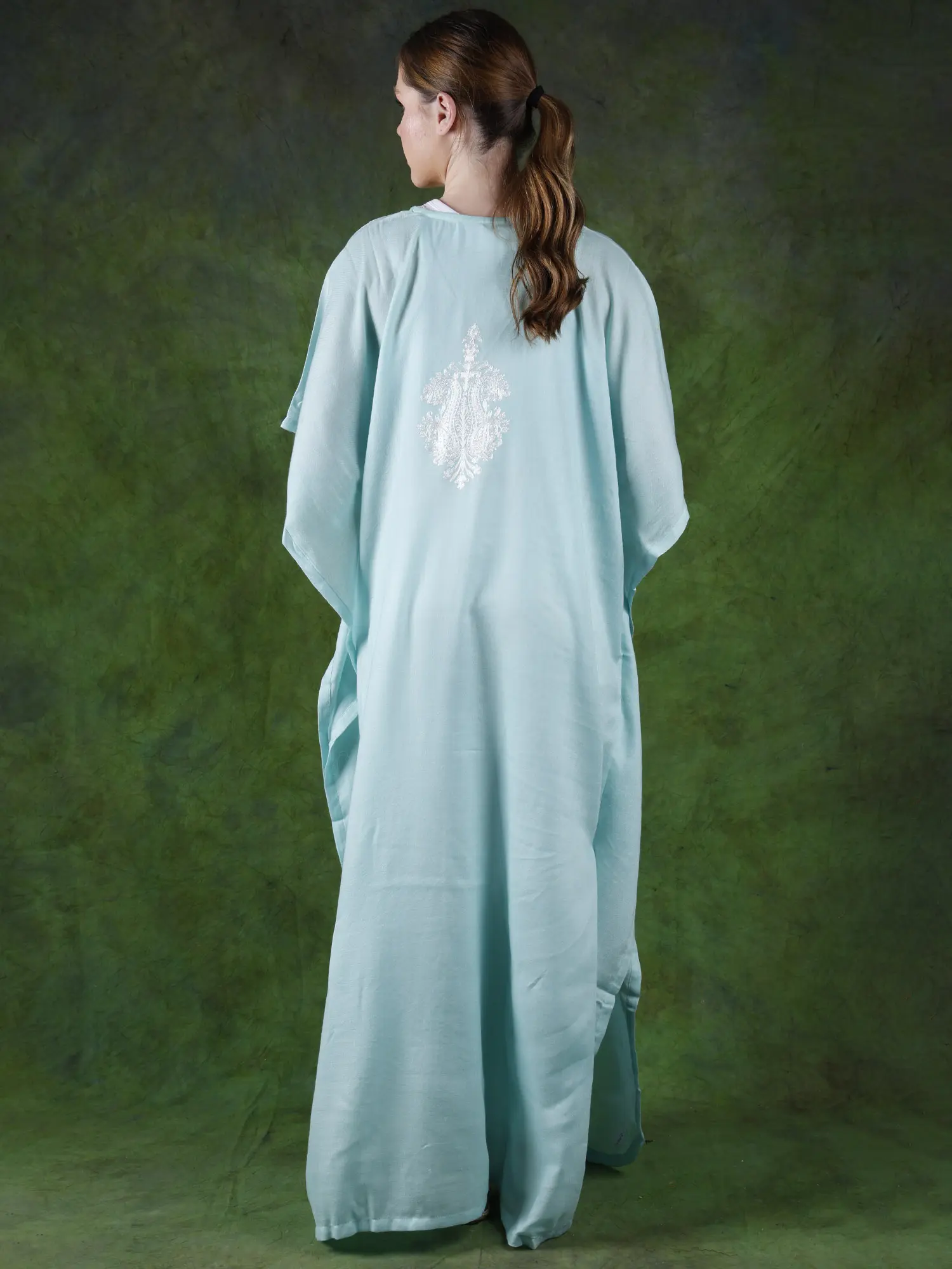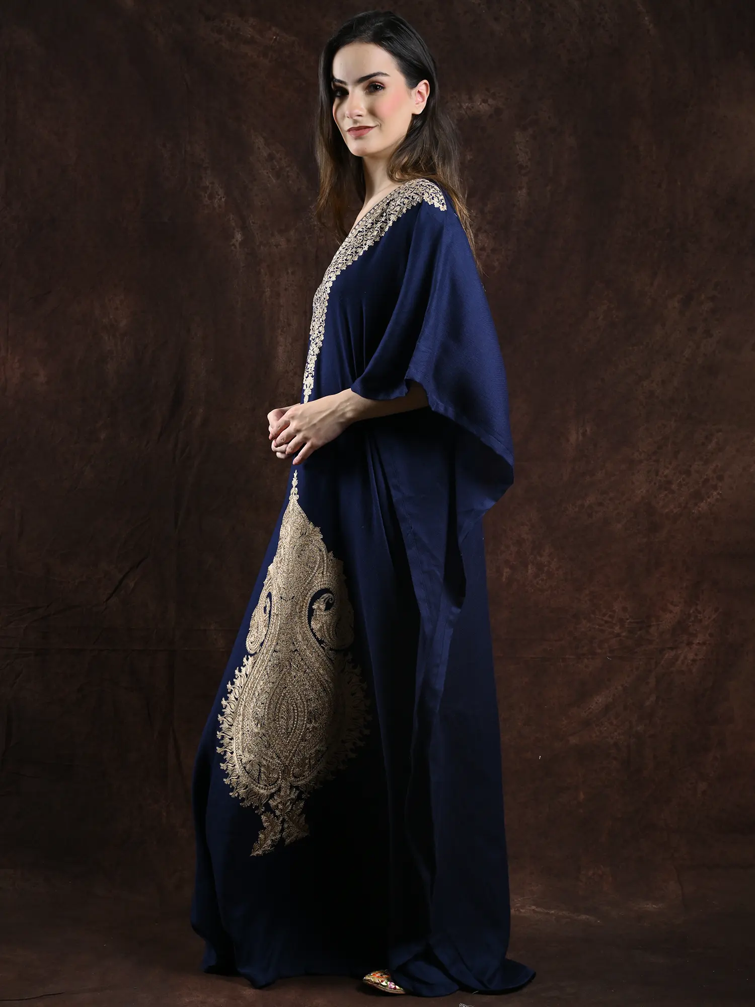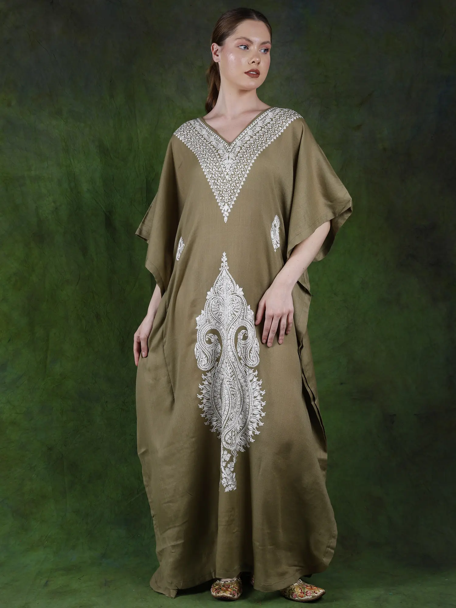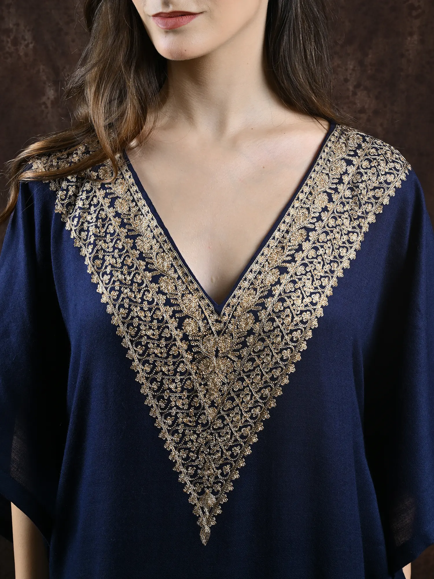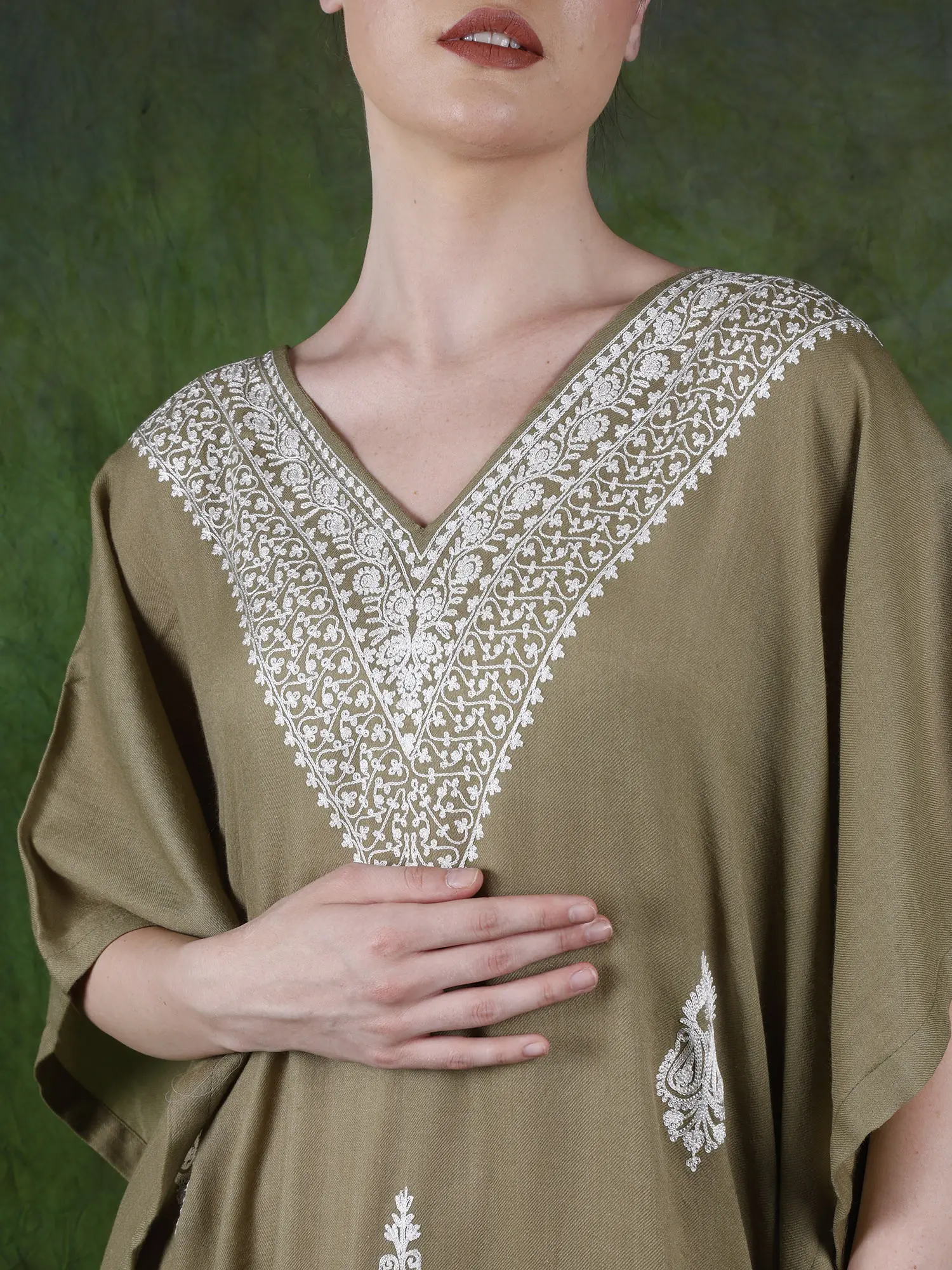 The soft wool offers the required protection against the cool winds, while the intricate Aari work, embellishes the clothing with the regal Kalka motifs.