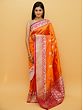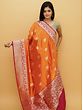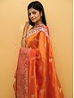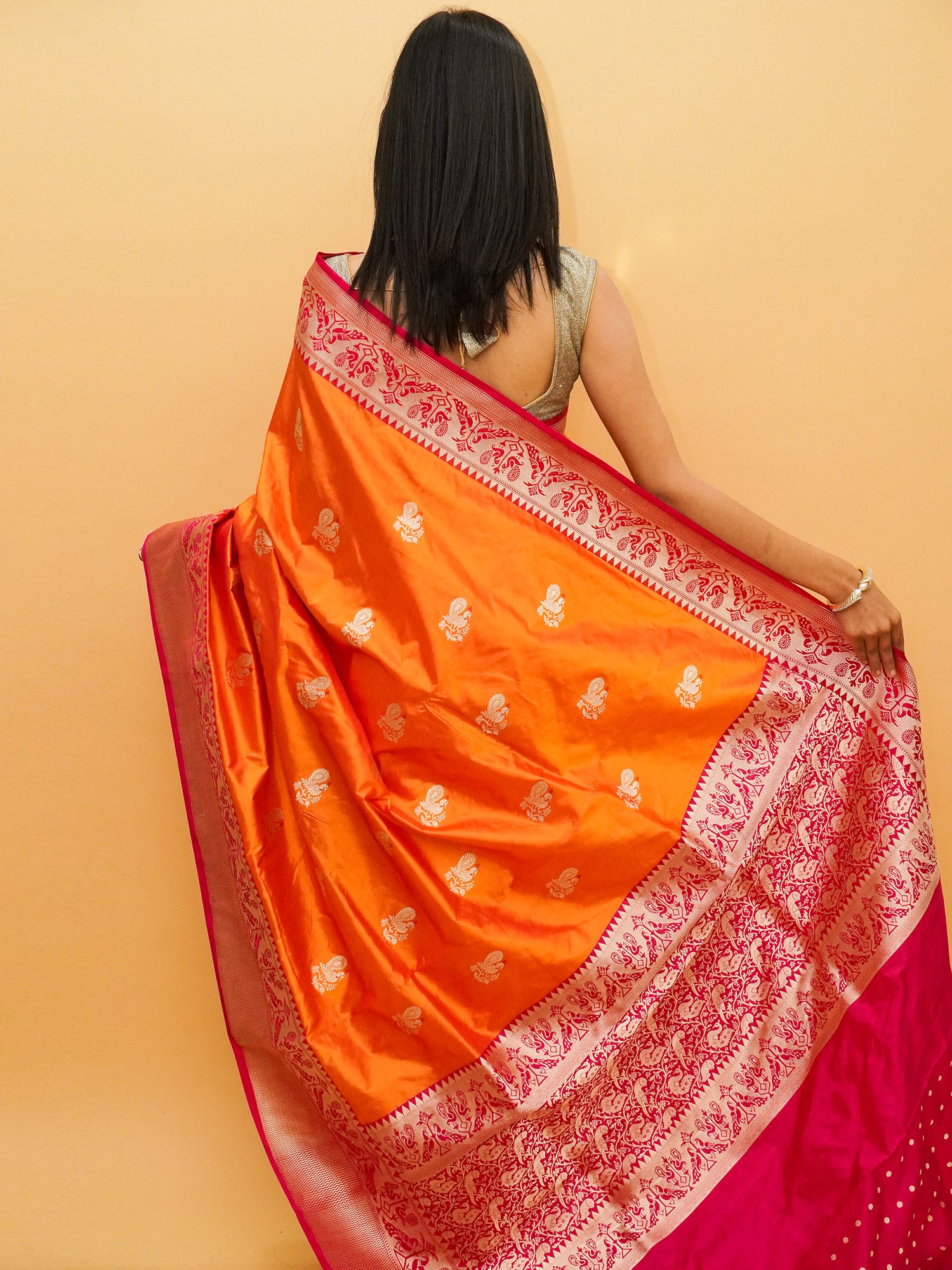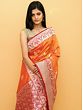 Perfect for a newlywed woman who loves to flaunt her beauty in vibrant Indian attire, this pure Khaddi Silk Banarasi Saree in flame-orange is a marvelous addition to your traditional Indian women’s wear collection.
