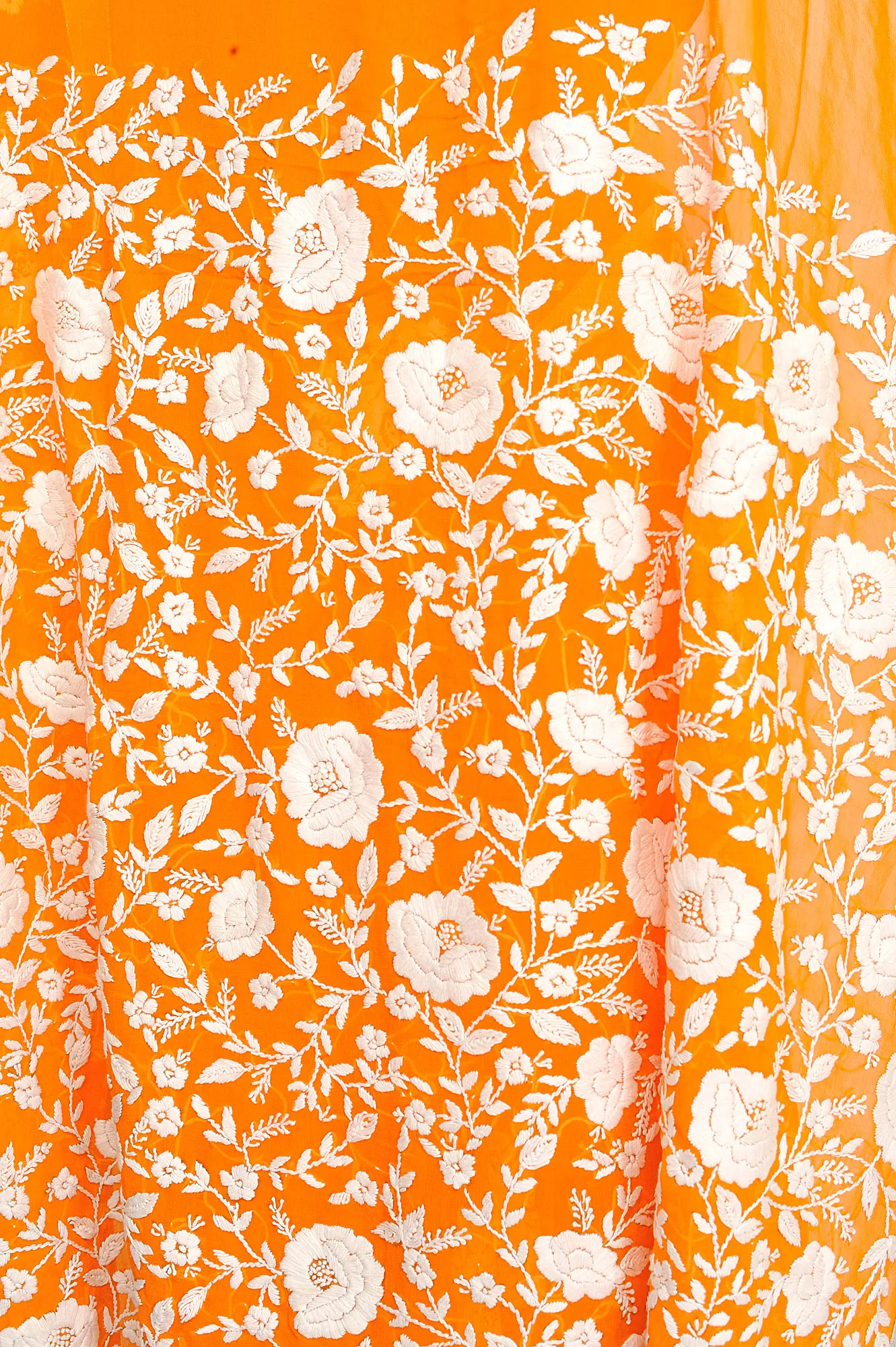The true allure of this sari lies in its meticulously hand-embroidered Phulkari motifs. Phulkari, meaning "flower work," is a time-honored folk art from Punjab characterized by its vibrant floral patterns and geometric designs. Here, delicate white threads are used to create blooming flowers and scrolling vines that adorn the edges and pallu of the sari, adding depth and visual interest. Each stitch is a whisper of heritage, showcasing the skill and dedication of the artisans who brought this masterpiece to life. The intricate detailing on the rich orange fabric creates a captivating contrast, ensuring all eyes are on you.