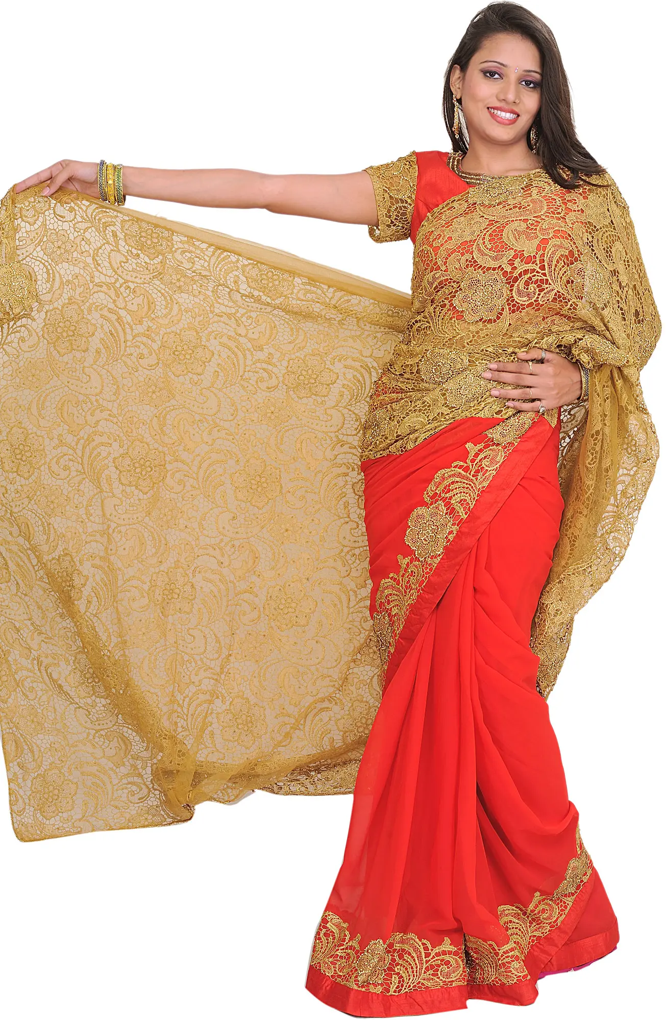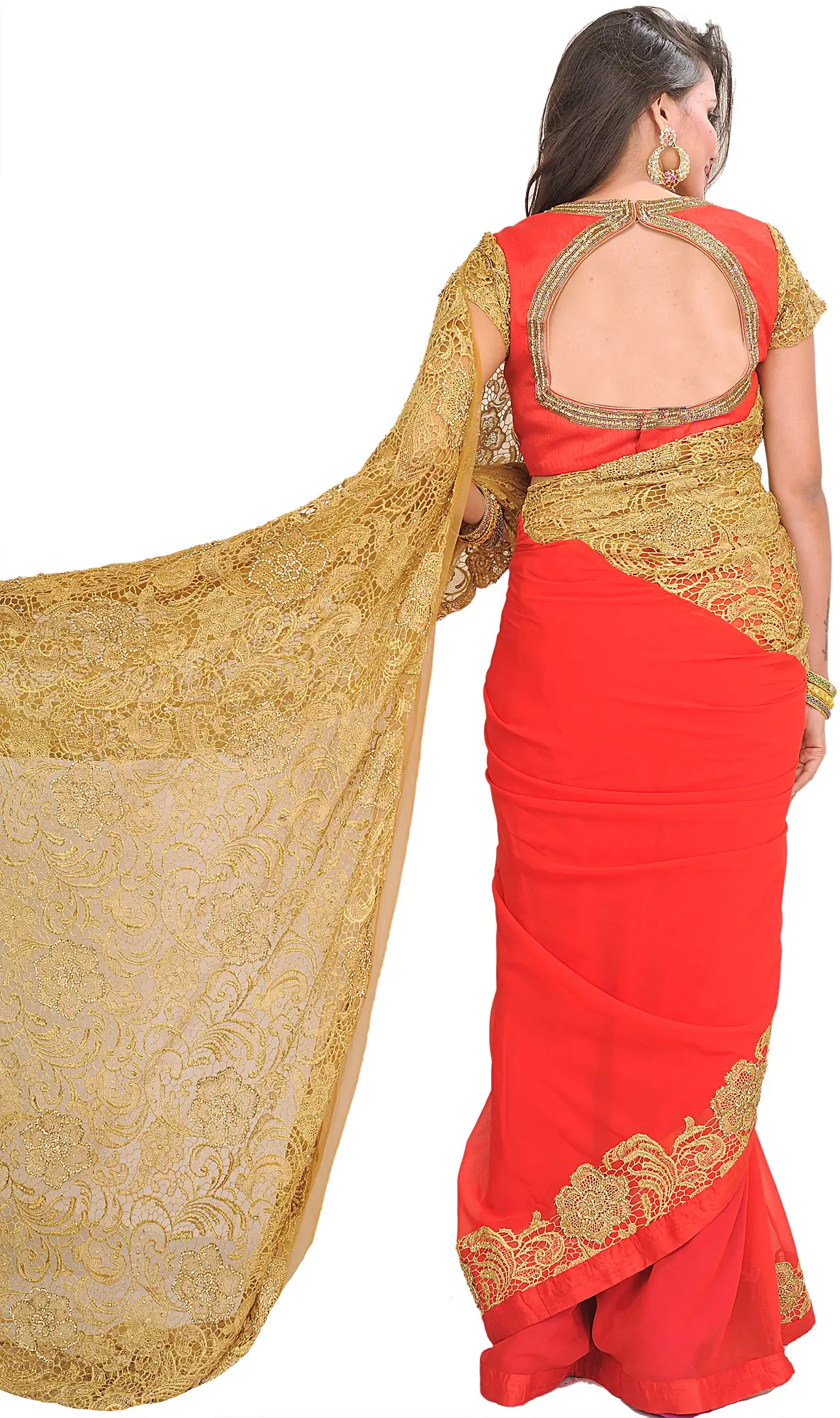 Flame Scarlet and Golden Wedding Prada Palla Sari with Crystals
