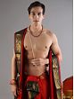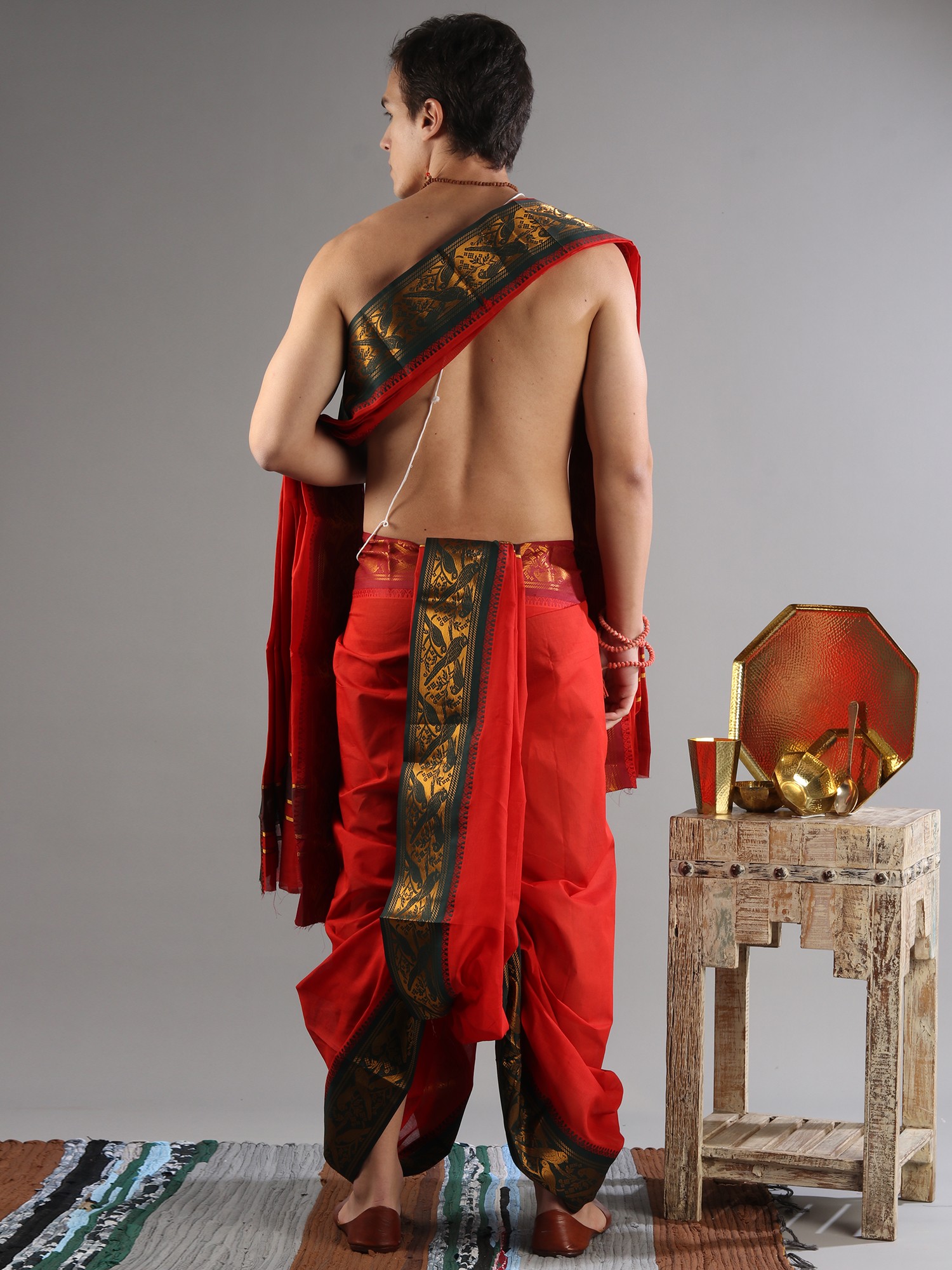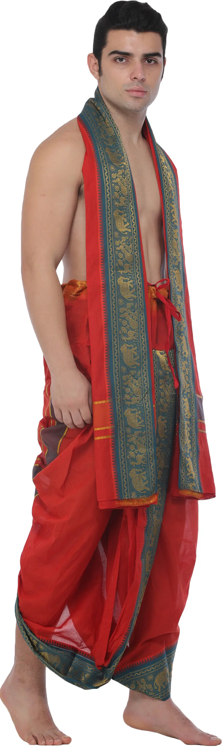 Dhotis and angavastrams have long been significant garments in Indian culture, worn for centuries during auspicious occasions and religious ceremonies. This set honors that rich heritage while offering a contemporary twist with its ready-to-wear design and striking woven border. The scarlet color is traditionally associated with good fortune and joy, making this set a perfect choice for weddings, festivals, and other celebratory events. It's an outfit that carries with it a sense of tradition, respect, and refined taste.