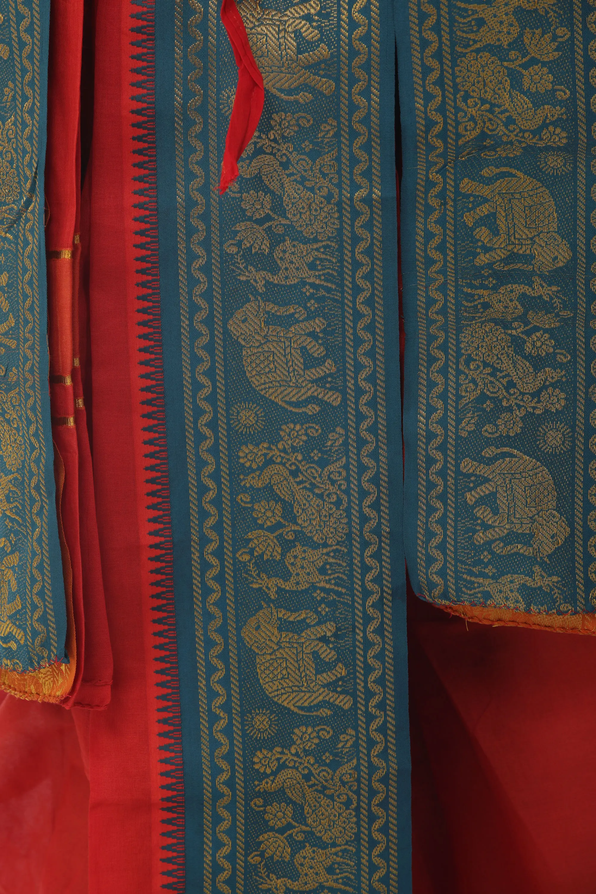 What truly sets this set apart is the stunning woven border that adorns both the dhoti and the angavastram. This intricate tapestry features a captivating design of birds and animals, rendered in a rich, golden thread against a deep teal backdrop. These motifs are not merely decorative; they are a testament to traditional Indian craftsmanship, each element telling a story of nature's beauty and intricate artistry. The detailed patterns are a visual delight, drawing the eye and adding a unique character to the ensemble. The border is finished with a subtle zigzag pattern and a thin gold stripe, further enhancing its rich texture and visual appeal.