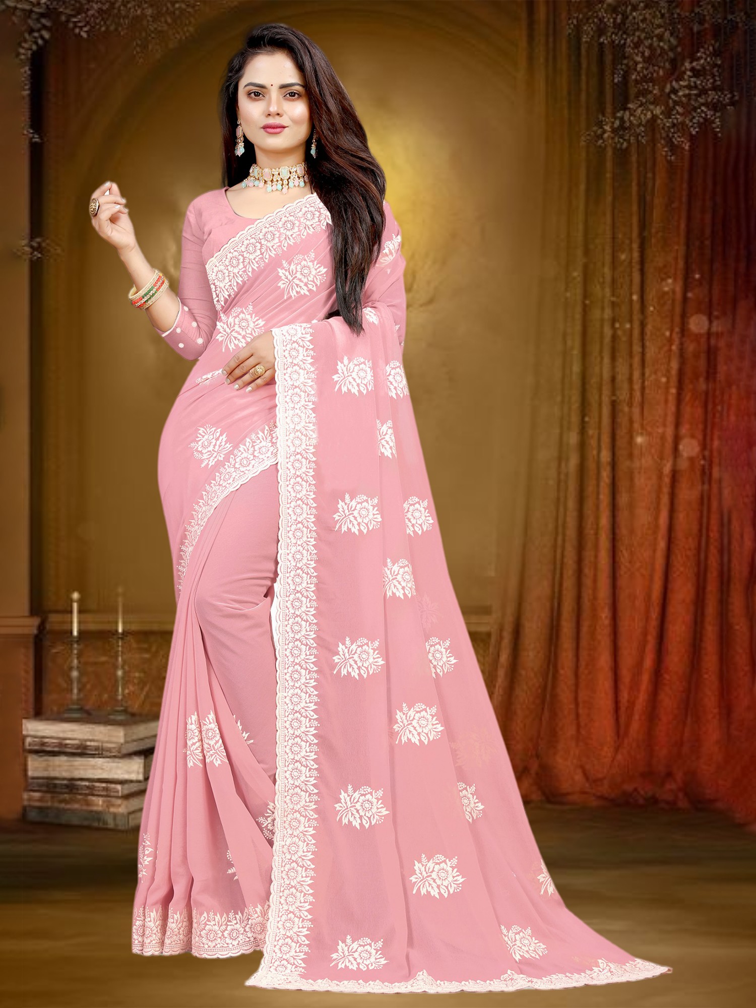 Apricot-Gelato Floral Aari Embroidered Georgette Saree from Kashmir