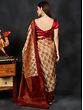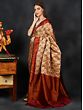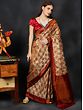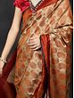 The ever-green romance of the paisley motif with traditional Indian women’s wear is trusted by the weavers of this pure chiffon Banarasi saree, to bring to you fashionable ethnic Indian attire. The striking border of the sari is adorned with a herringbone pattern, whose modern appearance is balanced by the lyrically woven paisley or aamra motif on the entirety of the body. Against the soft background, the paisley motif blooms in its auspicious glory, making this sari an artistically rich wearable.