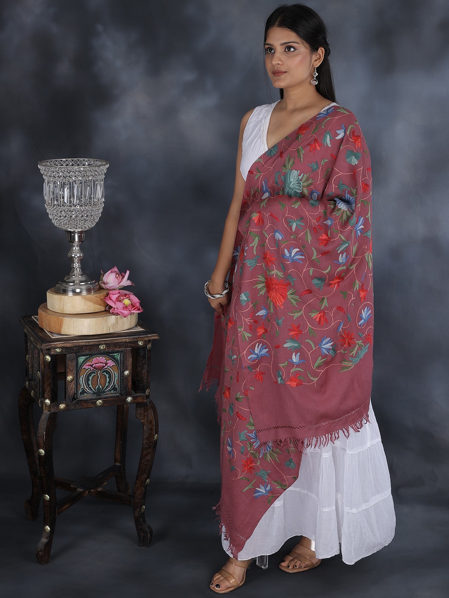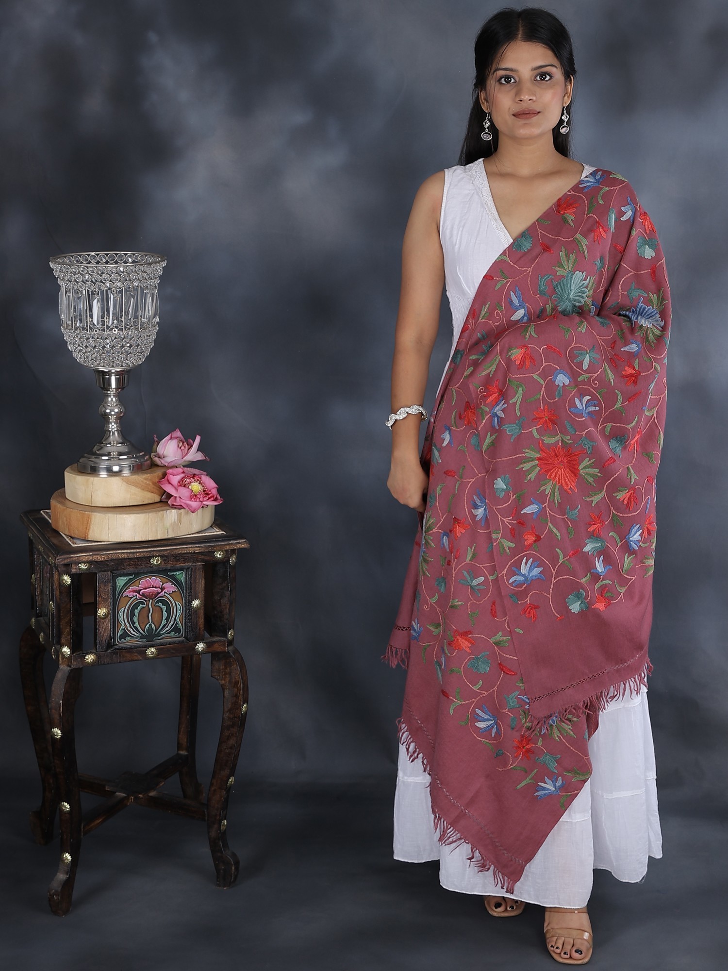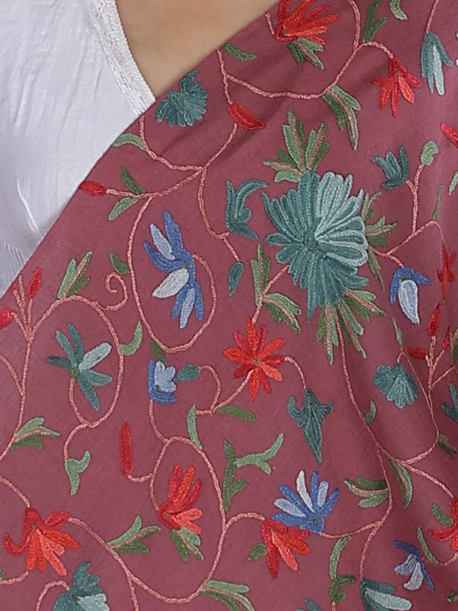 Every woman has a goddess inside her that reflects confidence, elegance and drops of the beauty of heaven from her aura when she feels and looks beautiful from inside and out. This floral stole is ari embroidered in the valley of Kashmir and presents you with impeccable fashion that you can lay whenever you want the goddess inside you to shine through. The floral embroidery spreads through the entire layout of the gorgeous piece in bright red, yellow, orange and green leaves. This stunning wrap is a must-have this chilly season for you to bat the weather in the right fashionable way. A classic gift that is perfect for anyone with fine taste in accessories, this stole makes for the best miracle to feel luxurious, feminine and royal in. Handcrafted to perfection, this piece can turn heads wherever you go, no questions asked. Every inch of this delicate piece makes for an awe-striking moment on any occasion.