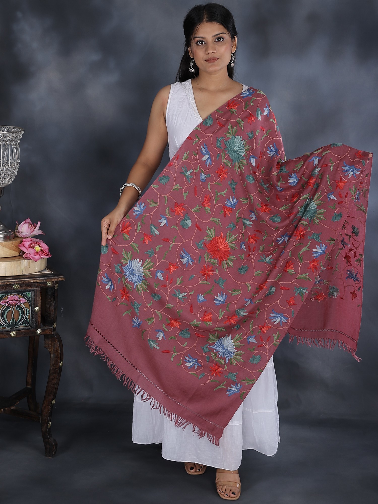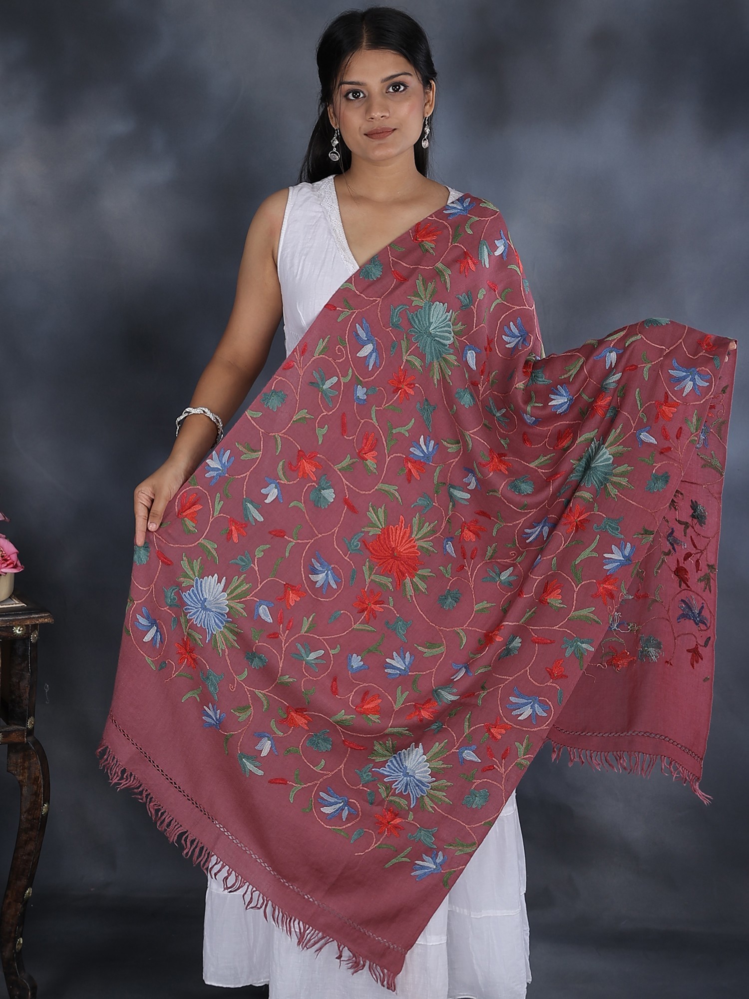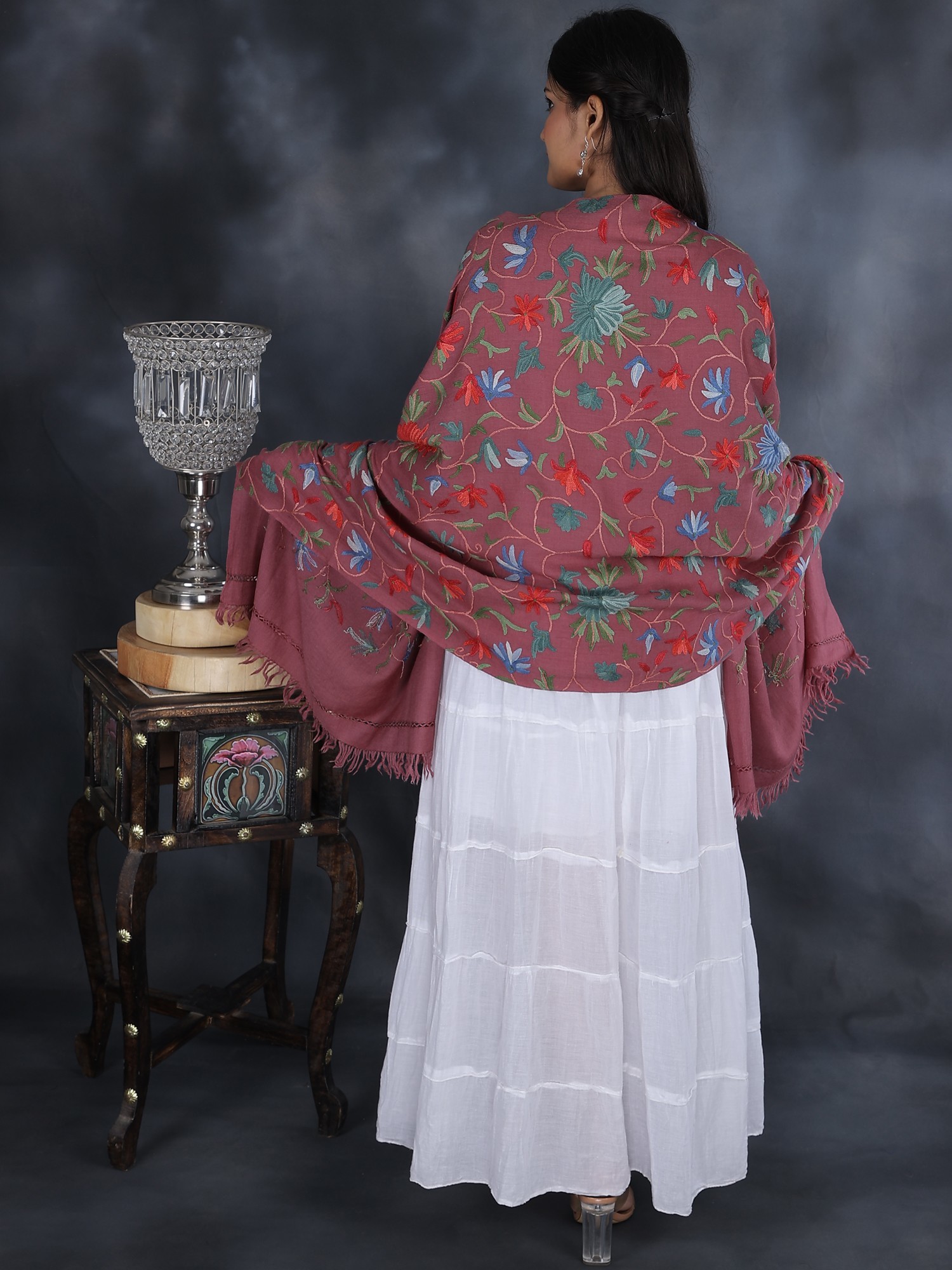 Every woman has a goddess inside her that reflects confidence, elegance and drops of the beauty of heaven from her aura when she feels and looks beautiful from inside and out. This floral stole is ari embroidered in the valley of Kashmir and presents you with impeccable fashion that you can lay whenever you want the goddess inside you to shine through. The floral embroidery spreads through the entire layout of the gorgeous piece in bright red, yellow, orange and green leaves. This stunning wrap is a must-have this chilly season for you to bat the weather in the right fashionable way. A classic gift that is perfect for anyone with fine taste in accessories, this stole makes for the best miracle to feel luxurious, feminine and royal in. Handcrafted to perfection, this piece can turn heads wherever you go, no questions asked. Every inch of this delicate piece makes for an awe-striking moment on any occasion.