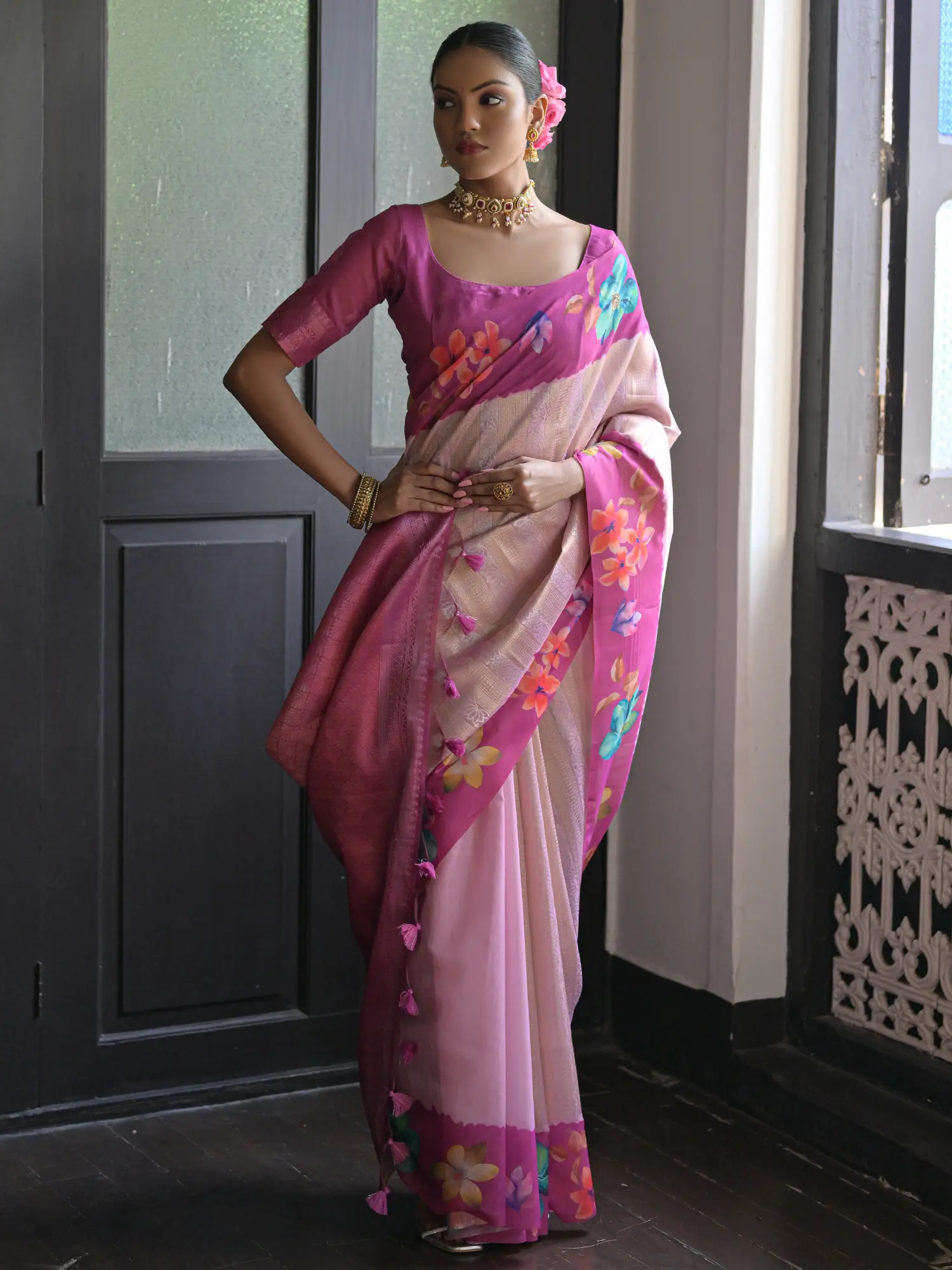 Maritime-Blue Modal Silk Printed Saree with Floral Vine Border from Madhya Pradesh