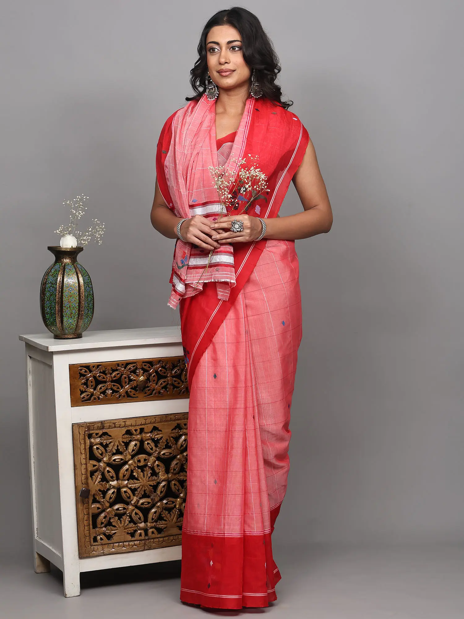 The body of the saree is adorned with a subtle yet sophisticated woven graph check pattern, created with fine threads that offer a delightful texture and visual depth. This intricate design provides a contemporary flair while honoring the heritage of handloom weaving. Scattered across the fabric are delicate diamond motifs, adding a touch of understated sparkle.