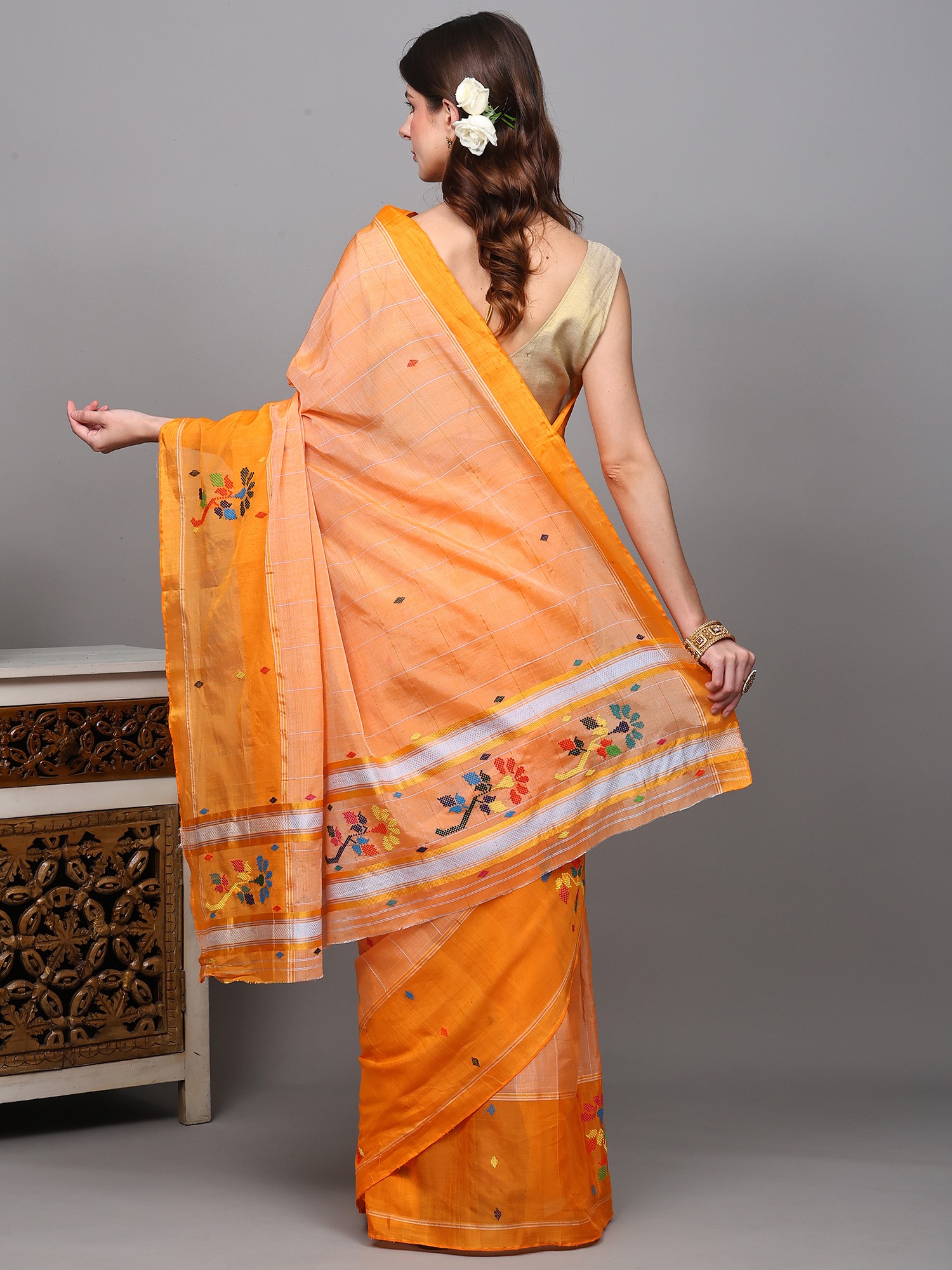The true artistry of this saree comes alive in its wide border and pallu, where a stunning floral "chedi butta" motif takes center stage. This traditional embroidery, rendered in a palette of vibrant blues, greens, reds, and yellows, features stylized floral and bird-like designs. Each stitch is a brushstroke of color, bringing a lively and whimsical charm to the ensemble. The meticulous craftsmanship ensures that these motifs are not just decorative but tell a story of skilled artisans and their dedication to preserving ancient techniques.