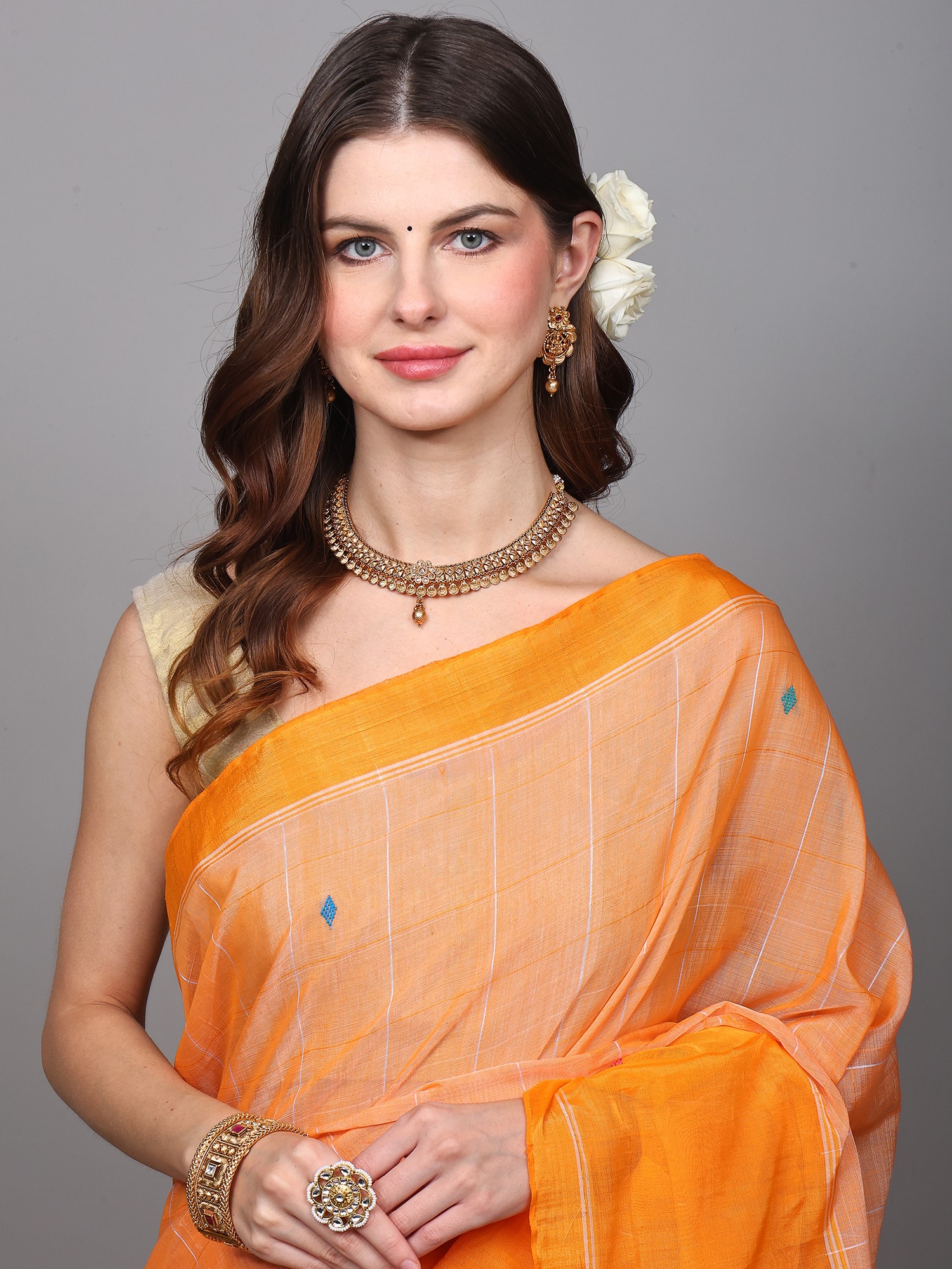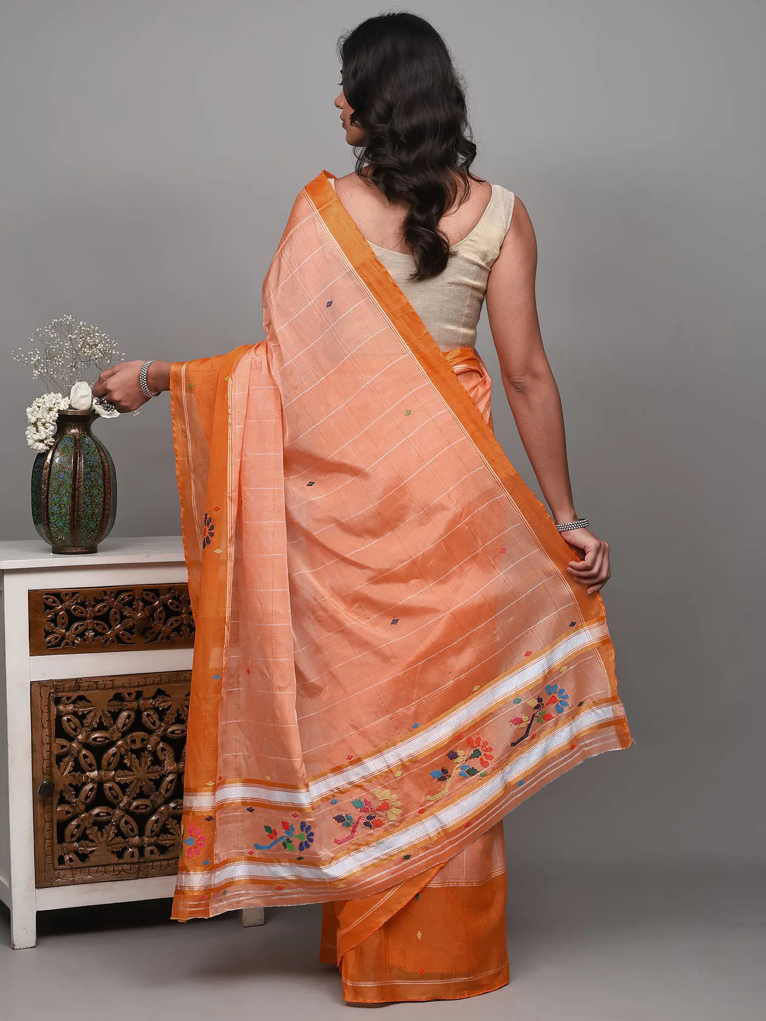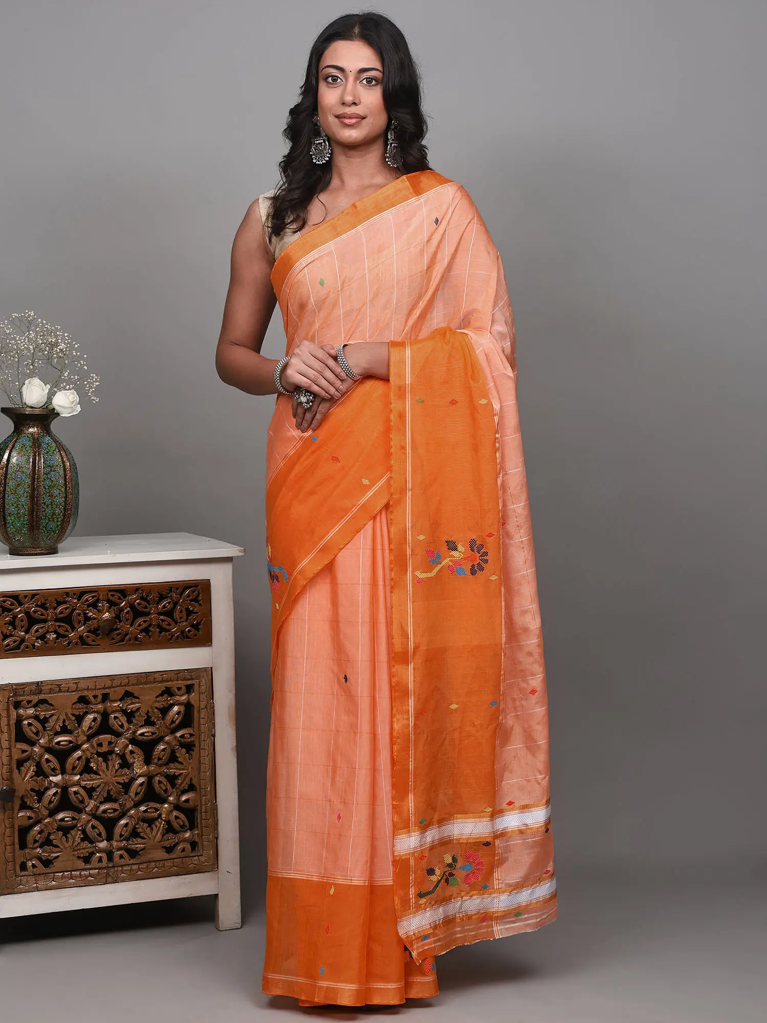 Drape yourself in the vibrant elegance of this exquisite saree, a testament to the rich weaving traditions of Tamil Nadu. The captivating coral orange hue evokes the warmth of sunshine and the joy of festivity, making it a perfect choice for special occasions or when you simply want to radiate confidence and charm.