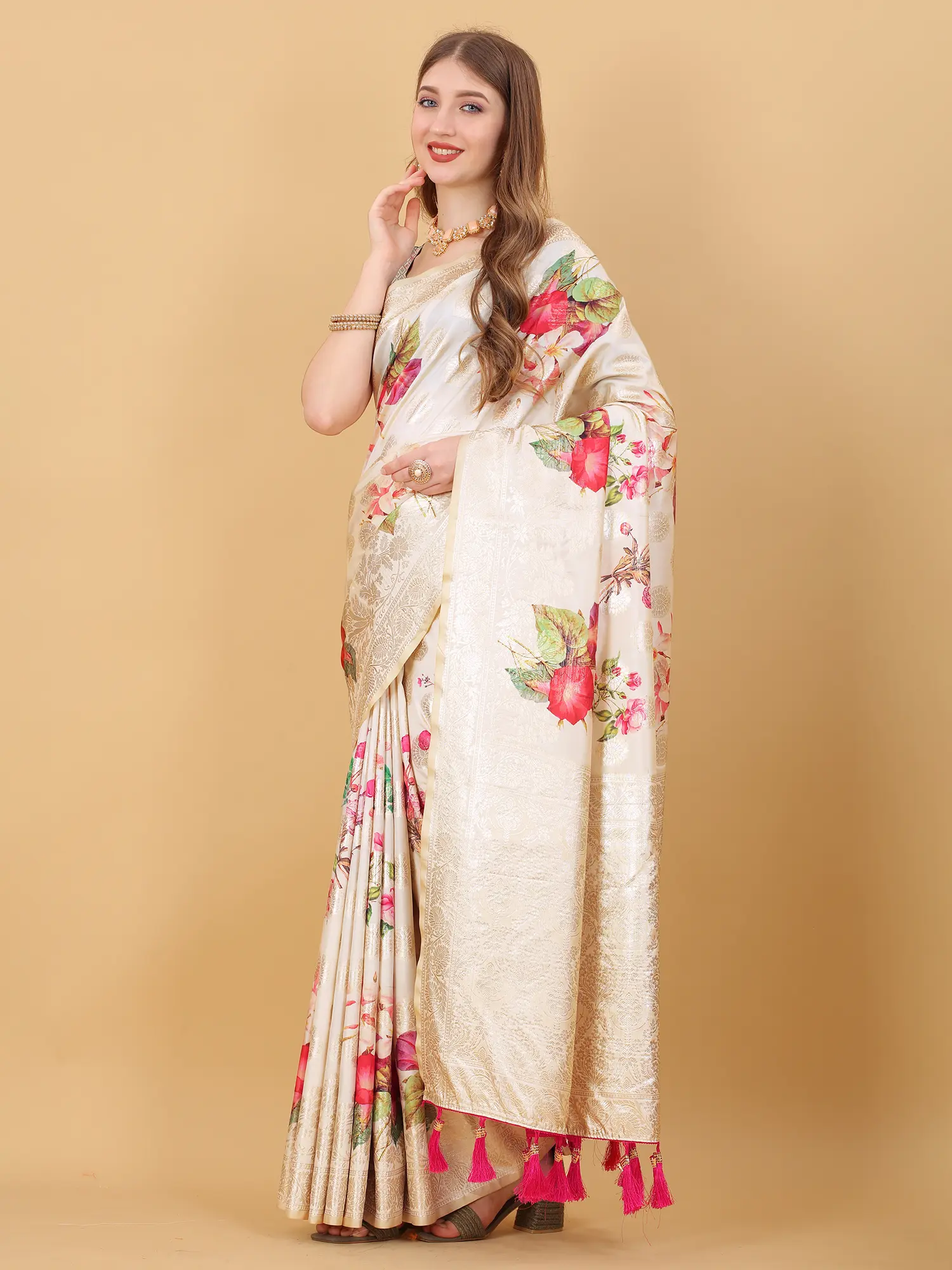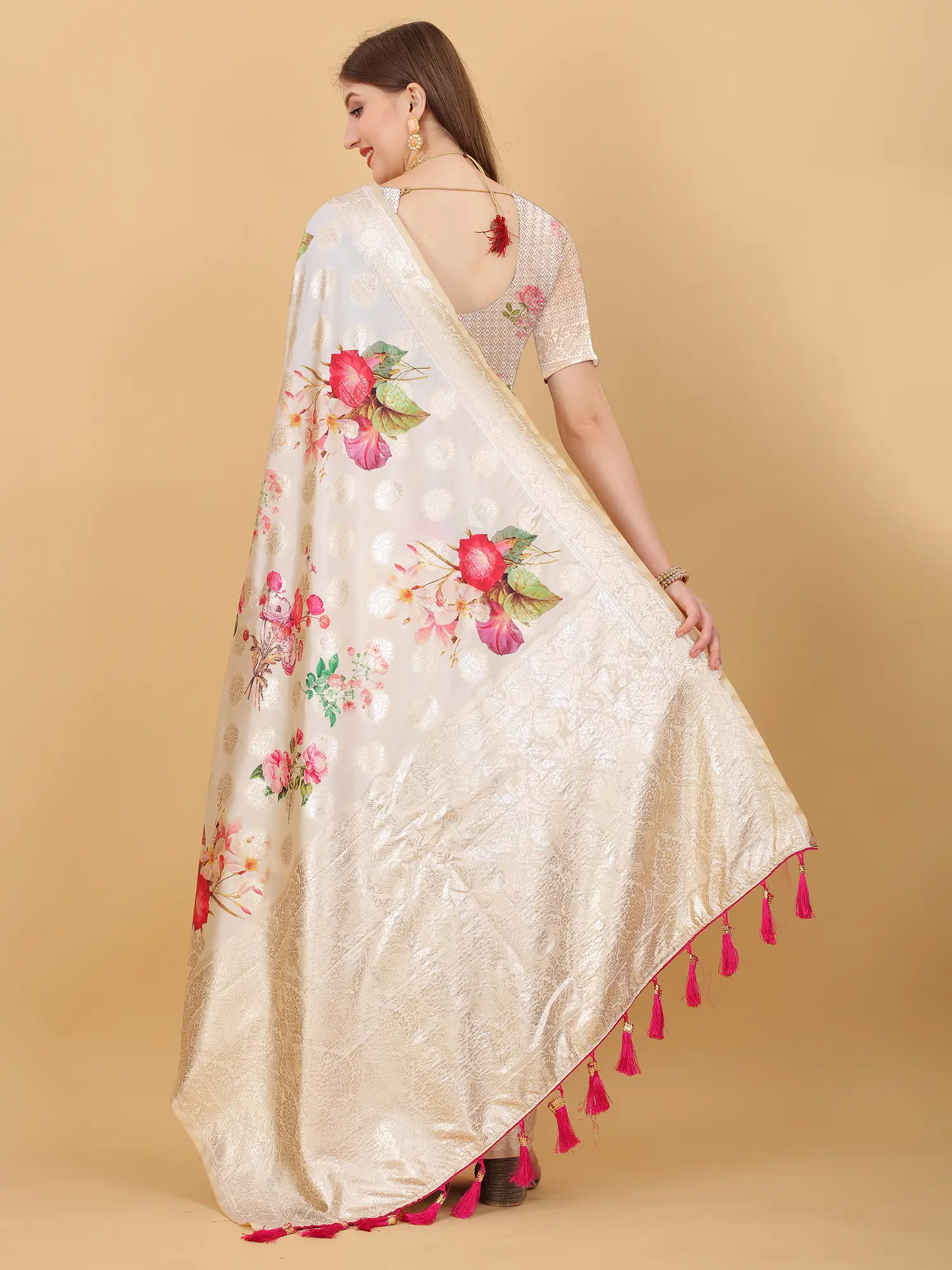 The saree is completed with a stylish tassels pallu, adding a playful and contemporary touch to the traditional design. The tassels sway gently as you move, adding a dynamic element to your overall look. The carefully chosen colors of the tassels complement the floral print and Zari work, creating a harmonious and balanced aesthetic. To complete your ensemble, the saree can be paired with a tailor-made blouse and underskirt, custom-fitted to your size. This ensures a perfect and flattering fit, allowing you to showcase the saree's beauty to its fullest potential. The tailored blouse can be designed to complement the saree's colors and patterns, creating a cohesive and stunning outfit.