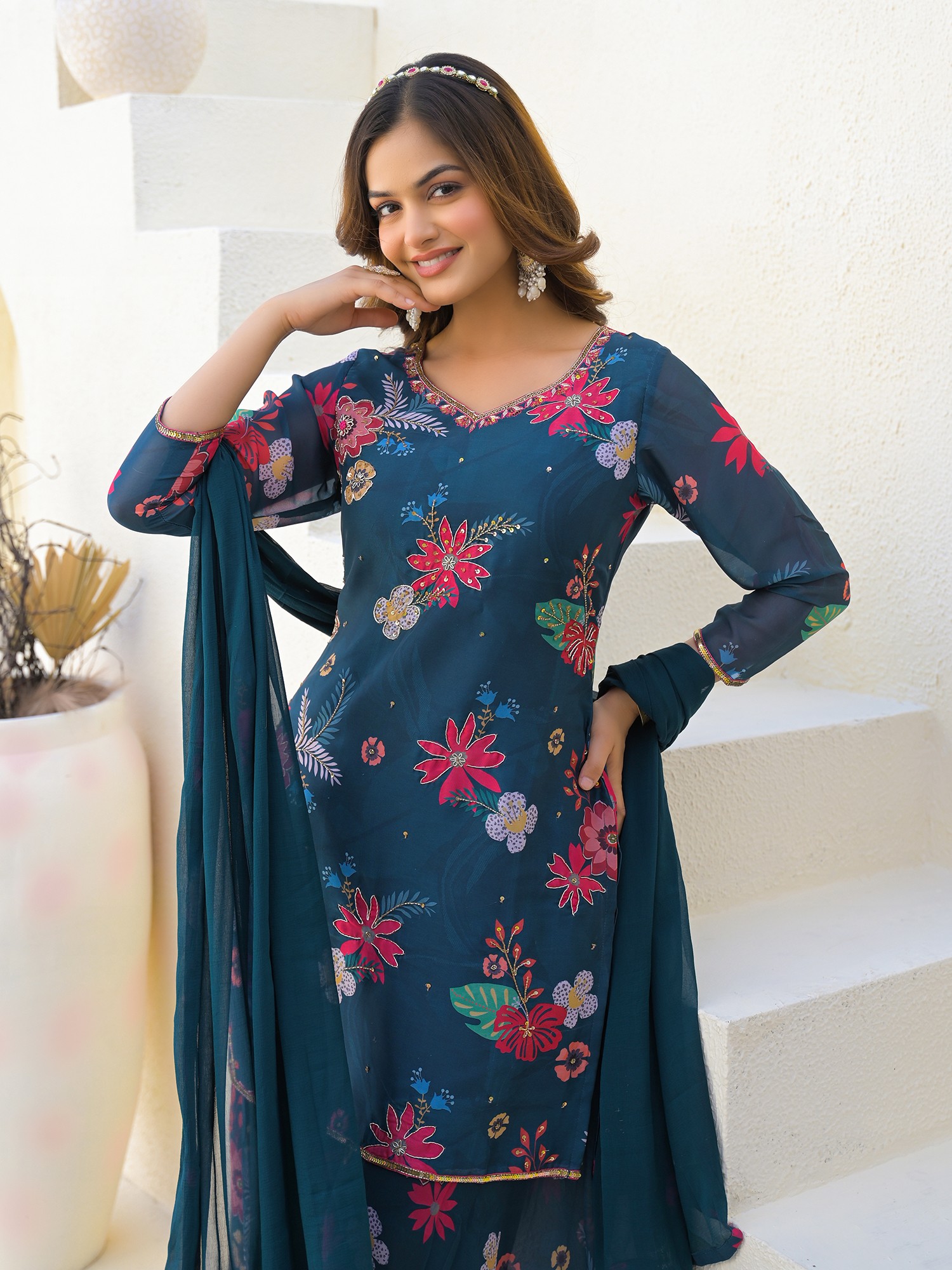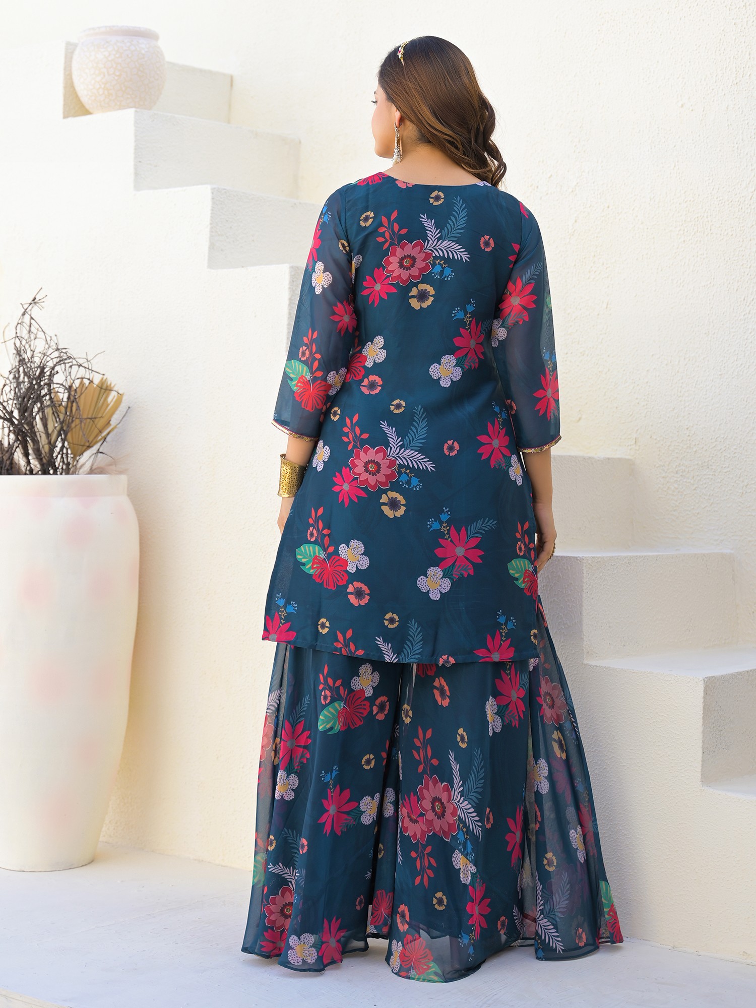 Attractive Sequins And Floral Digital Print Georgette Festive Wear Kurti Sharara Set With Dupatta