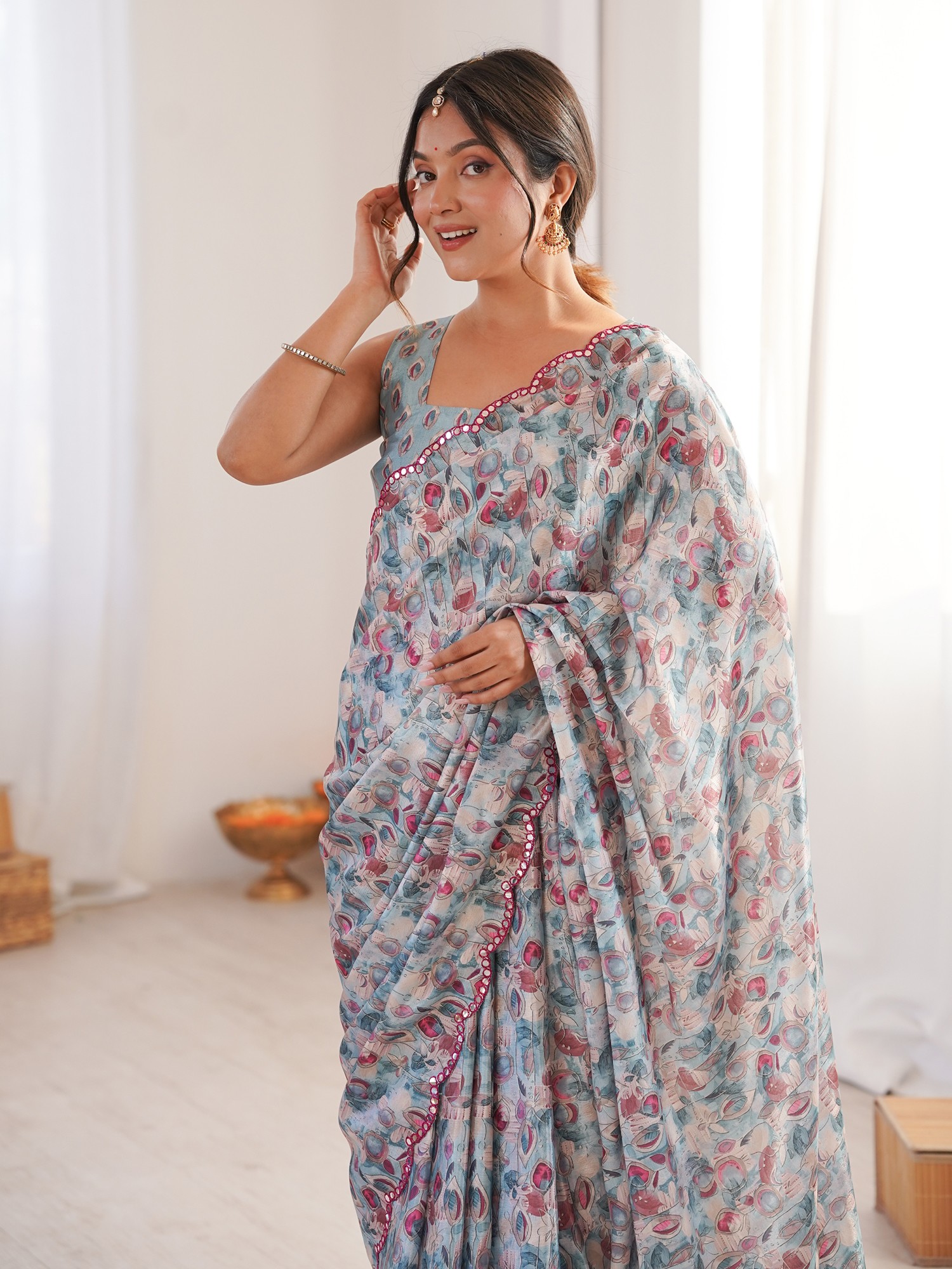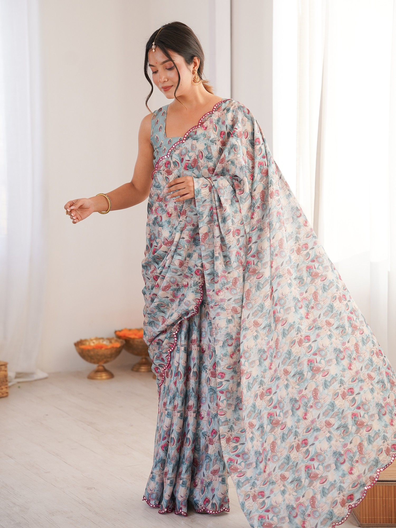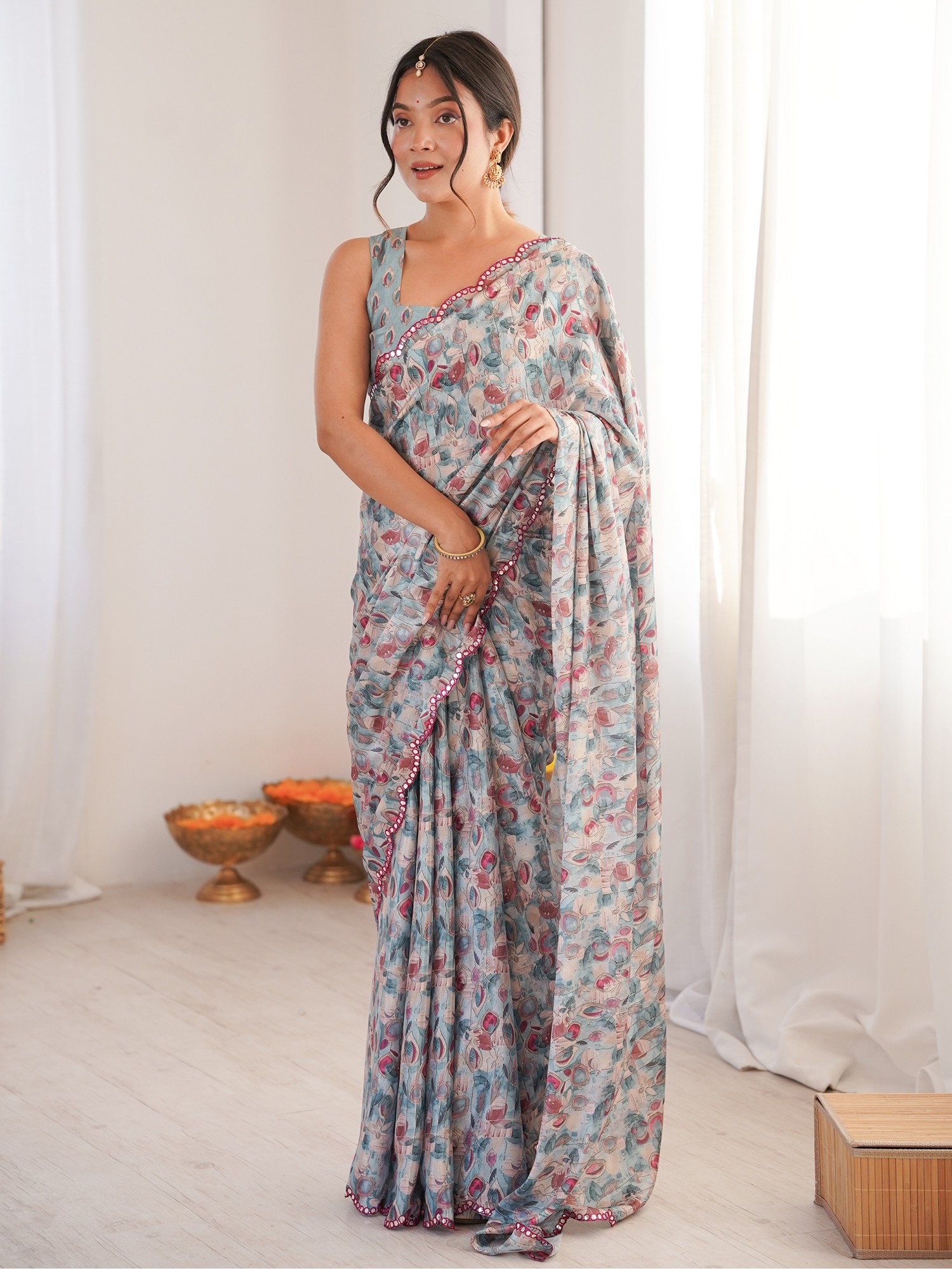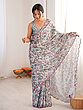 Floral Digital Print Chinon Saree With Mirror Cut Work Ideal For Party And Festive Occasions Elegant Traditional Saree For Women