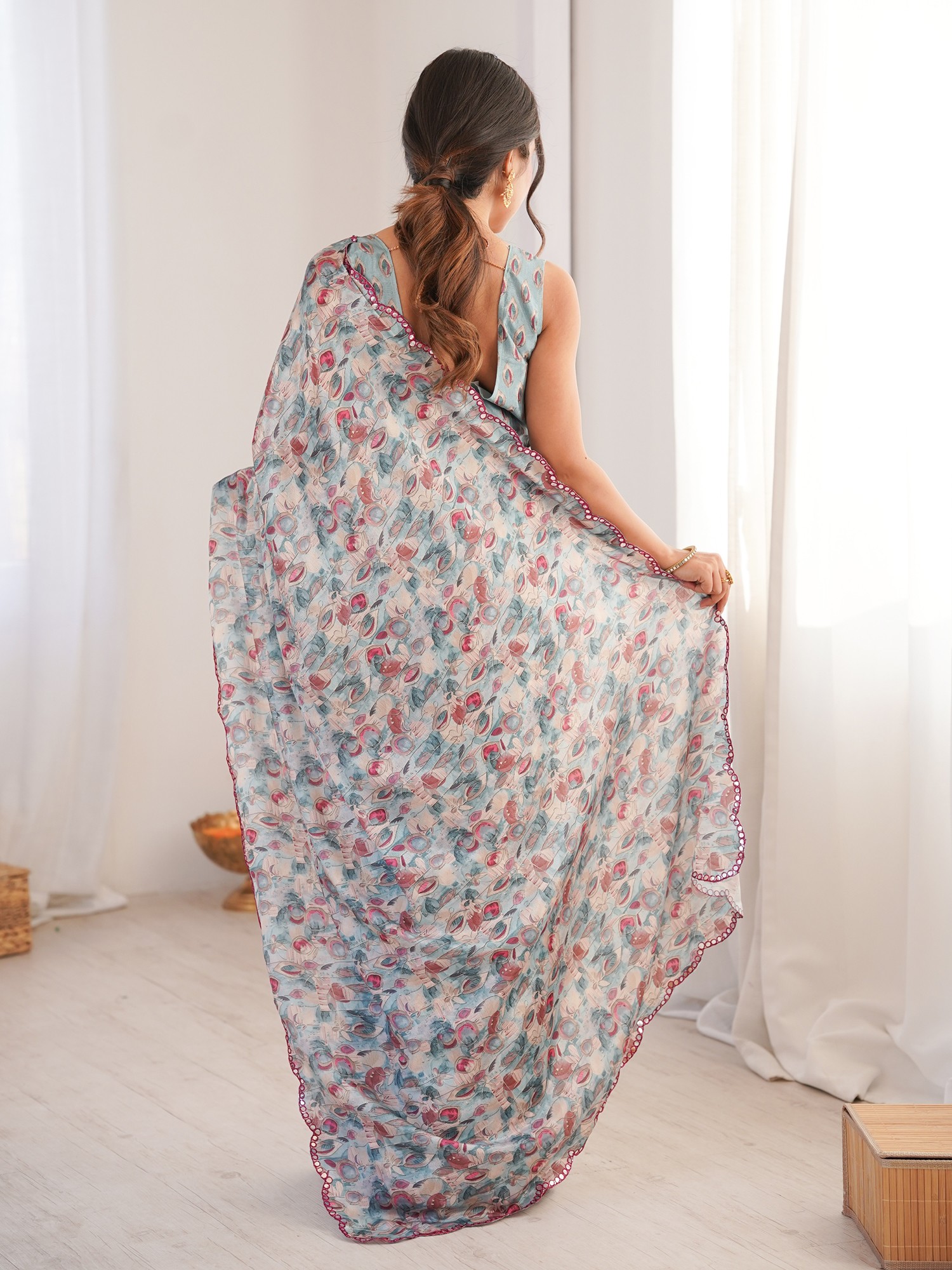 Designer Chinon Saree With Digital Print And Mirror Cut Work Elegant Festive Party Wear Traditional Saree For Women