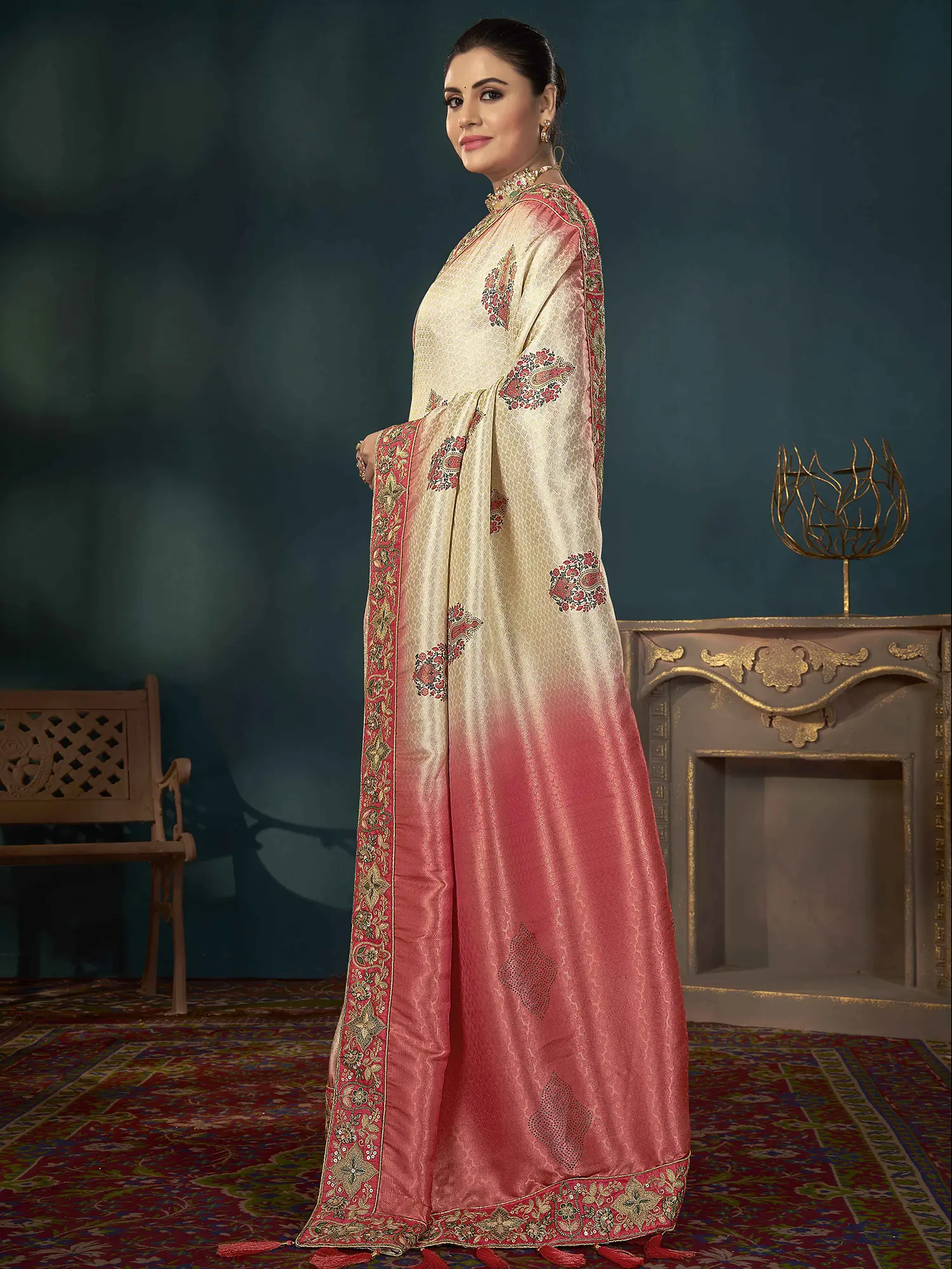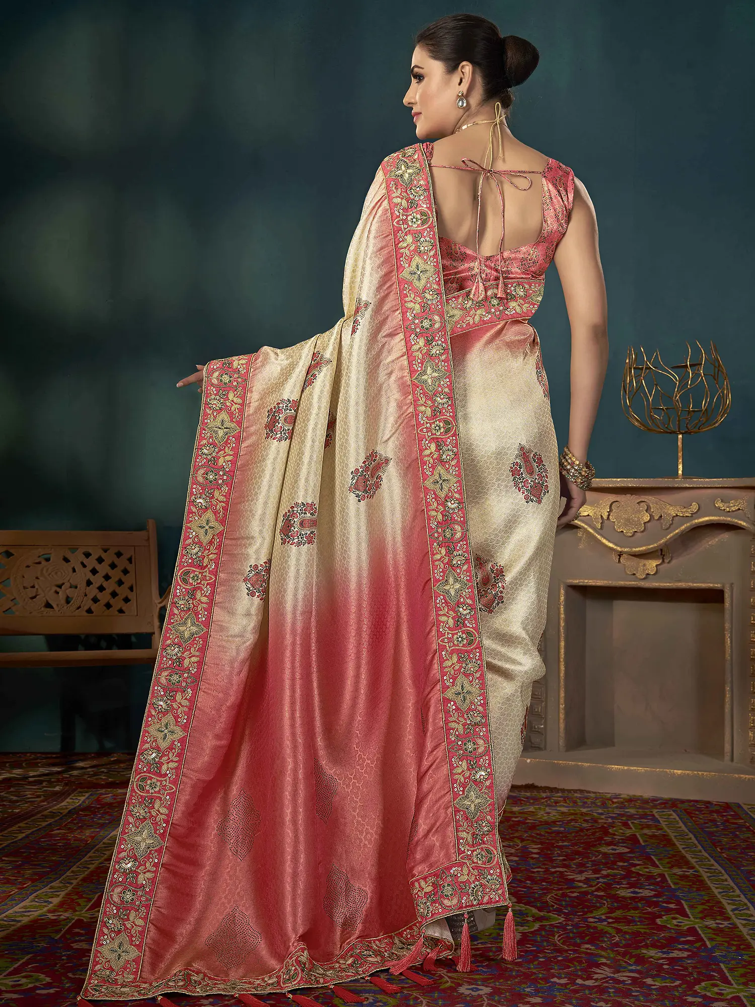 This Kanjivaram silk saree is designed to make you feel radiant and confident. The carefully selected silk ensures it drapes impeccably, while the intricate floral digital print and embroidery work add a touch of opulence. The striking contrast created by the rose pink gradient on the pallu, adorned with hand-tied tassels, provides a dramatic and elegant finish. This saree is perfect for those who appreciate the fusion of traditional techniques with contemporary aesthetics, offering a unique and memorable addition to your ethnic wear collection. Its beauty lies in the details, from the subtle sheen of the silk to the meticulous handwork that brings the floral patterns to life.