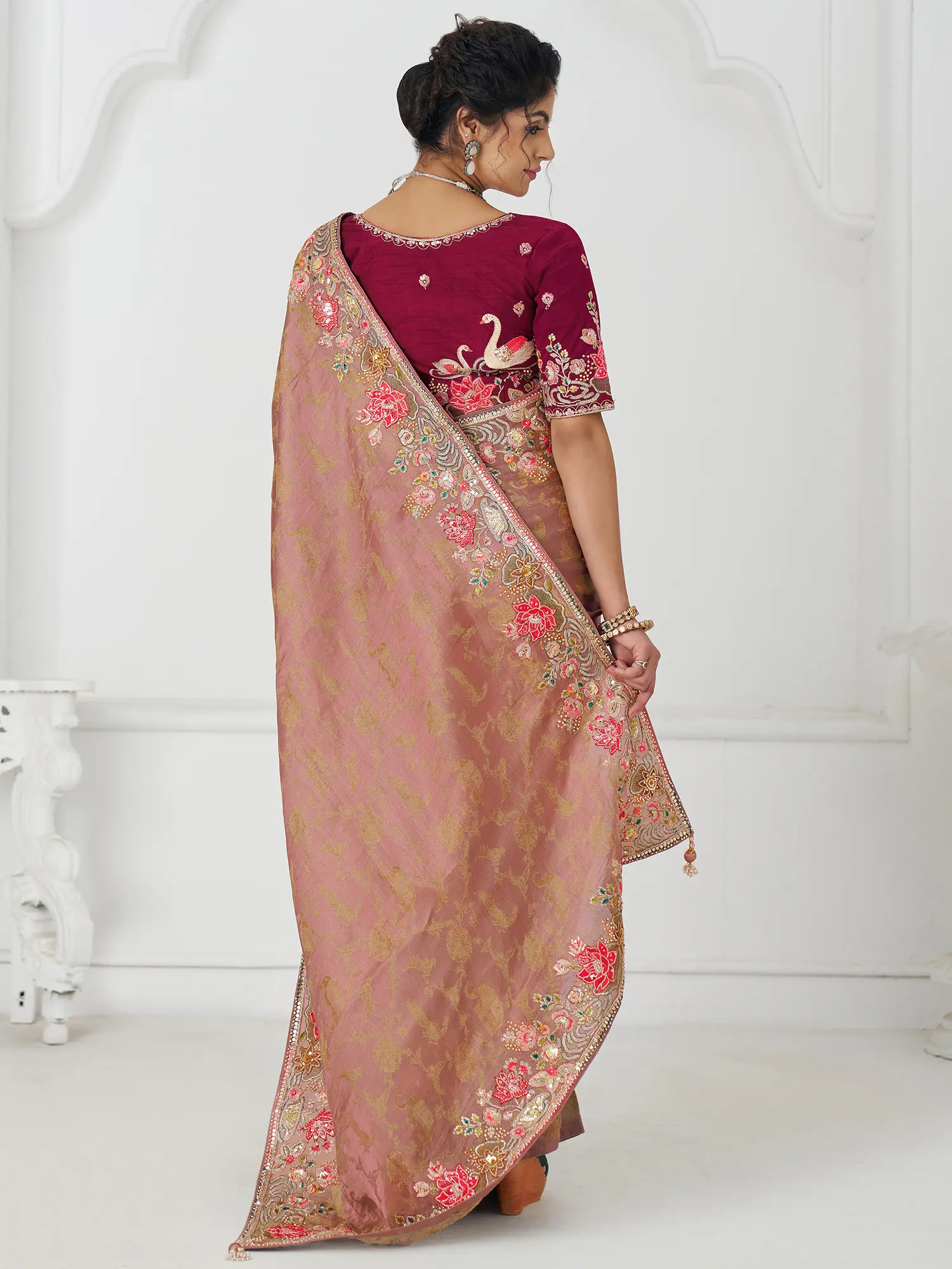 Step into a world of timeless beauty with this stunning saree, a harmonious blend of traditional craftsmanship and contemporary design. The delicate floral embroidery adorning the fabric showcases intricate artistry, creating a captivating visual appeal. Sparkling sequins add a touch of glamour, catching the light with every movement. This is more than just a garment; it's a statement of refined taste and enduring style.