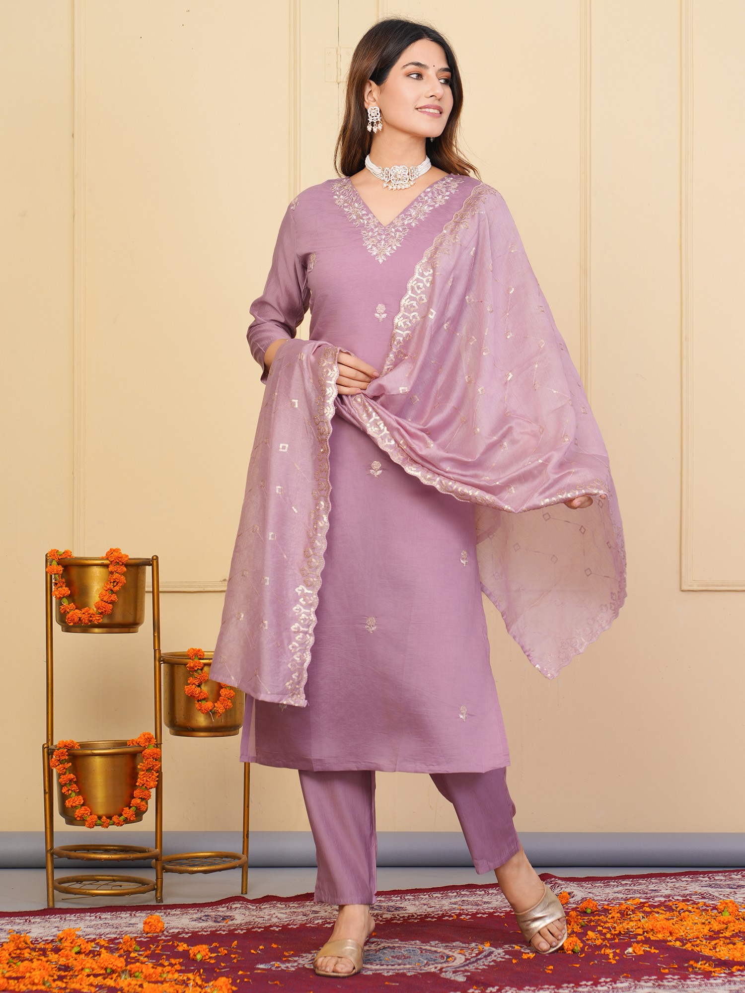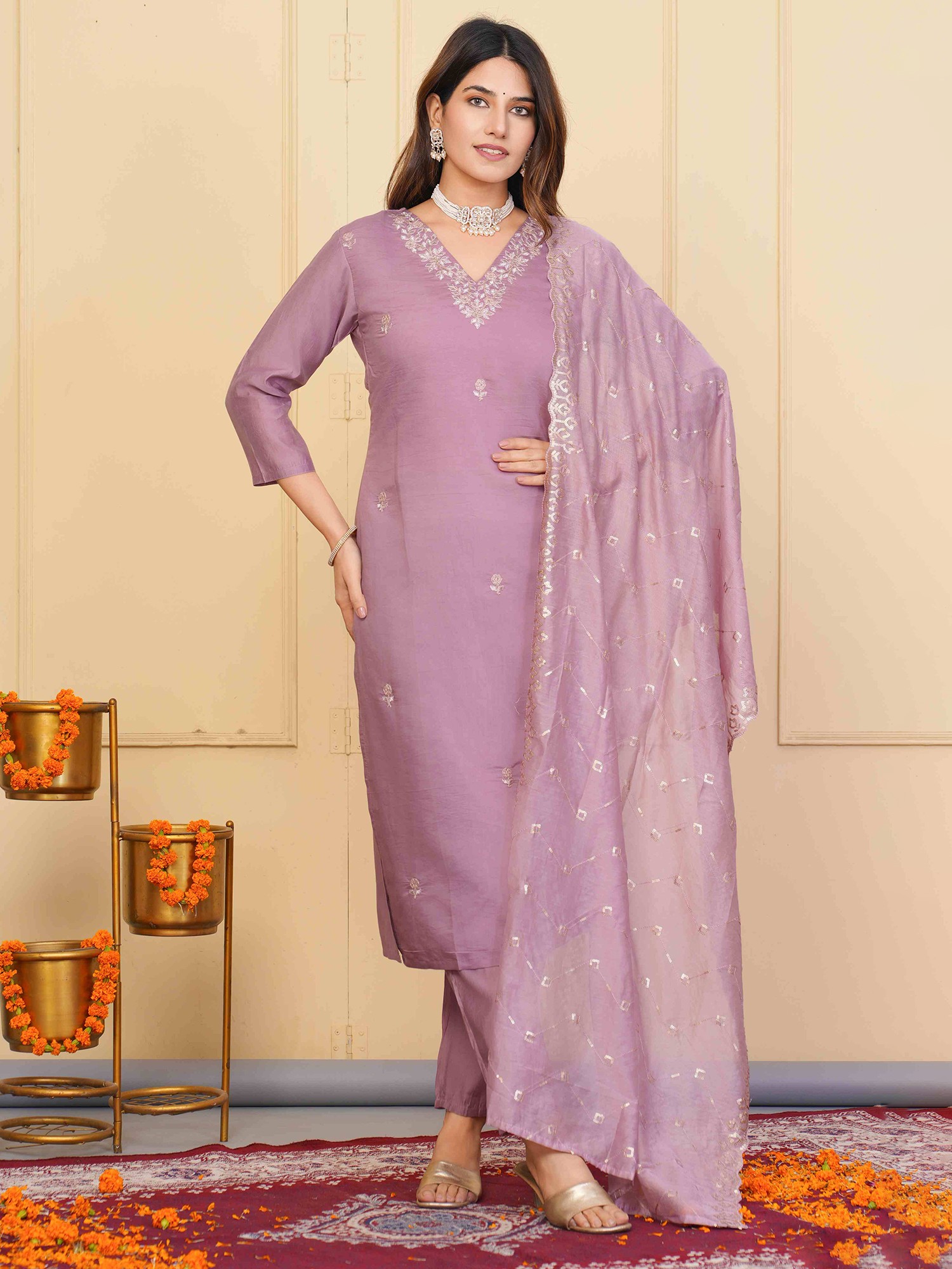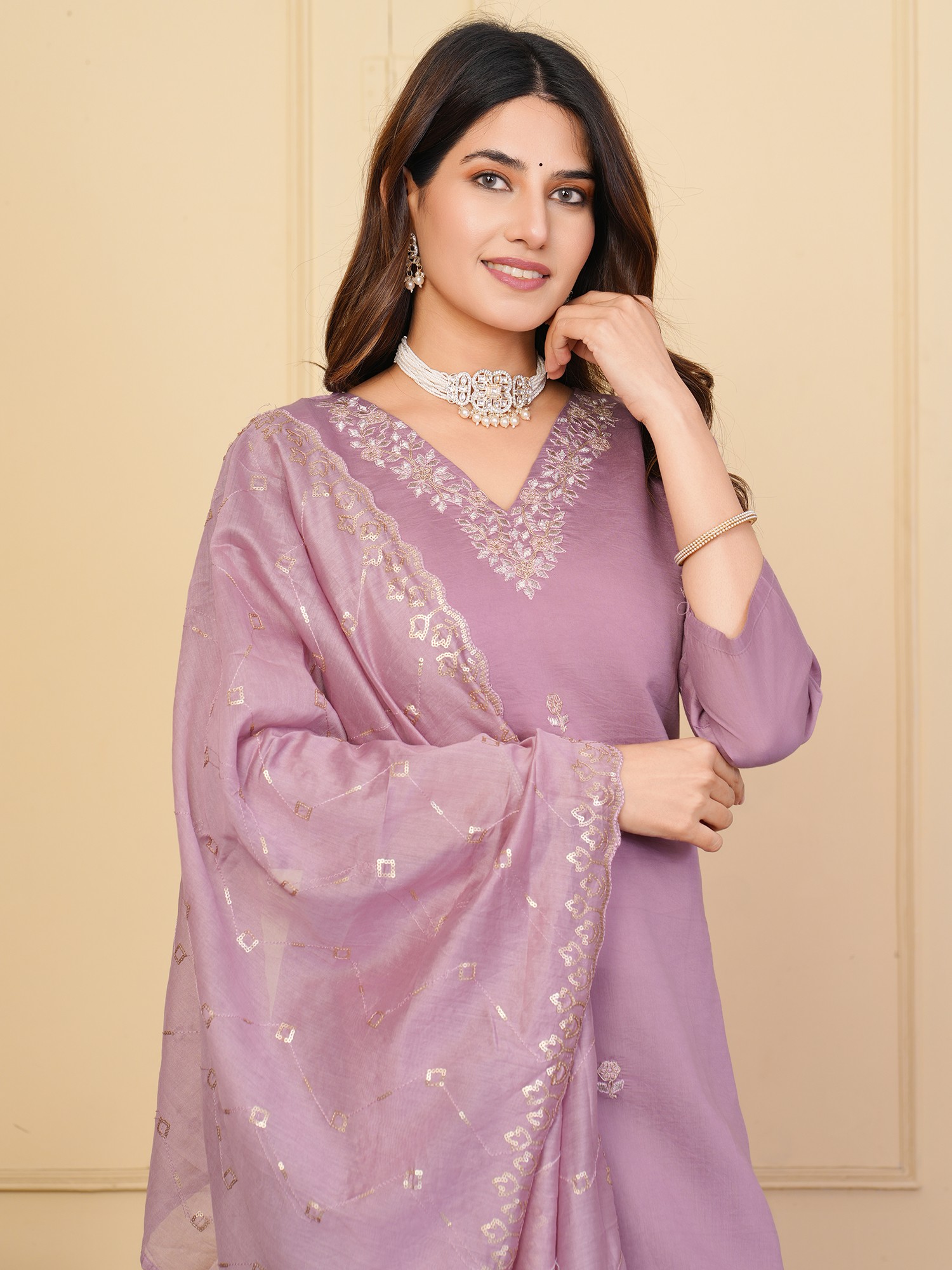 Indulge in the rich tapestry of tradition and contemporary style with this captivating Salwar Kameez. Designed for the woman who appreciates the finer things in life, this ensemble is more than just an outfit; it's a statement of grace and sophistication. The soft, muted shade of the fabric lends an air of understated elegance, making it perfect for festive occasions and special gatherings. The intricate floral embroidery delicately adorns the neckline and various other parts of the kameez. This embellishment adds a touch of timeless charm, elevating the overall aesthetic to new heights. The detailed craftsmanship speaks volumes about the care and attention that has gone into creating this exquisite piece.