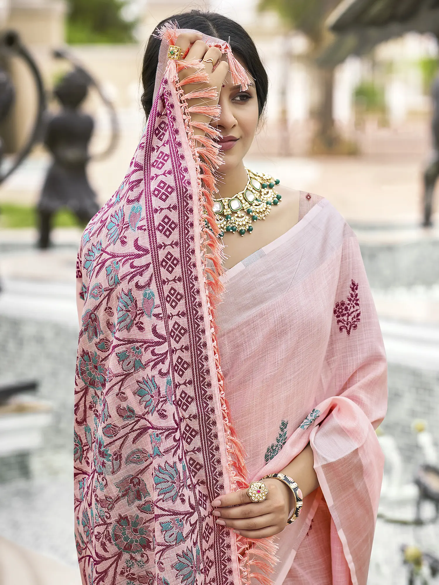 Woven from premium quality linen, this saree promises exceptional comfort and breathability, making it an ideal choice for prolonged wear. The natural texture of linen lends a subtle richness and an airy feel, ensuring you stay cool and graceful throughout the day. The fabric drapes beautifully, accentuating your silhouette with its natural flow. This versatility extends to its styling potential; it is equally at home at festive gatherings, radiating a festive yet refined charm, or at the office, exuding a polished and professional demeanor. For everyday wear, it offers a touch of everyday luxury, elevating your casual ensemble with its timeless appeal.