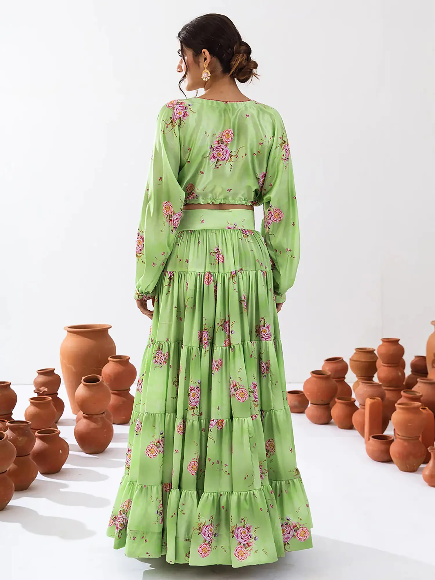 Carry a boho-chic vibe to the festive evenings with this designer chinon lehenga and top set.
