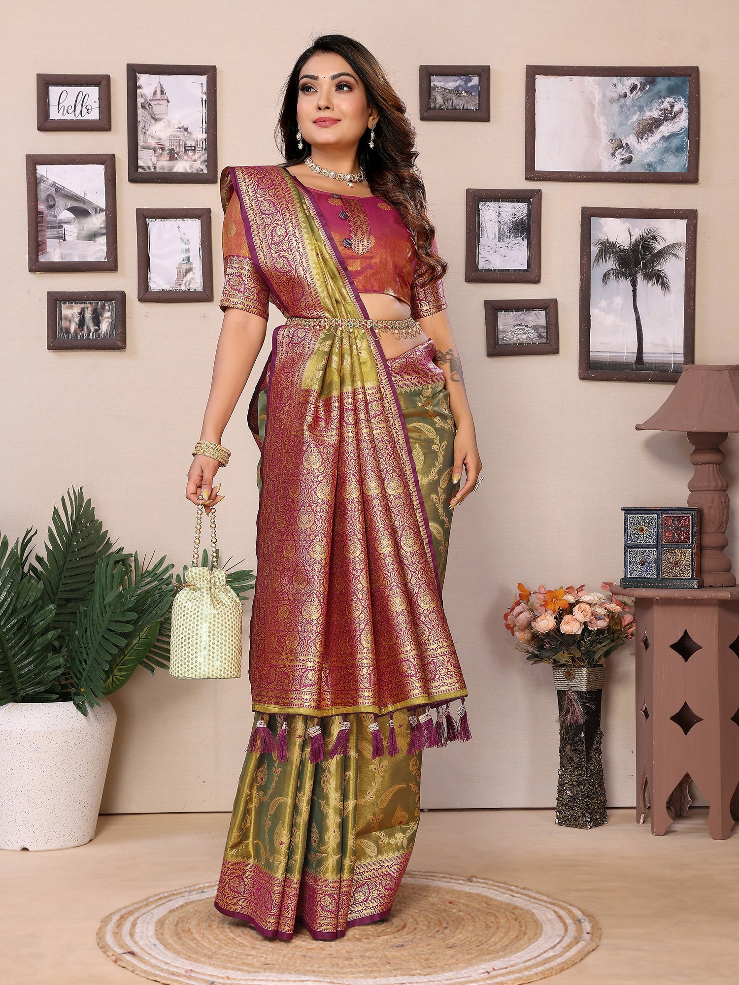 Traditional Woven Kanjivaram Silk Saree with Wide Border and Tassels Pallu