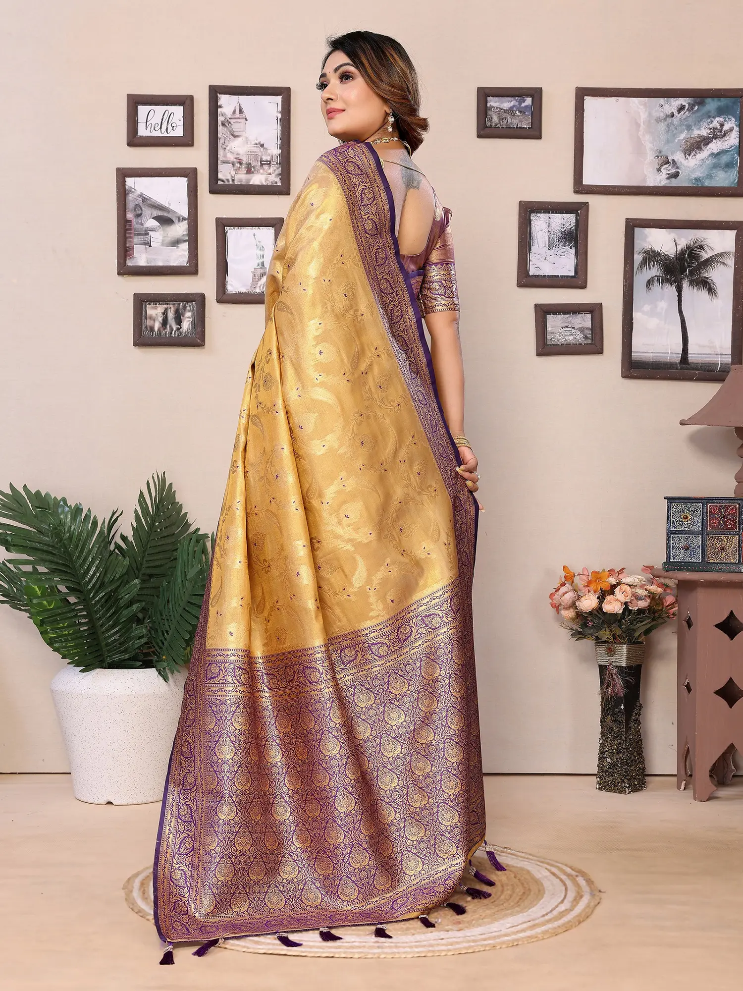 Discover a masterpiece of traditional Indian craftsmanship with this exquisite Tissue Silk Saree. Woven from the finest tissue silk, renowned for its delicate sheen and ethereal drape, this saree offers a luxurious and sophisticated addition to any festive wardrobe. The fabric itself whispers tales of opulence, catching the light with a subtle luminescence that is sure to turn heads.