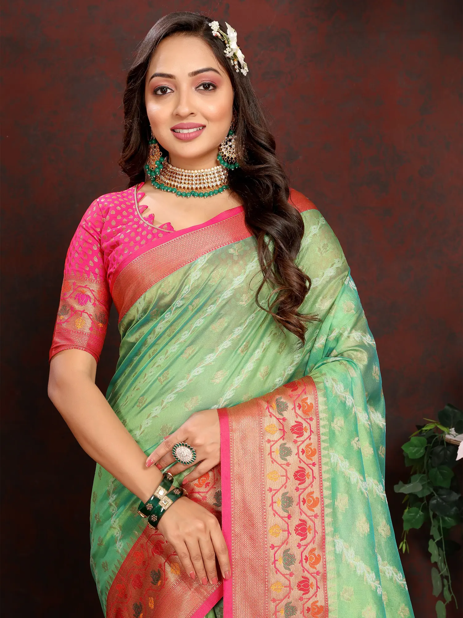 This saree is more than just an attire; it's an heirloom. The combination of the refreshing mint green and the striking fuchsia pink makes it a versatile choice for a multitude of occasions. Whether you are attending a wedding, a festive celebration, or a formal gathering, this saree is sure to make you stand out. Its luxurious silk texture drapes beautifully, accentuating your silhouette with effortless grace. The lustrous sheen of the silk catches the light, creating a mesmerizing glow that enhances its overall appeal.