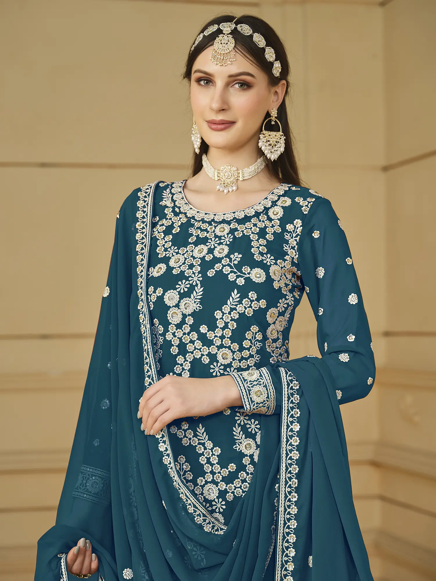 Beige and Green Trouser Salwar Kameez Suit with Embroidered Flowers and Crystals
